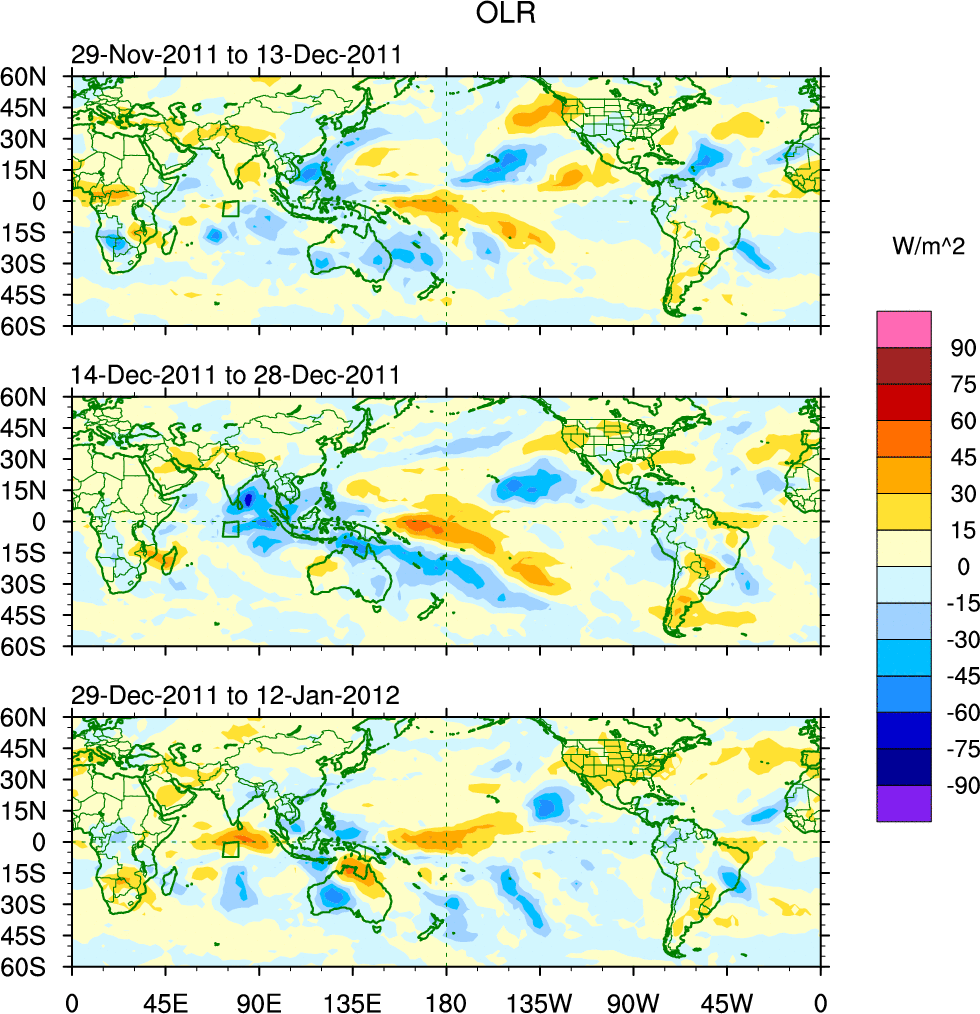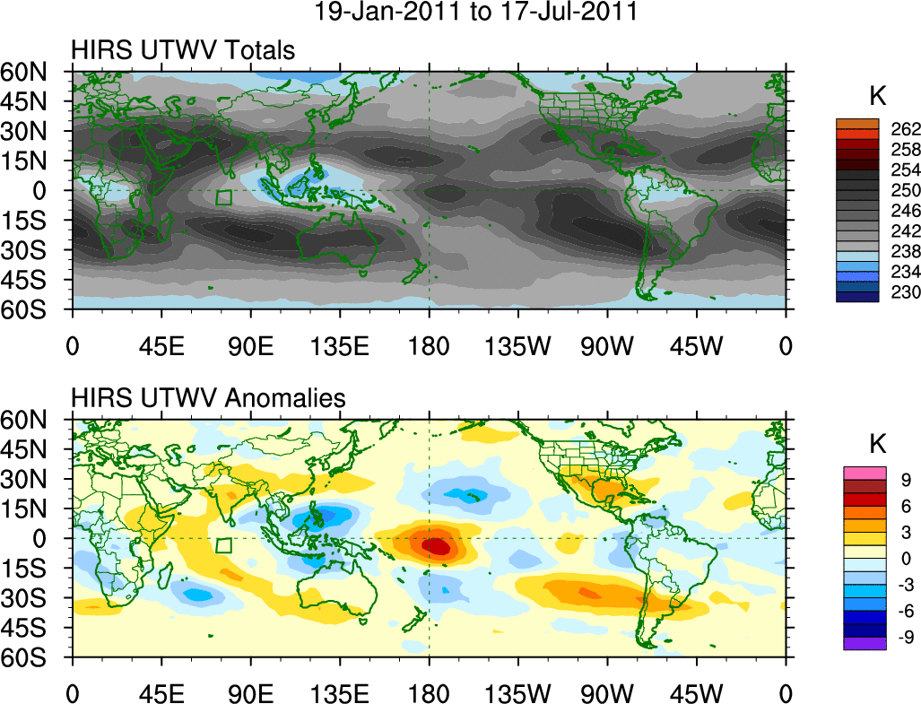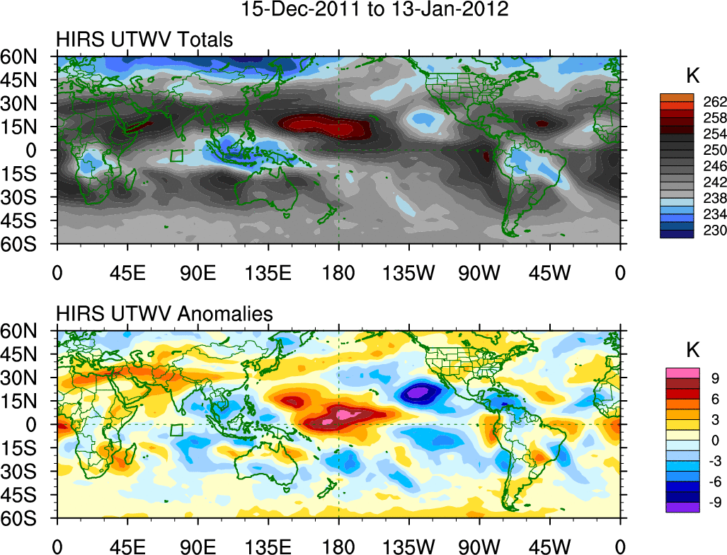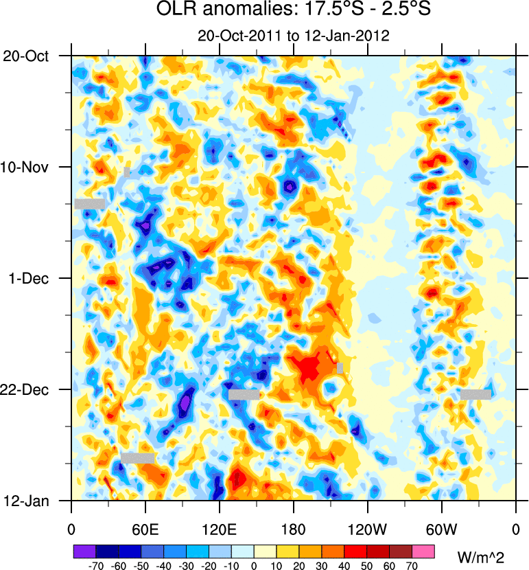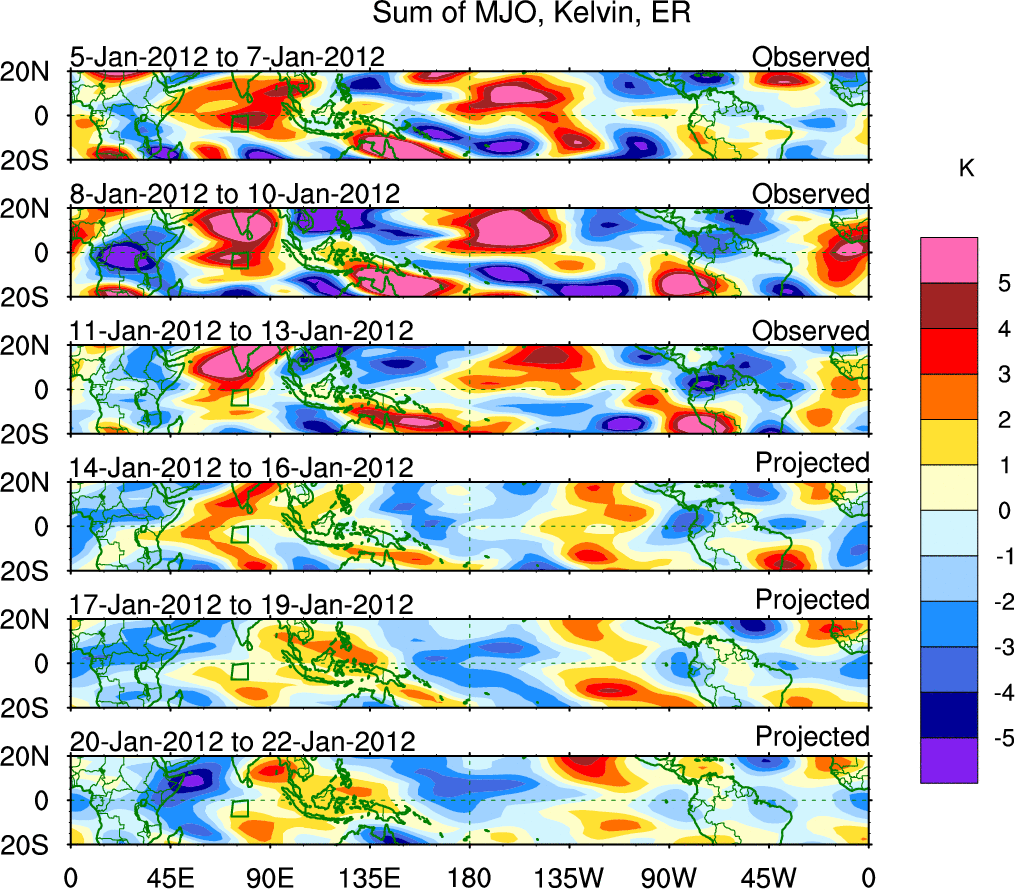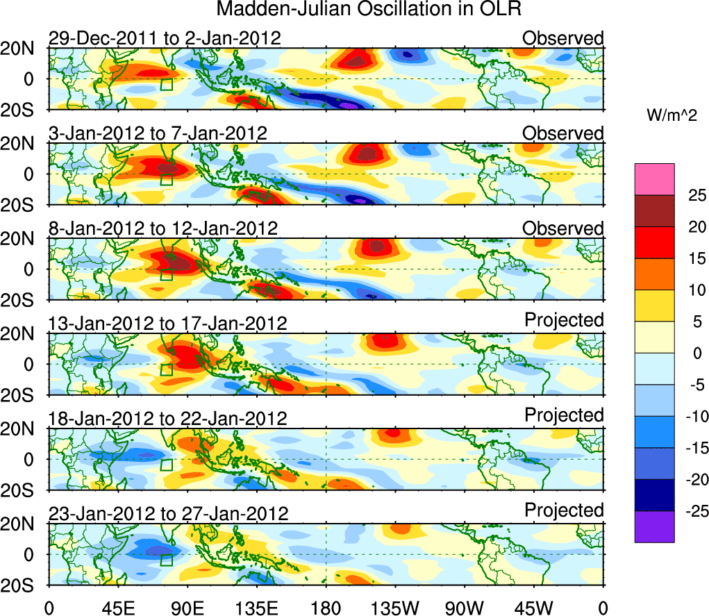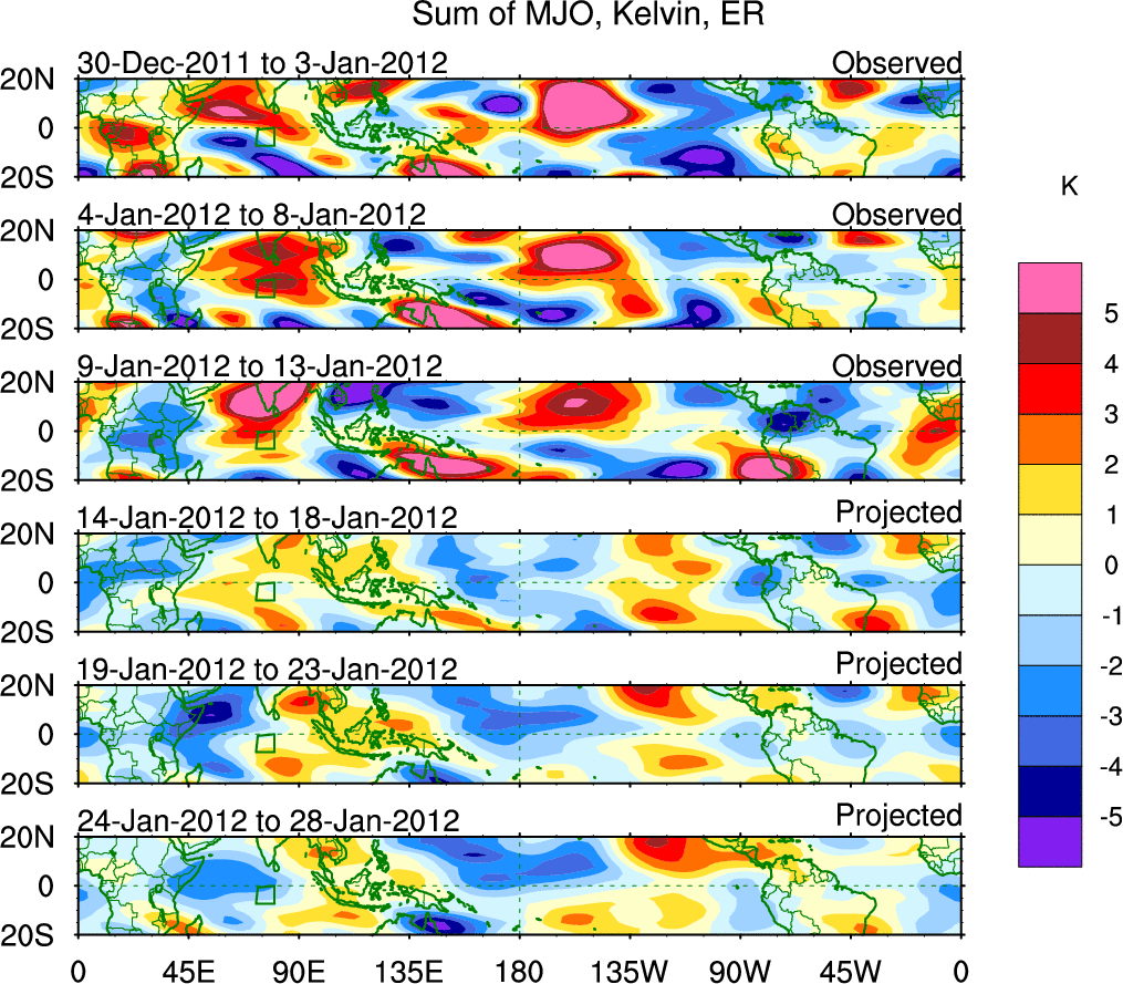 To identify tropical waves in near real-time, the OLR and UTWV data are filtered following Wheeler & Weickmann (2001 MWR). The daily anomalies are calculated using the first 3 harmonics of the seasonal cycle for 1979–2009. Missing values are then filled using linear interpolation in space and time. The most recent 365 days of anomalies are padded with 659 days of zeroes, and the result is filtered for each wave type.