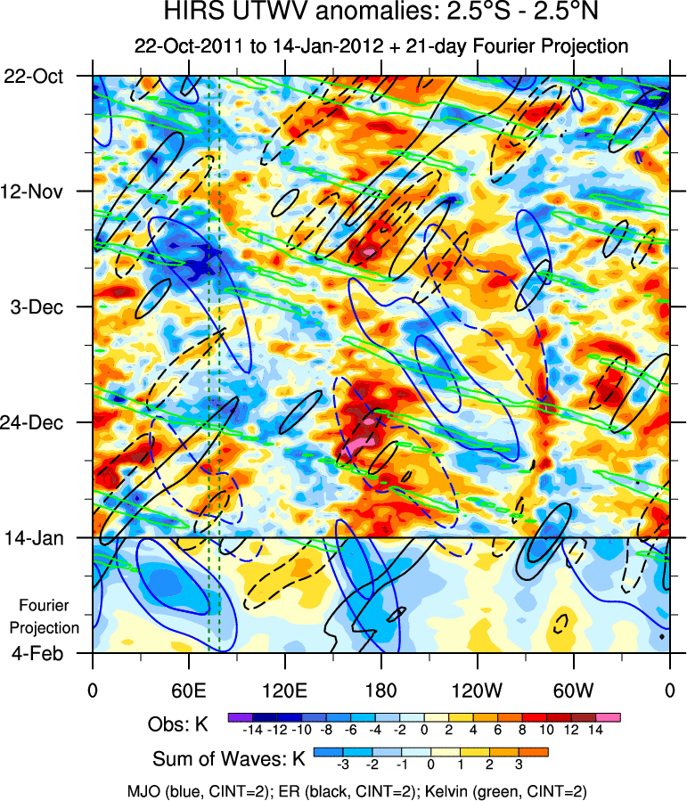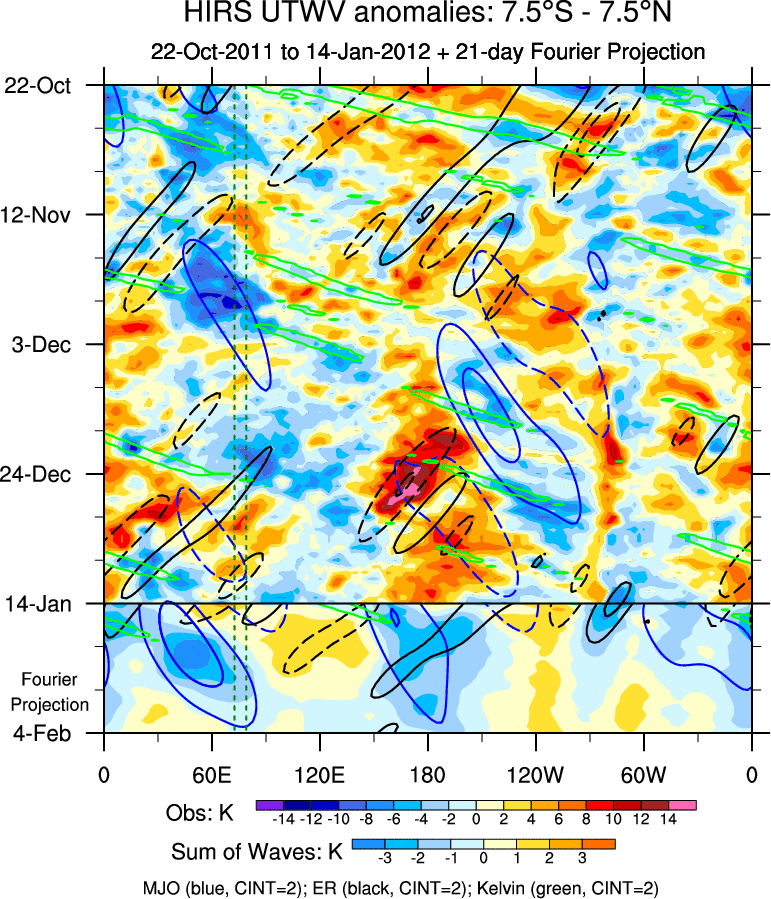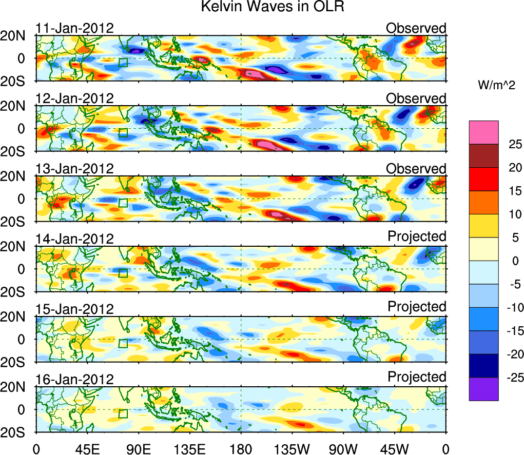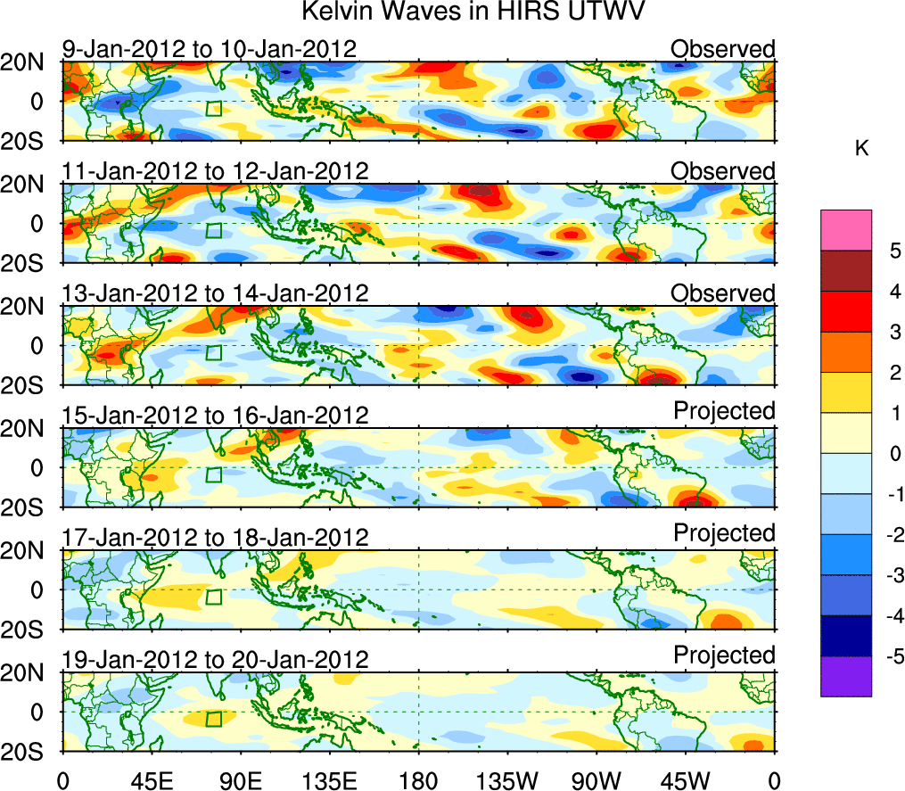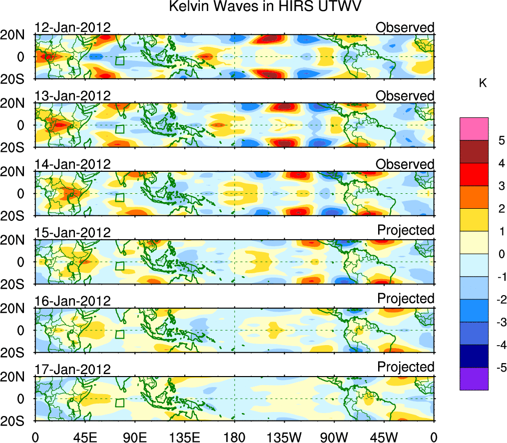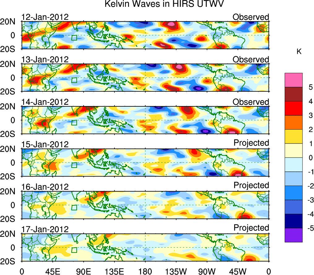 To identify tropical waves in near real-time, the OLR and UTWV data are filtered following Wheeler & Weickmann (2001 MWR). The daily anomalies are calculated using the first 3 harmonics of the seasonal cycle for 1979–2009. Missing values are then filled using linear interpolation in space and time. The most recent 365 days of anomalies are padded with 659 days of zeroes, and the result is filtered for each wave type.