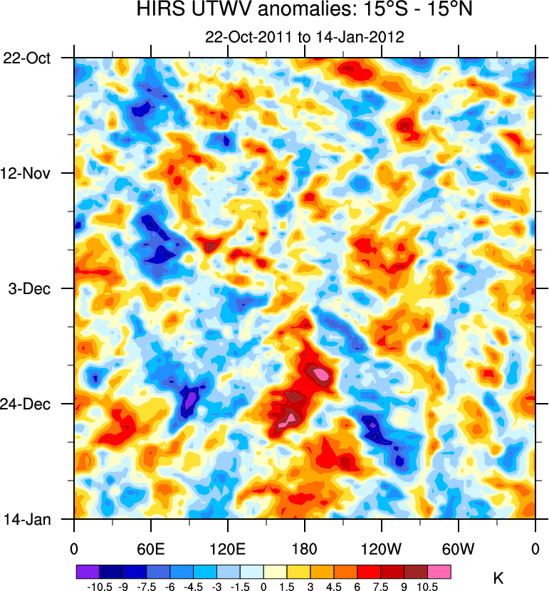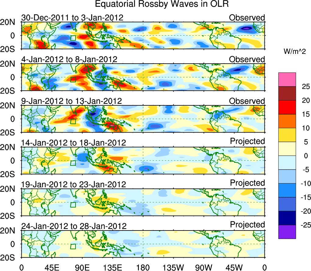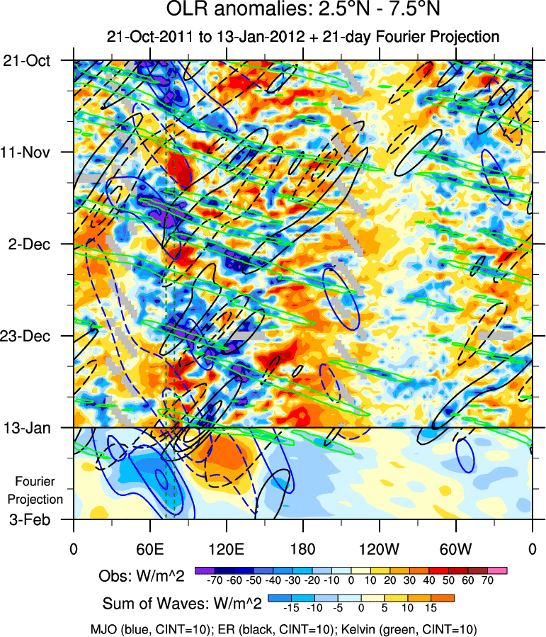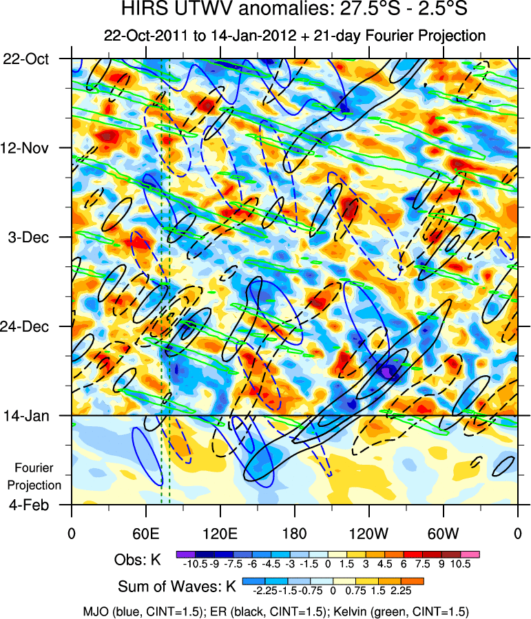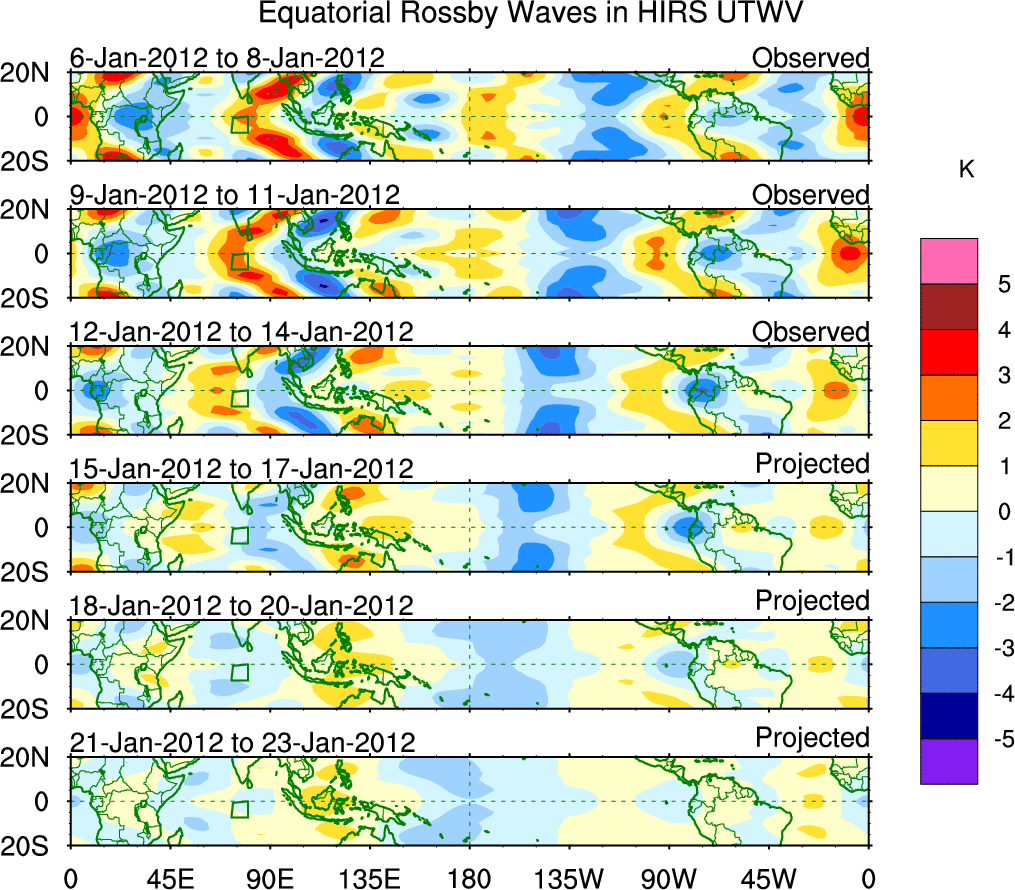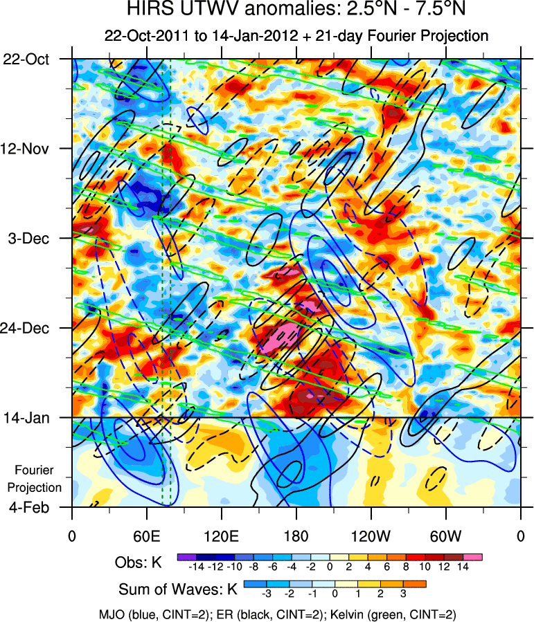 To identify tropical waves in near real-time, the OLR and UTWV data are filtered following Wheeler & Weickmann (2001 MWR). The daily anomalies are calculated using the first 3 harmonics of the seasonal cycle for 1979–2009. Missing values are then filled using linear interpolation in space and time. The most recent 365 days of anomalies are padded with 659 days of zeroes, and the result is filtered for each wave type.