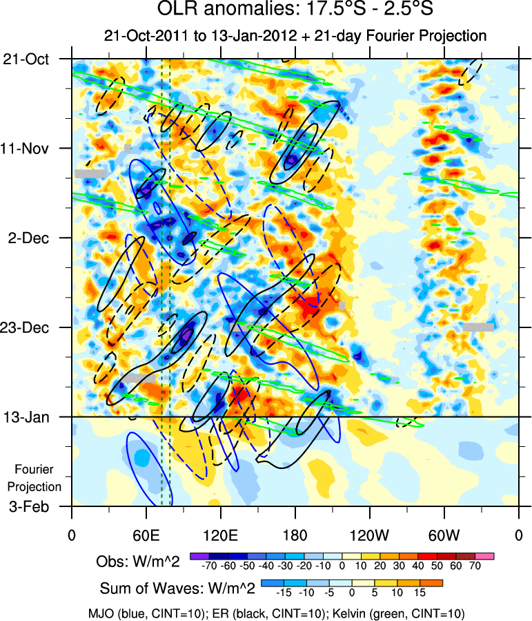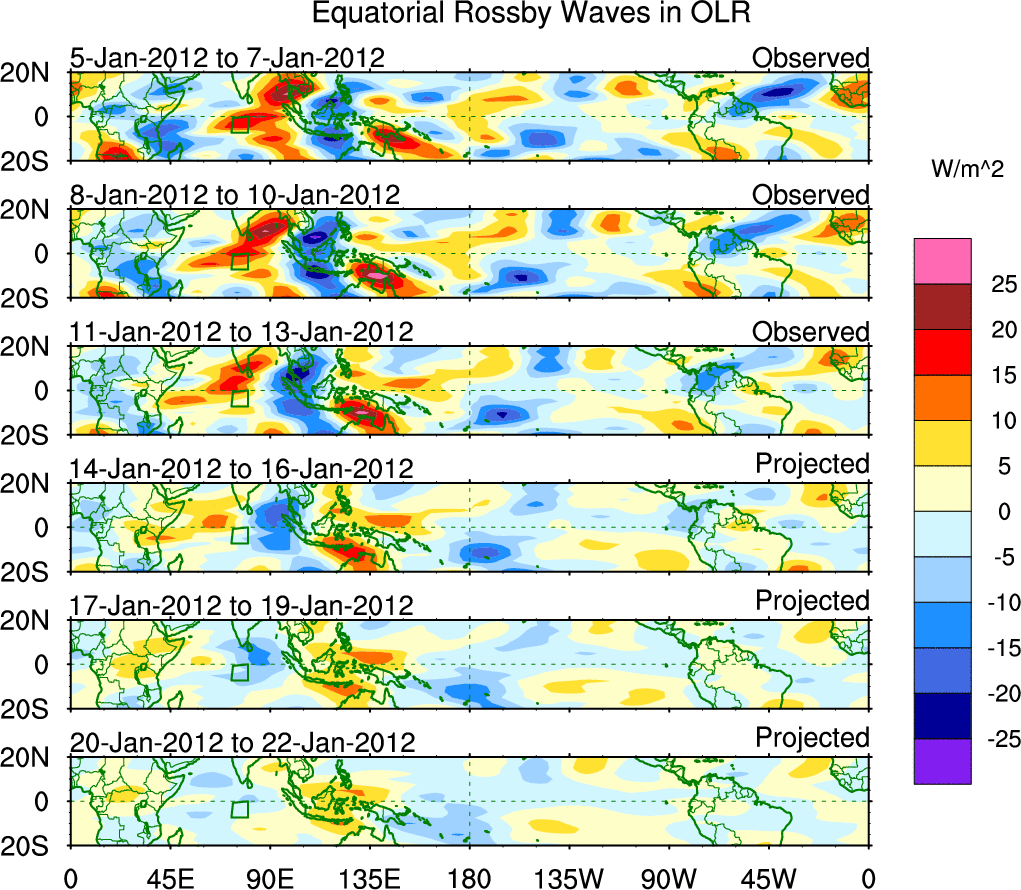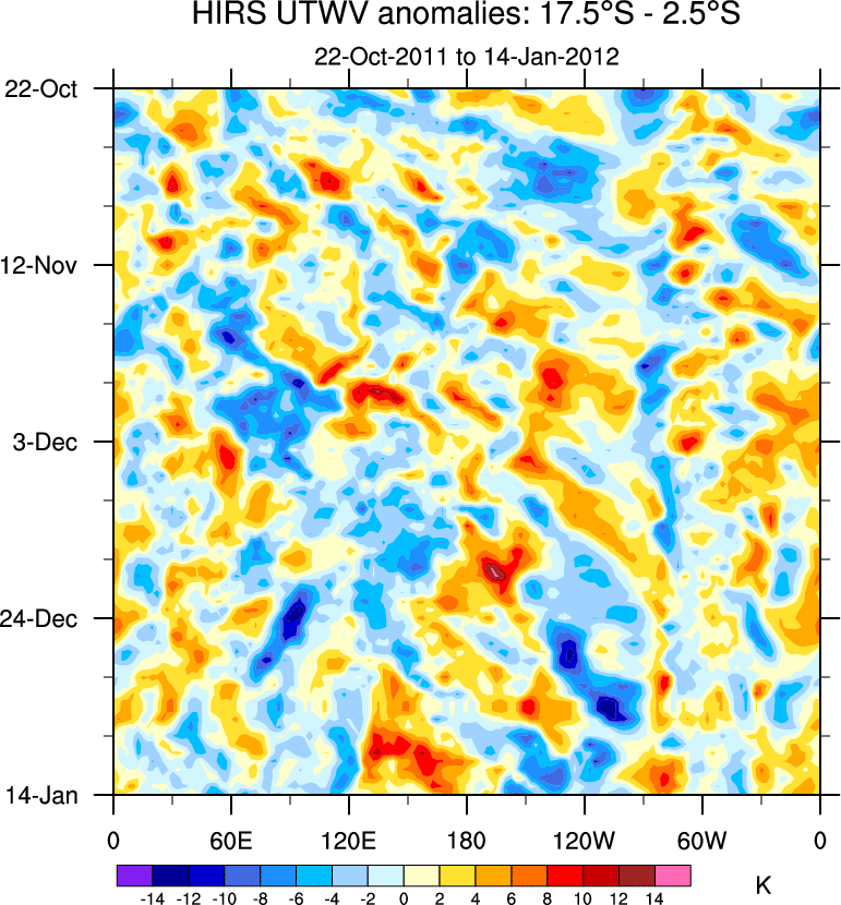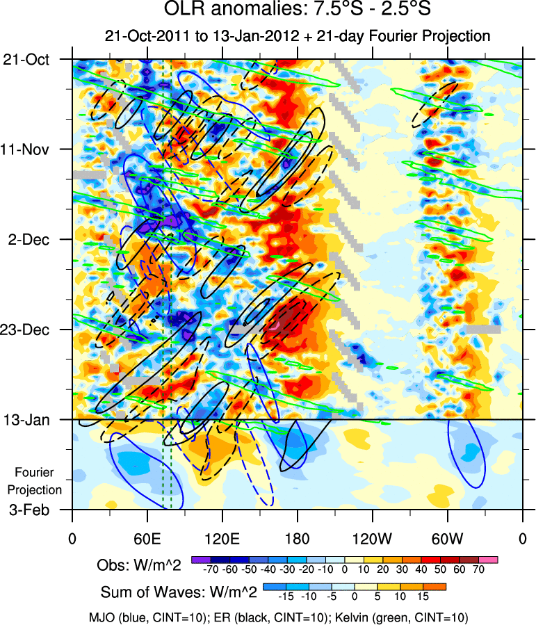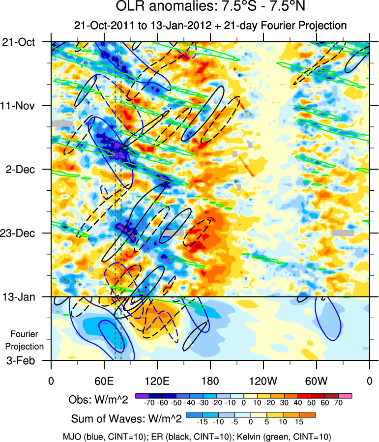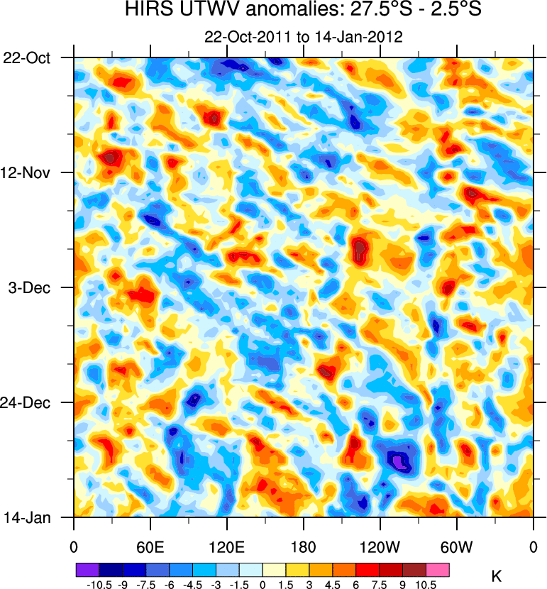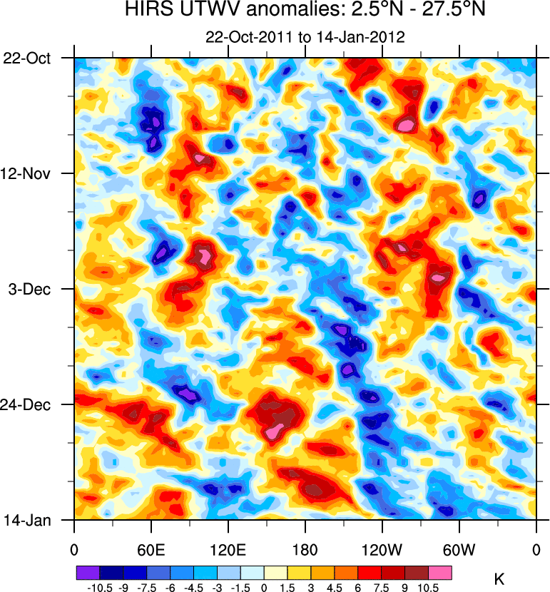 To identify tropical waves in near real-time, the OLR and UTWV data are filtered following Wheeler & Weickmann (2001 MWR). The daily anomalies are calculated using the first 3 harmonics of the seasonal cycle for 1979–2009. Missing values are then filled using linear interpolation in space and time. The most recent 365 days of anomalies are padded with 659 days of zeroes, and the result is filtered for each wave type.