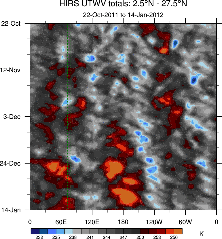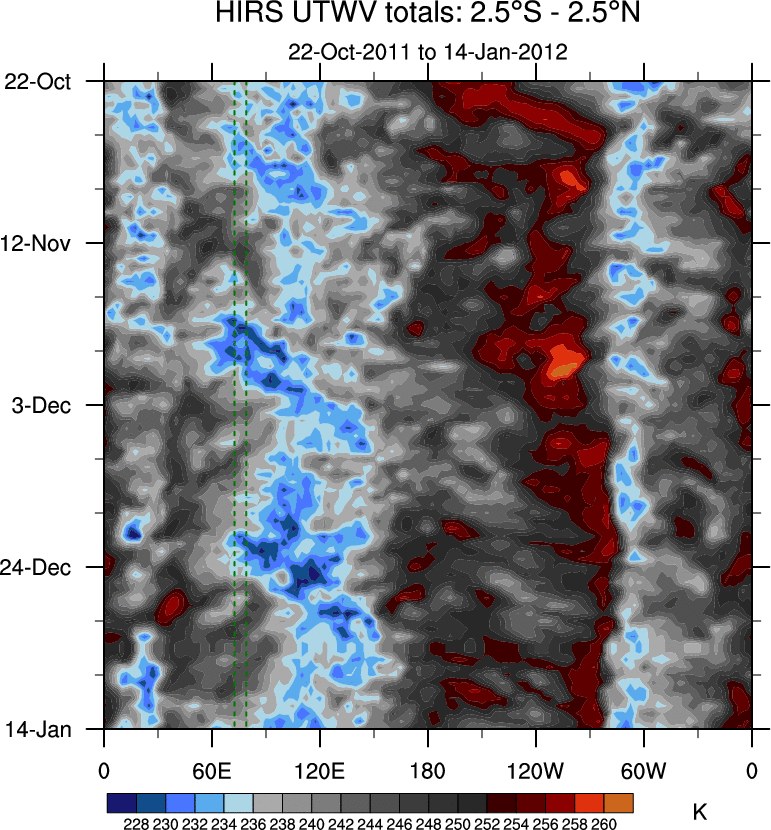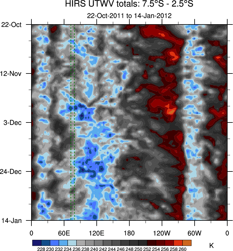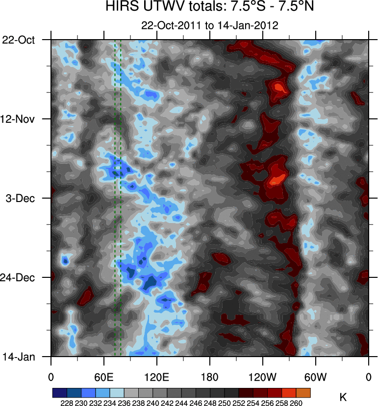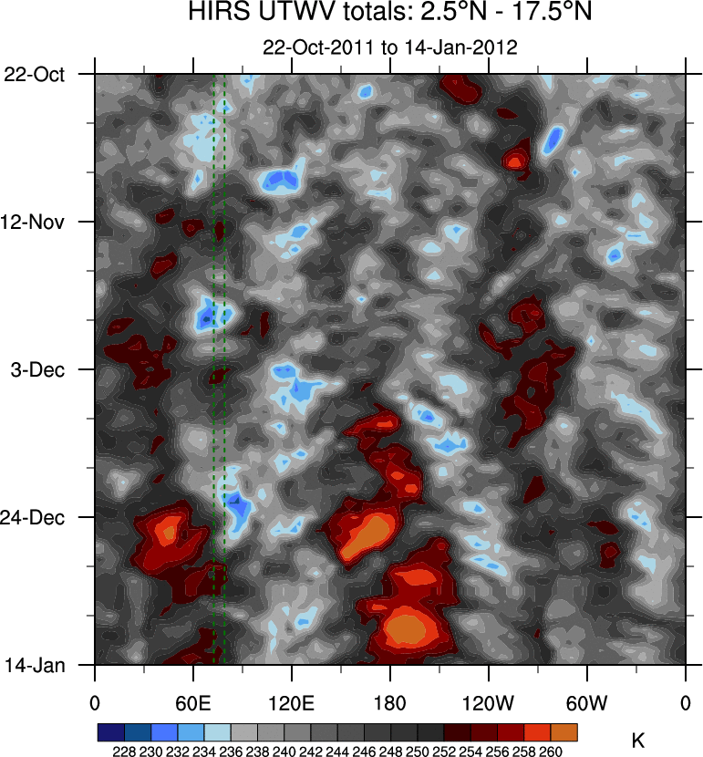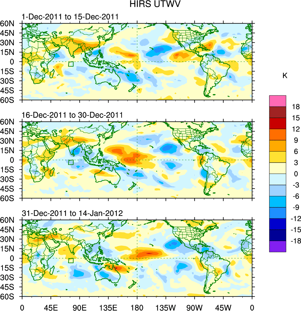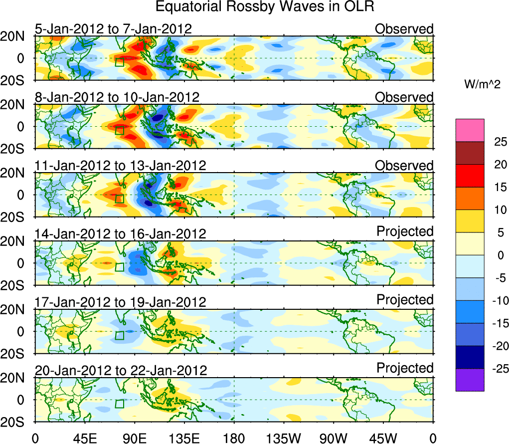 To identify tropical waves in near real-time, the OLR and UTWV data are filtered following Wheeler & Weickmann (2001 MWR). The daily anomalies are calculated using the first 3 harmonics of the seasonal cycle for 1979–2009. Missing values are then filled using linear interpolation in space and time. The most recent 365 days of anomalies are padded with 659 days of zeroes, and the result is filtered for each wave type.