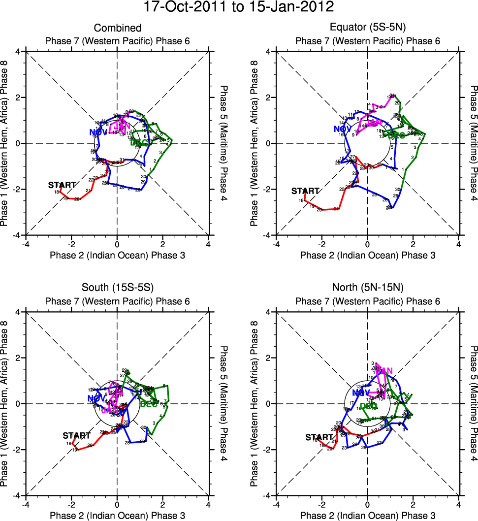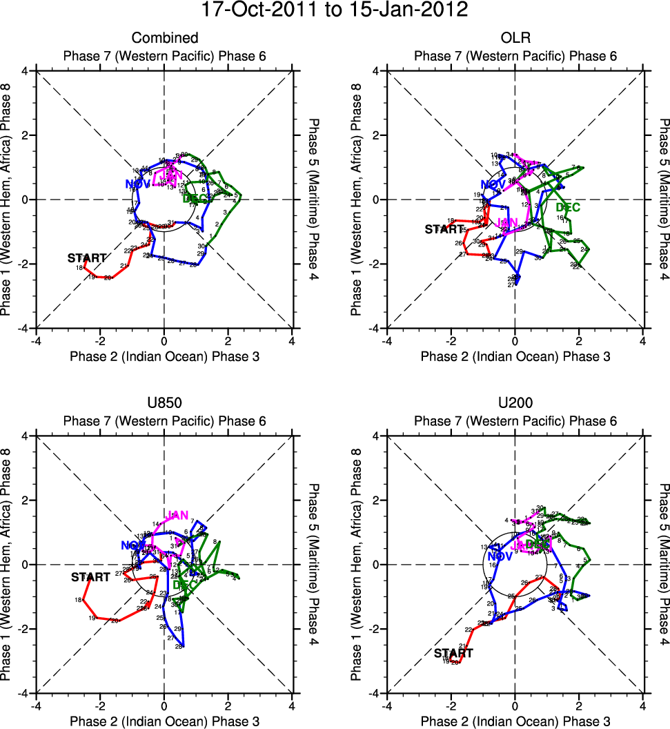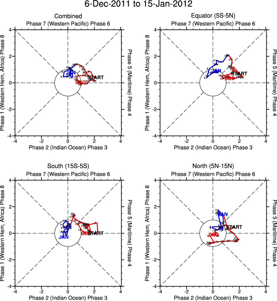 Wheeler and Hendon (2004) constructed the RMM index for monitoring the MJO. This index consists of the first two principal components (PCs) of OLR, 850-hPa zonal wind, and 200-hPa zonal wind averaged 15S-15N.