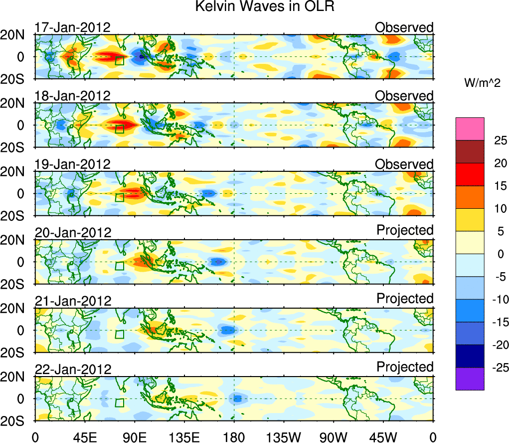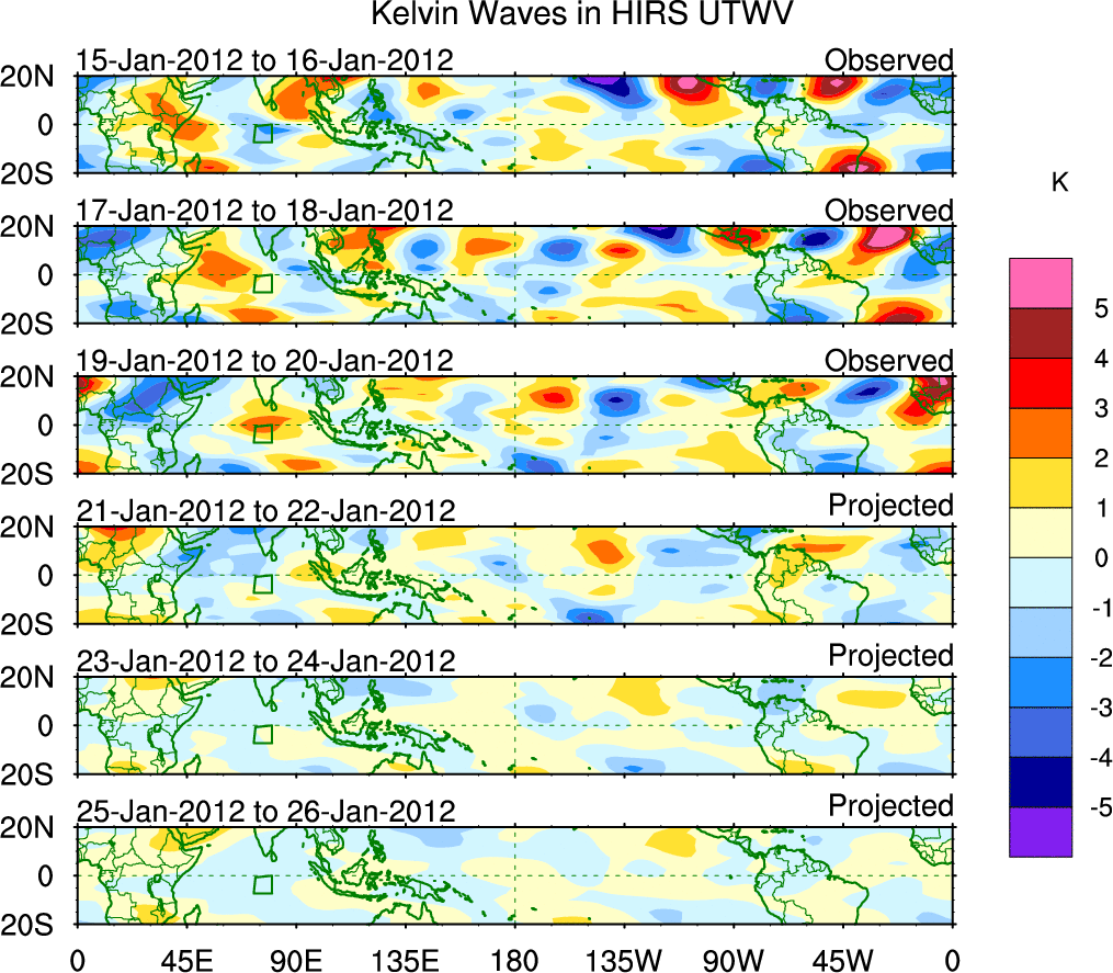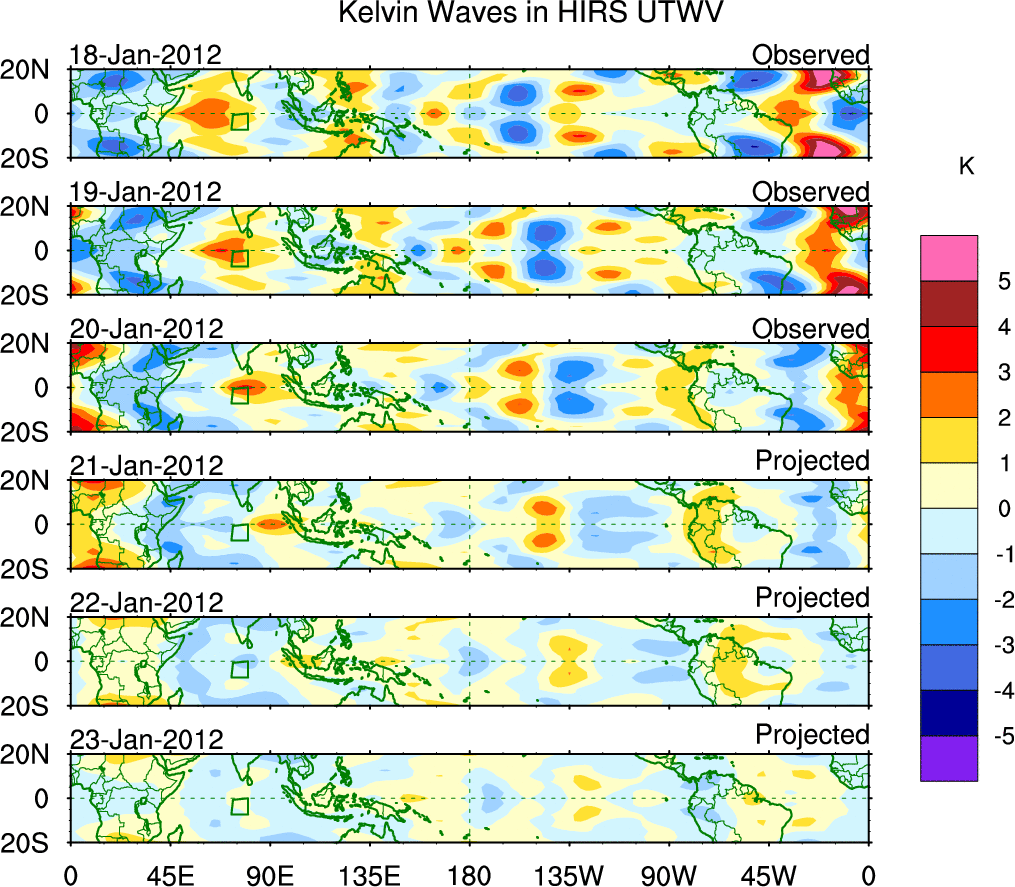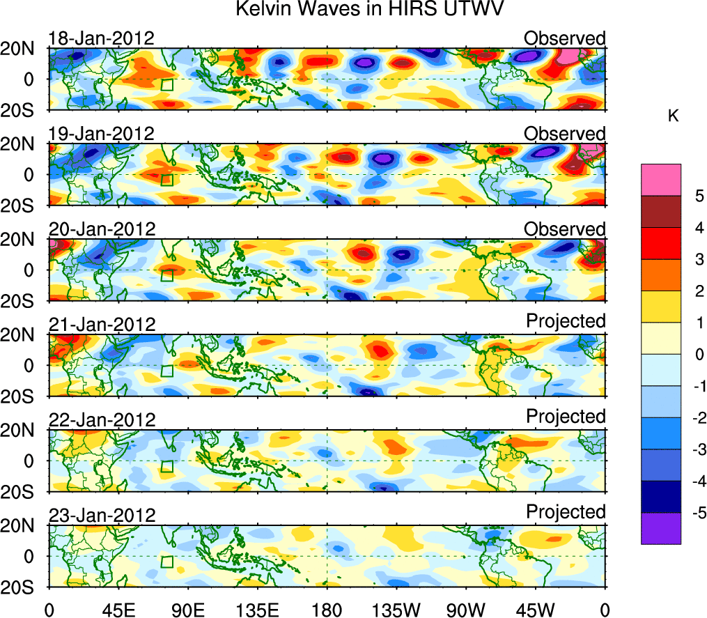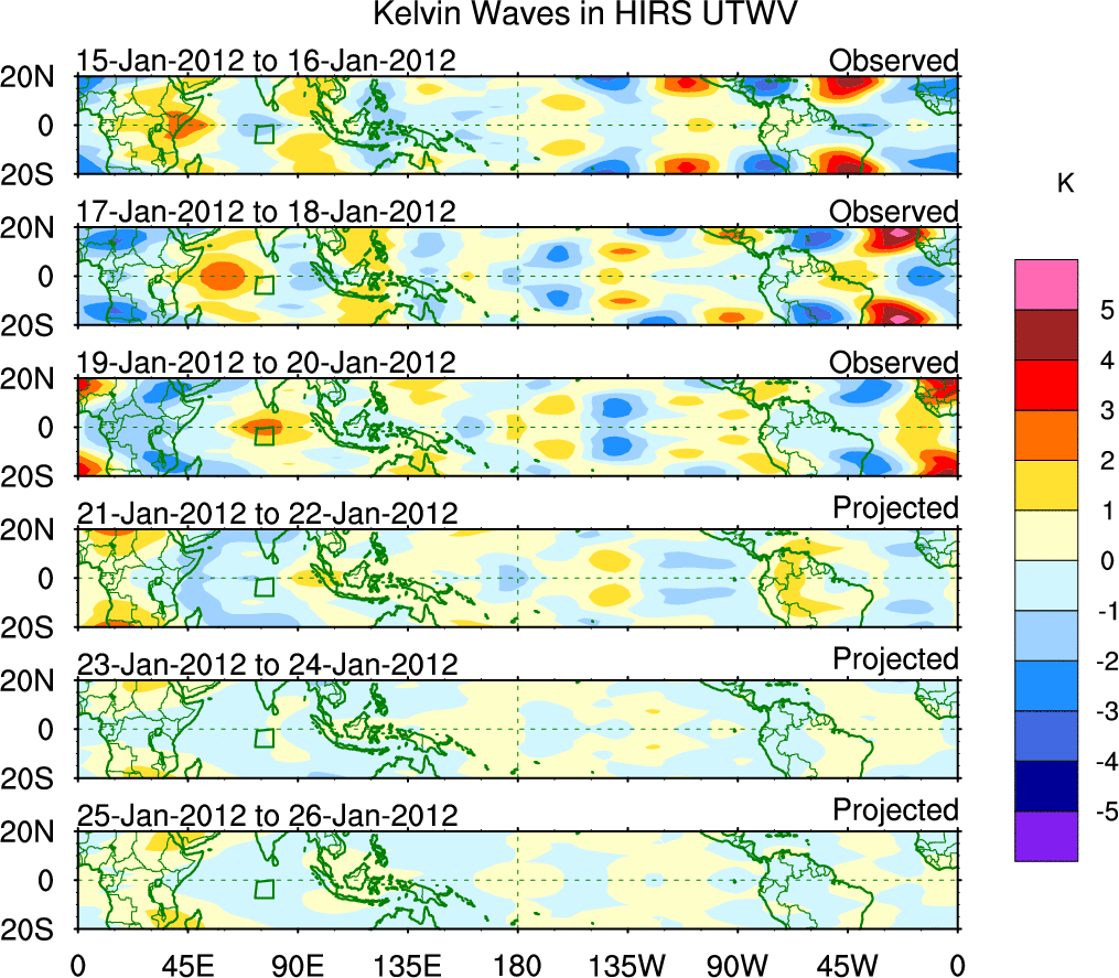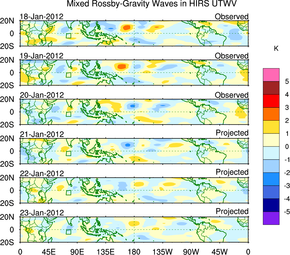 To identify tropical waves in near real-time, the OLR and UTWV data are filtered following Wheeler & Weickmann (2001 MWR). The daily anomalies are calculated using the first 3 harmonics of the seasonal cycle for 1979–2009. Missing values are then filled using linear interpolation in space and time. The most recent 365 days of anomalies are padded with 659 days of zeroes, and the result is filtered for each wave type.