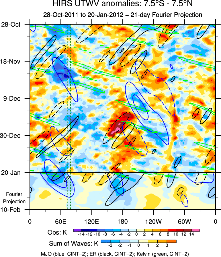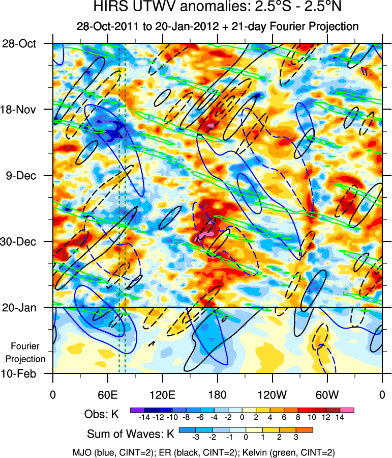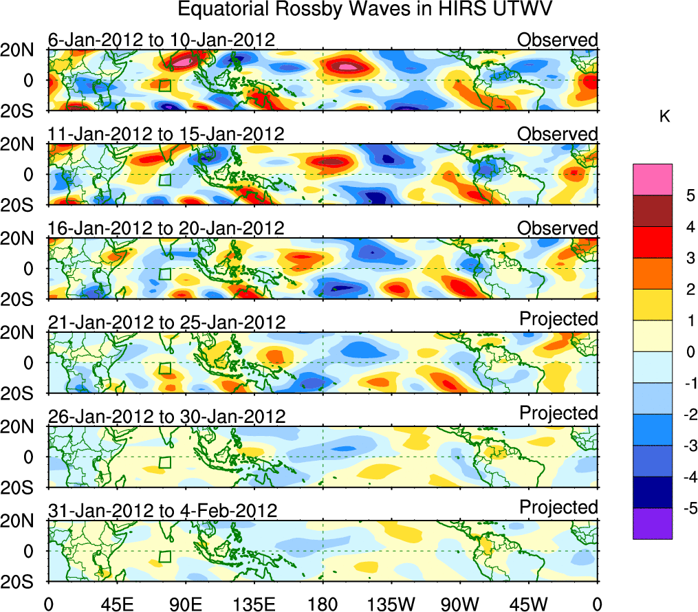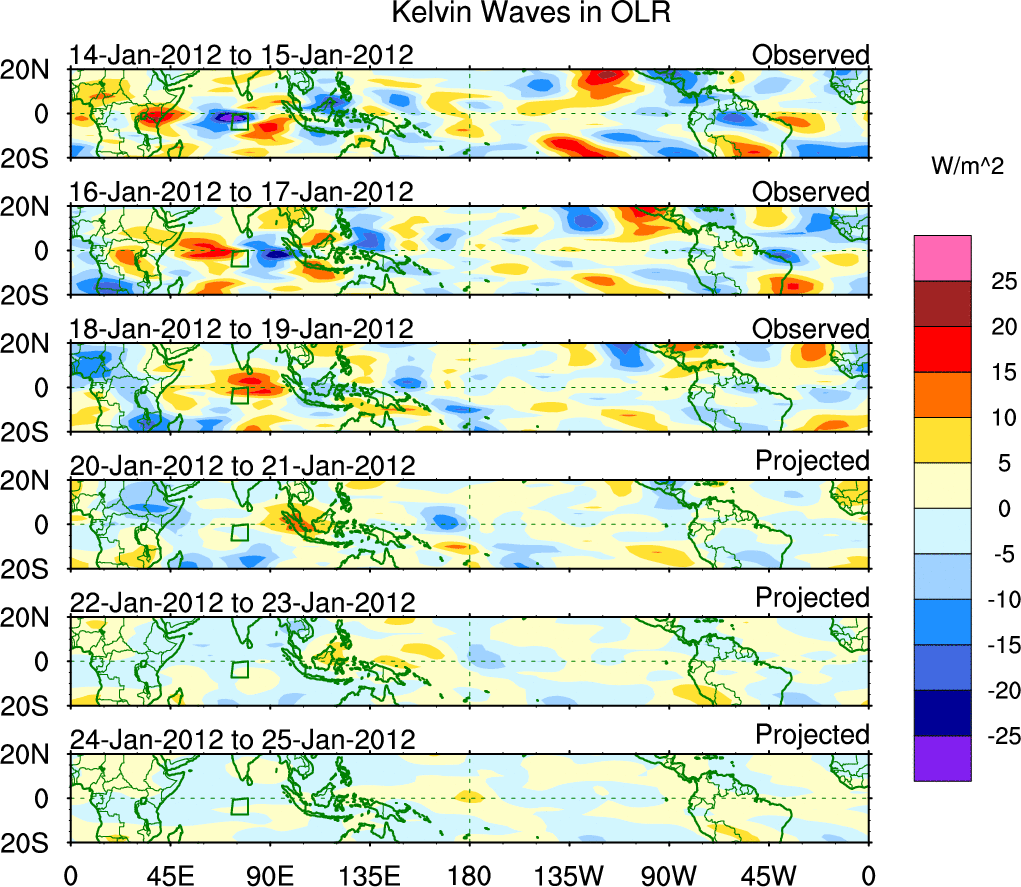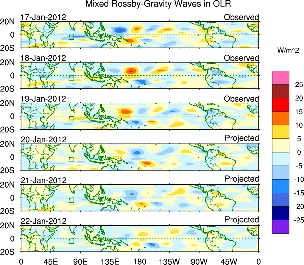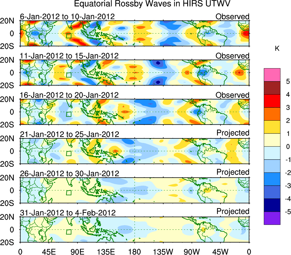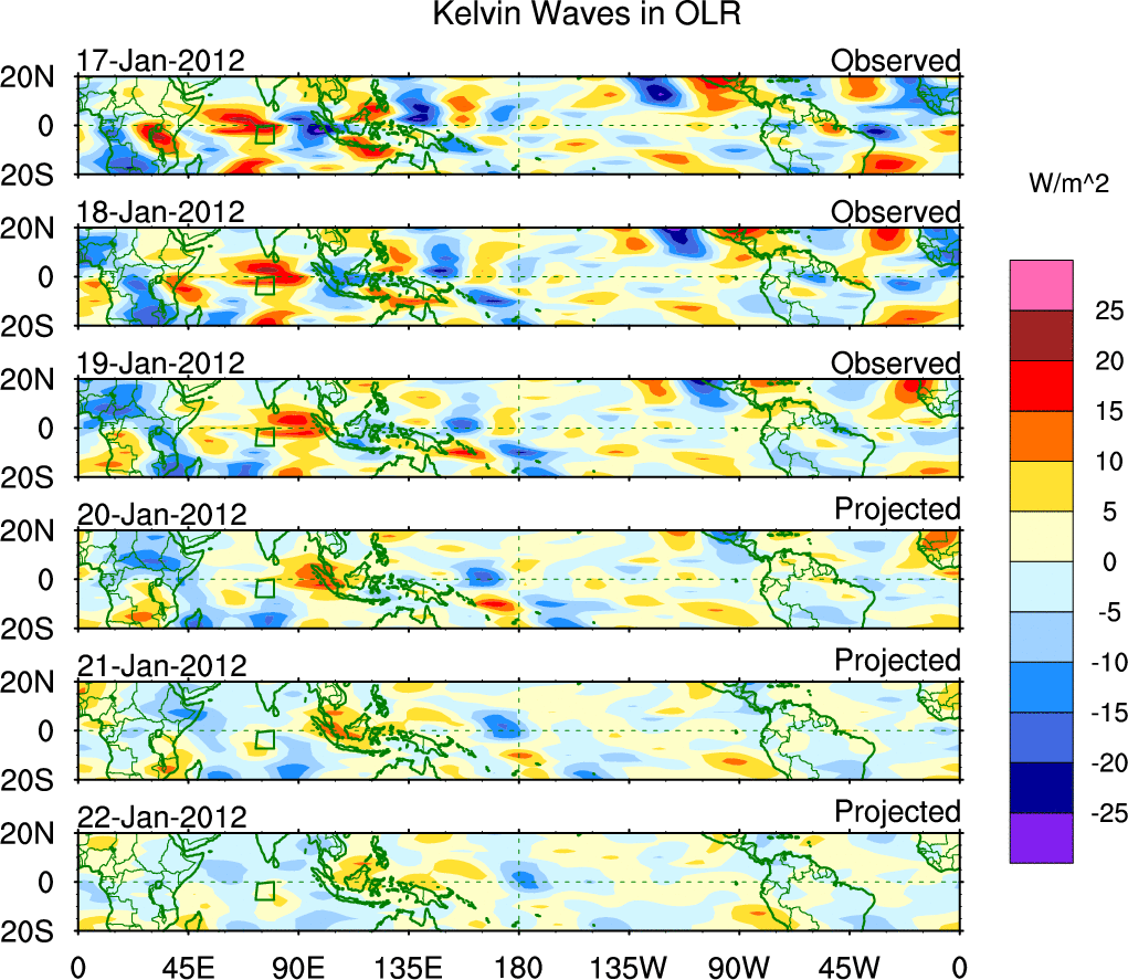 To identify tropical waves in near real-time, the OLR and UTWV data are filtered following Wheeler & Weickmann (2001 MWR). The daily anomalies are calculated using the first 3 harmonics of the seasonal cycle for 1979–2009. Missing values are then filled using linear interpolation in space and time. The most recent 365 days of anomalies are padded with 659 days of zeroes, and the result is filtered for each wave type.