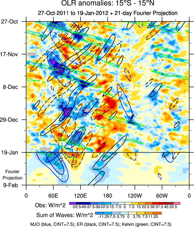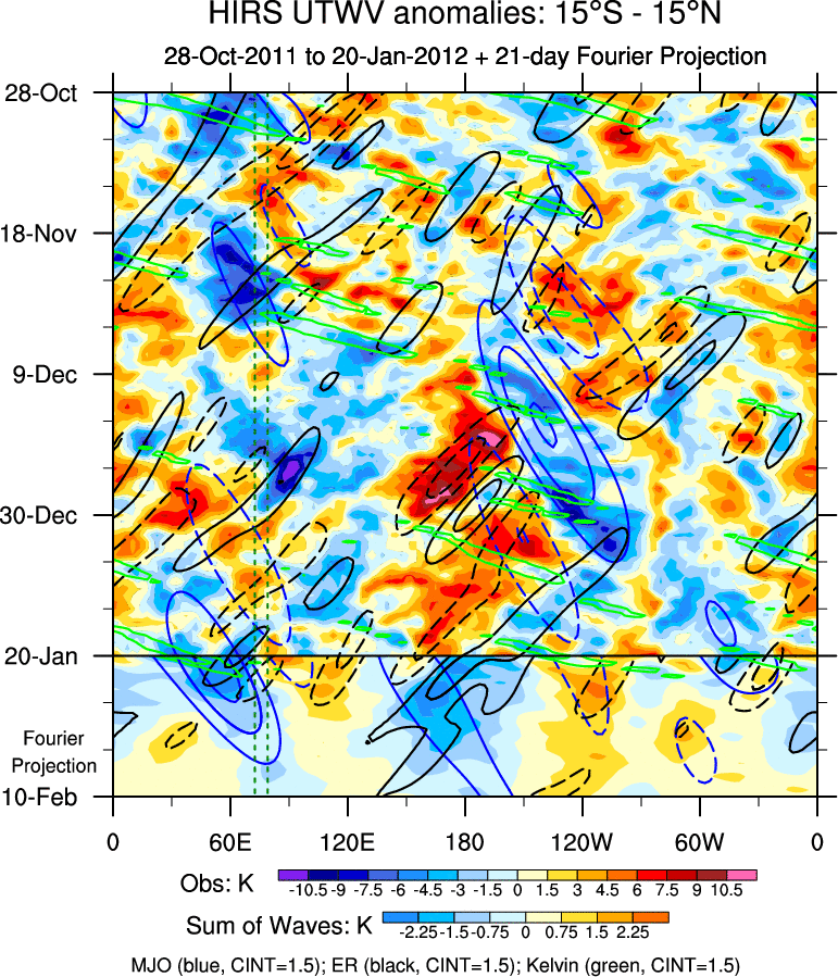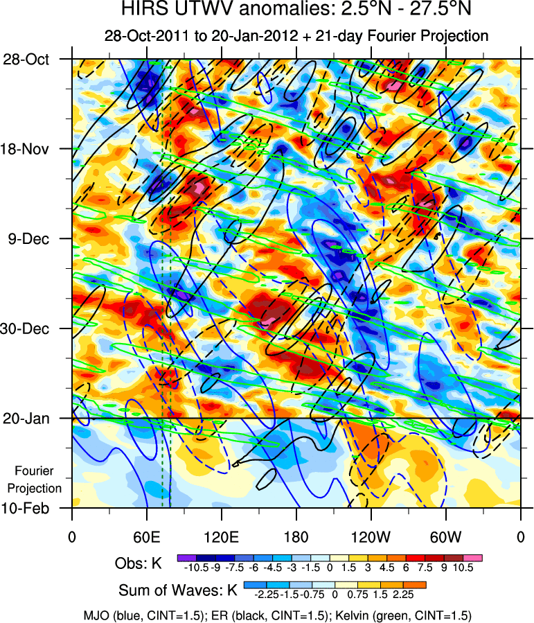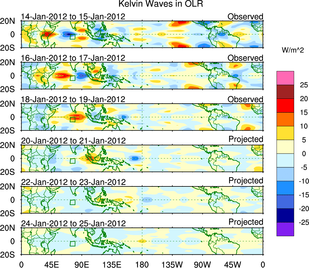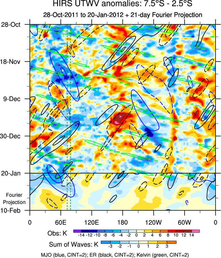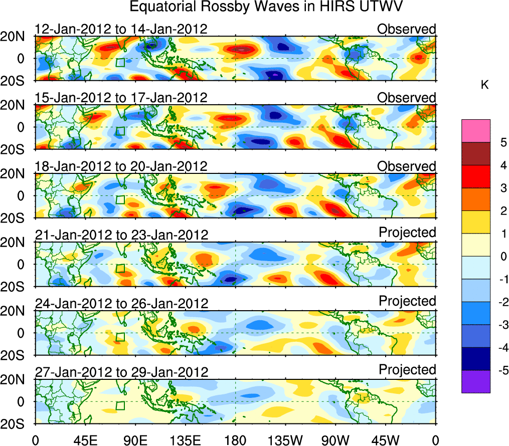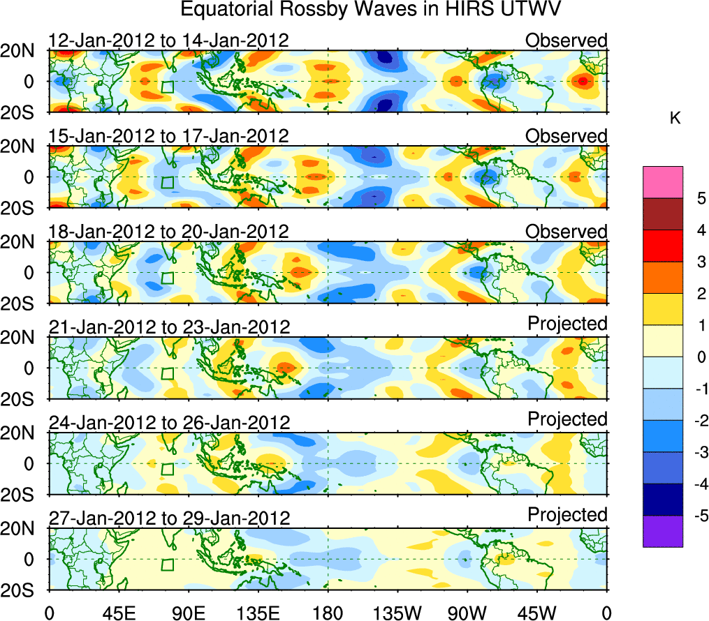 To identify tropical waves in near real-time, the OLR and UTWV data are filtered following Wheeler & Weickmann (2001 MWR). The daily anomalies are calculated using the first 3 harmonics of the seasonal cycle for 1979–2009. Missing values are then filled using linear interpolation in space and time. The most recent 365 days of anomalies are padded with 659 days of zeroes, and the result is filtered for each wave type.