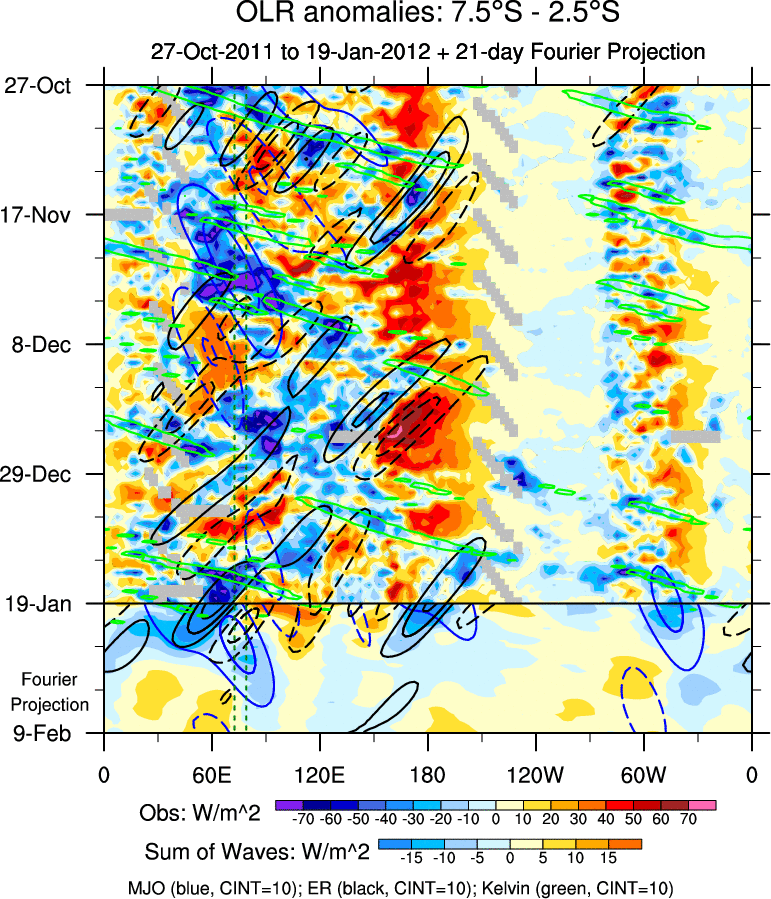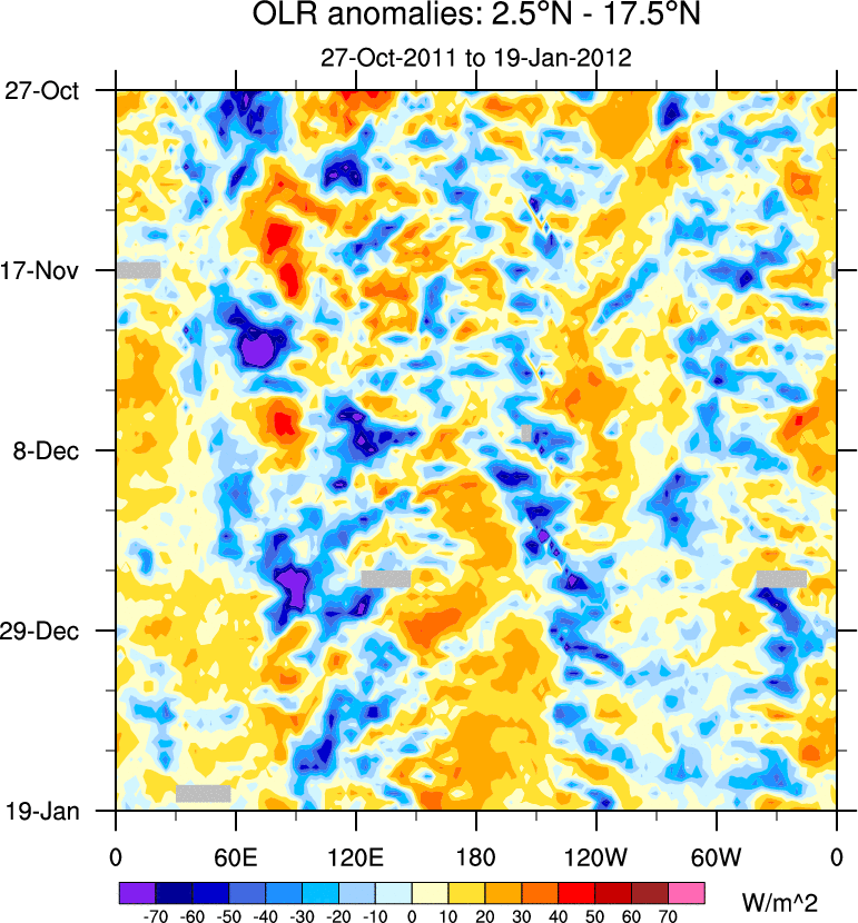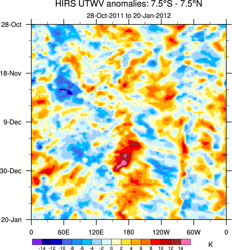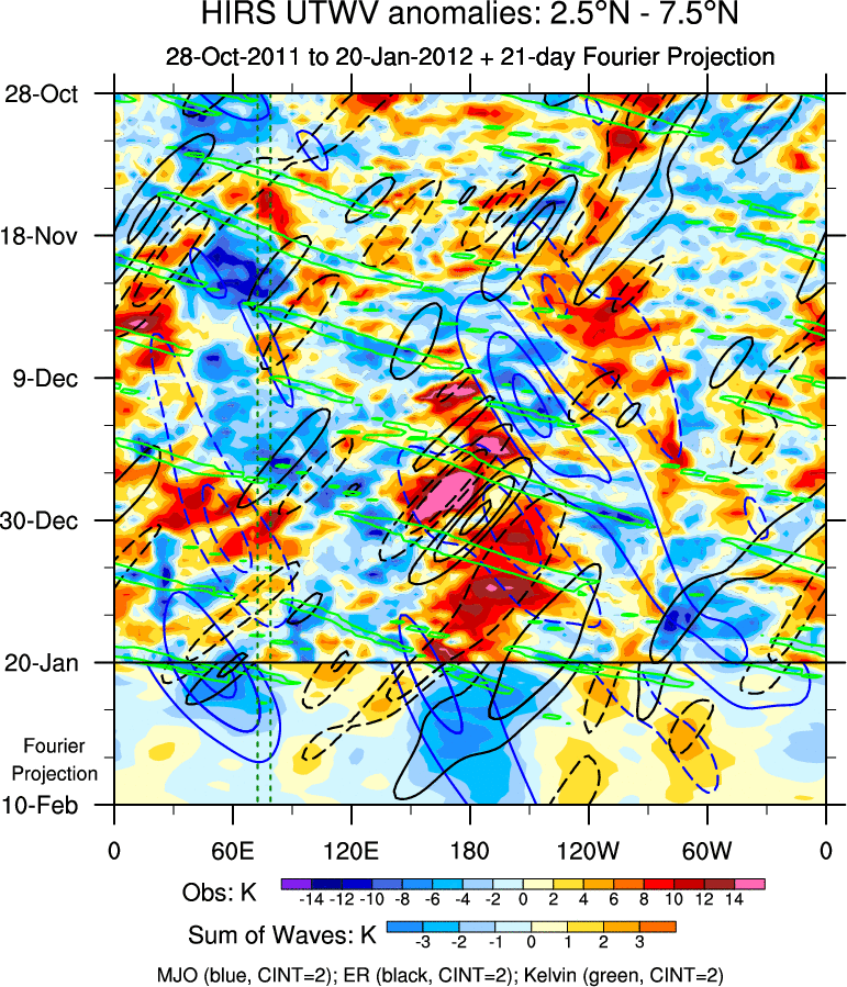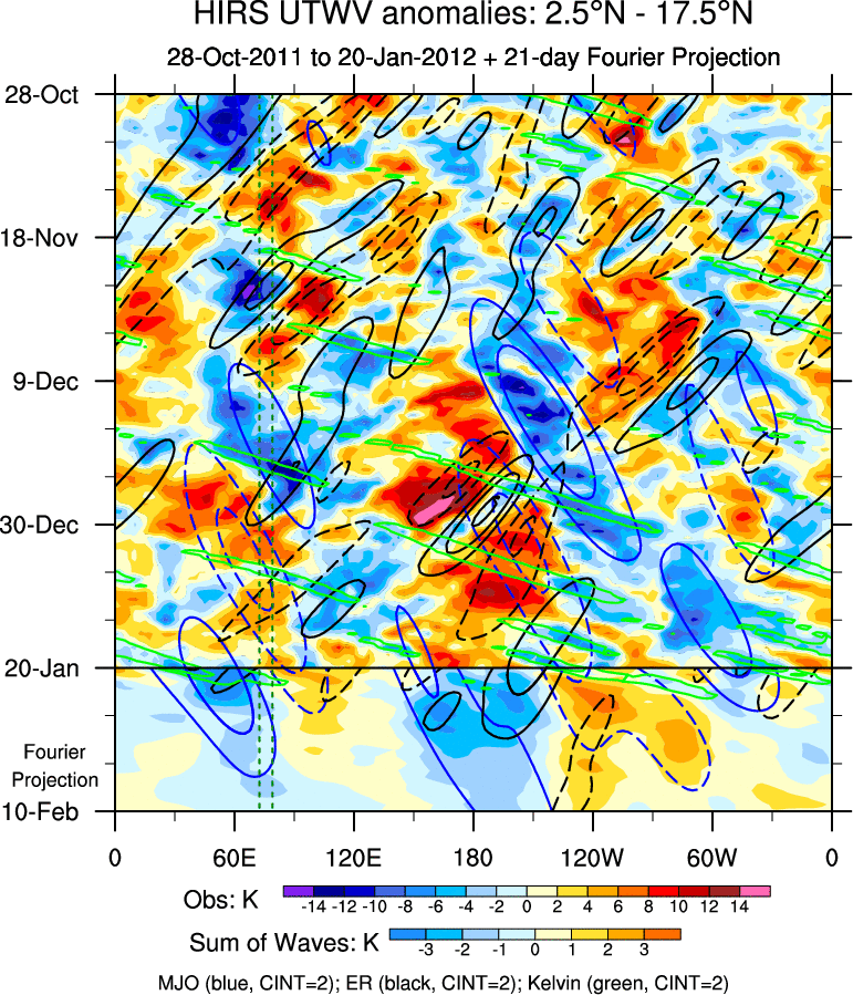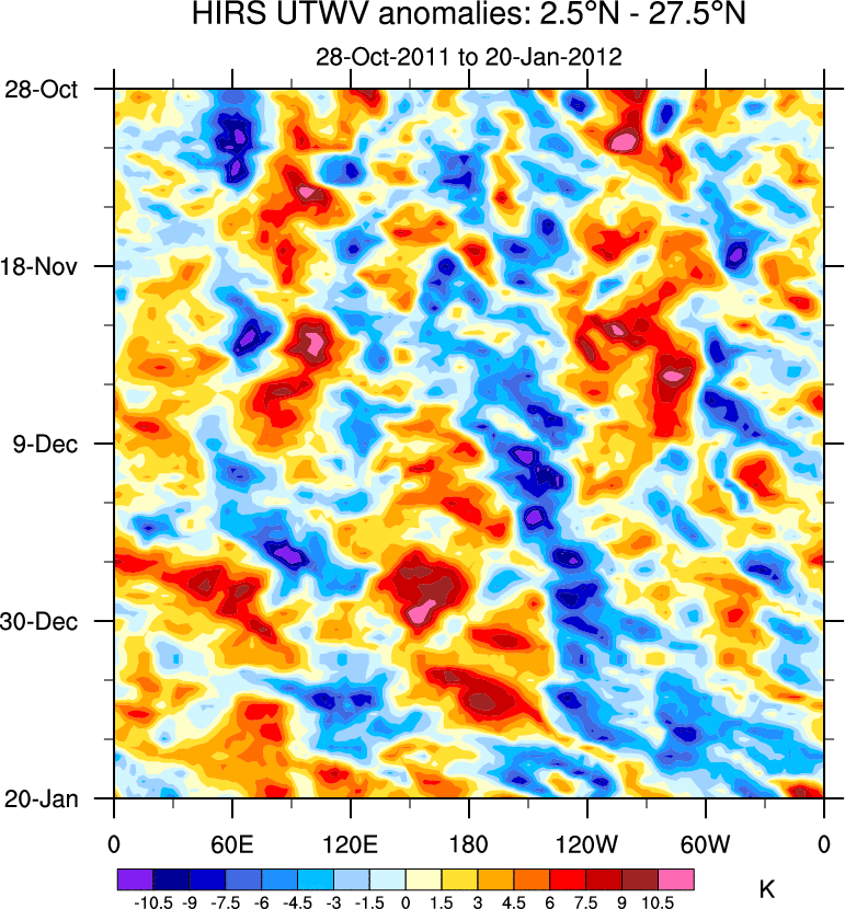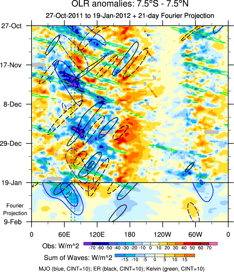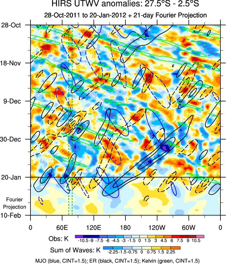 To identify tropical waves in near real-time, the OLR and UTWV data are filtered following Wheeler & Weickmann (2001 MWR). The daily anomalies are calculated using the first 3 harmonics of the seasonal cycle for 1979–2009. Missing values are then filled using linear interpolation in space and time. The most recent 365 days of anomalies are padded with 659 days of zeroes, and the result is filtered for each wave type.
