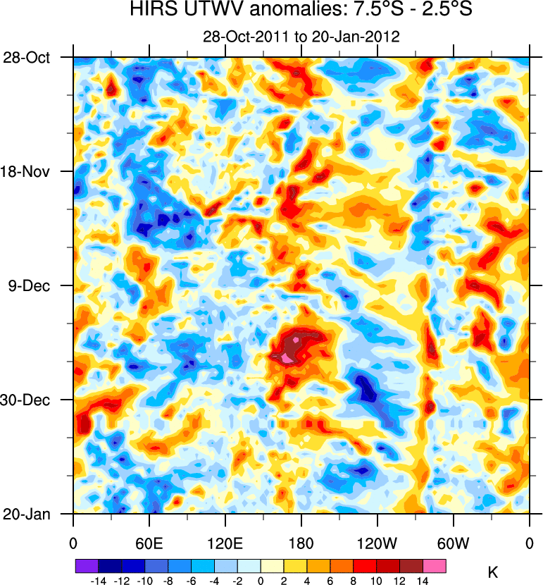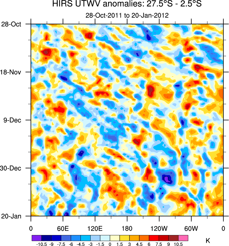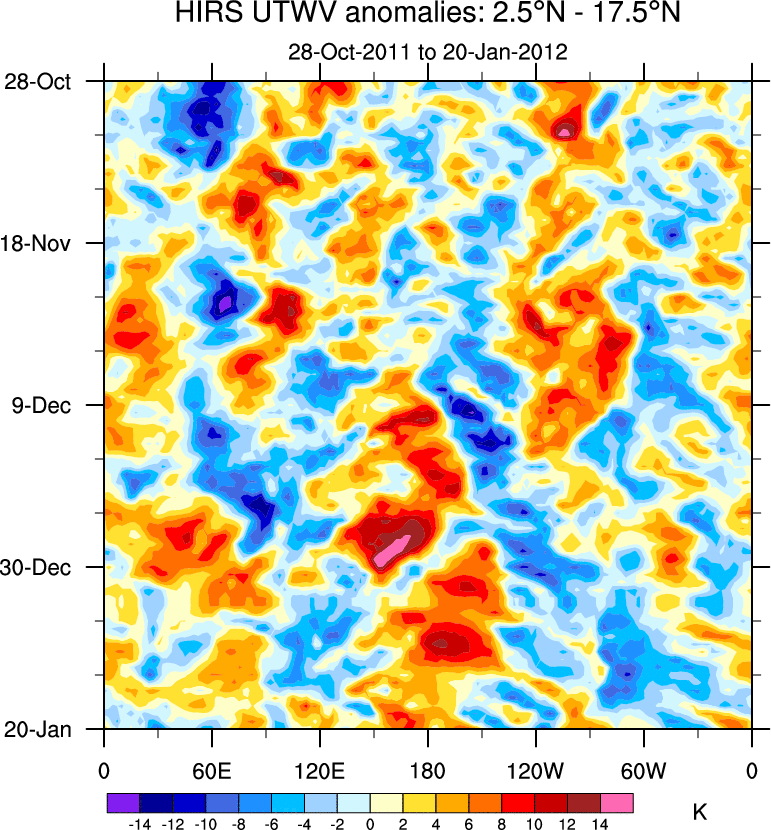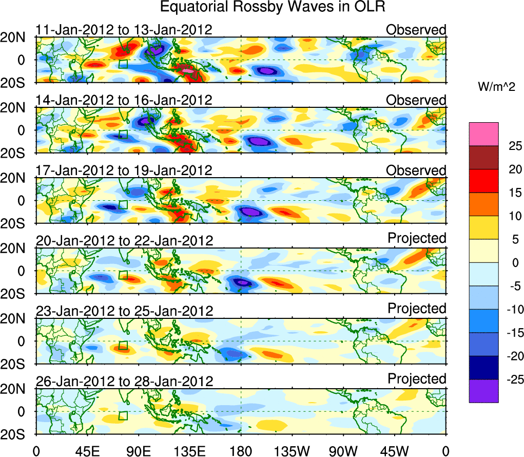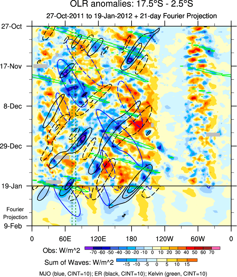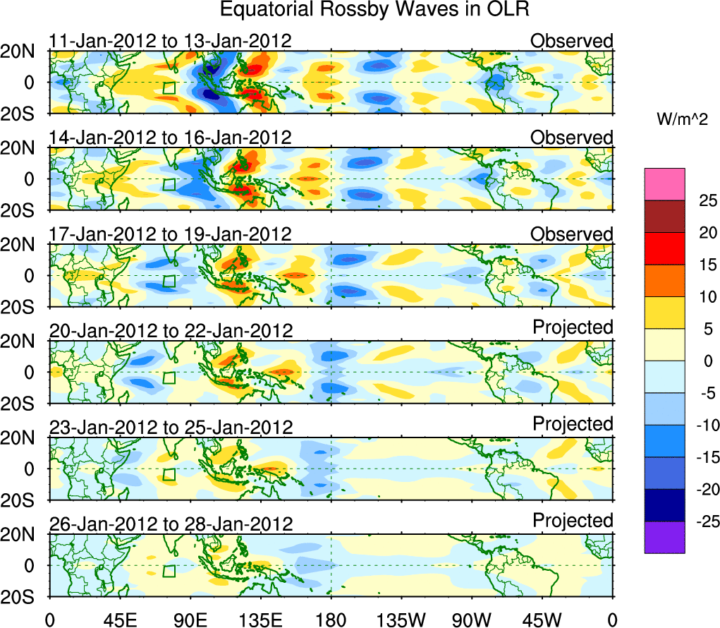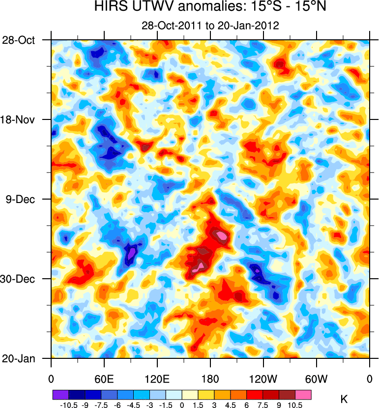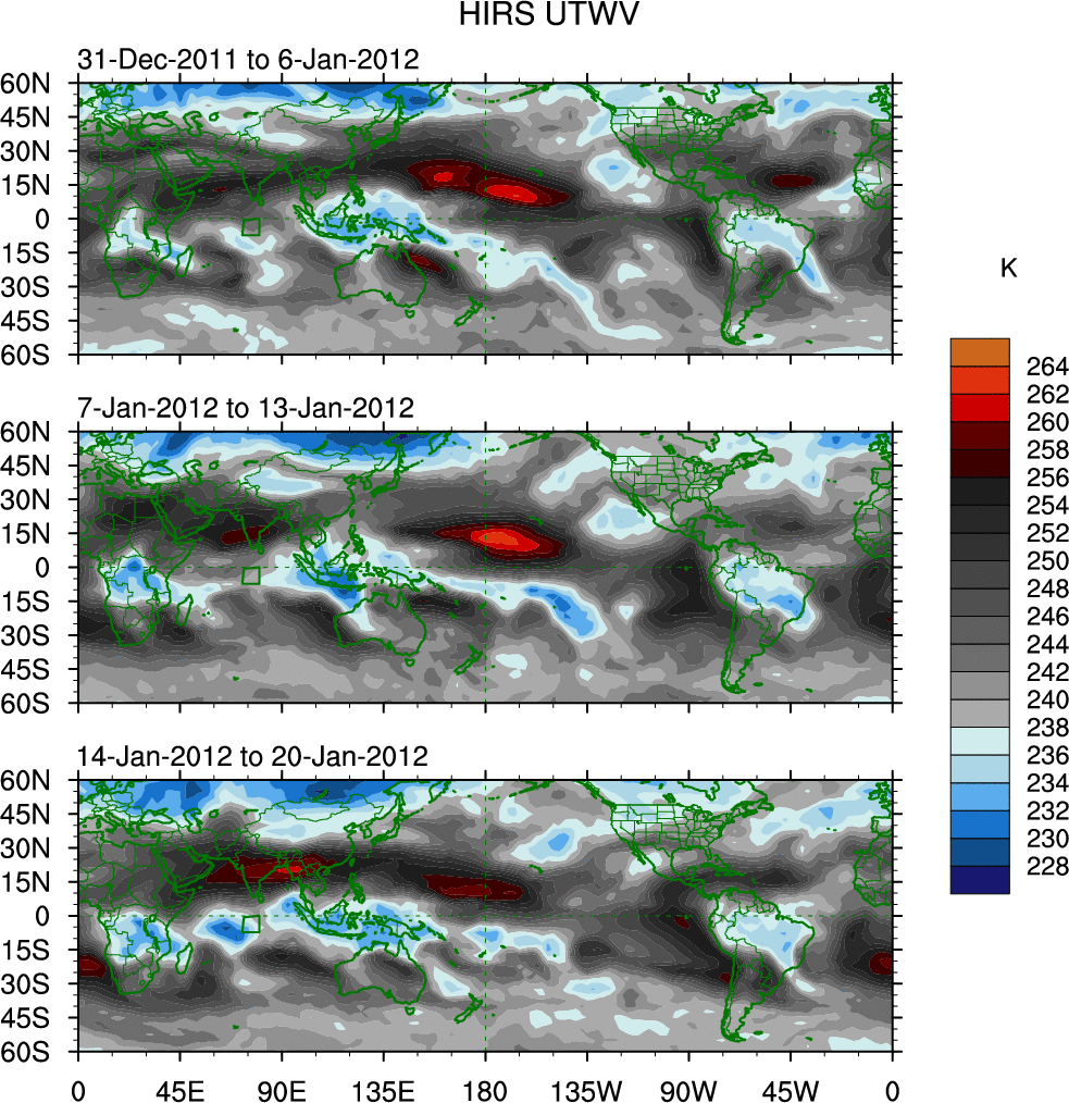 To identify tropical waves in near real-time, the OLR and UTWV data are filtered following Wheeler & Weickmann (2001 MWR). The daily anomalies are calculated using the first 3 harmonics of the seasonal cycle for 1979–2009. Missing values are then filled using linear interpolation in space and time. The most recent 365 days of anomalies are padded with 659 days of zeroes, and the result is filtered for each wave type.