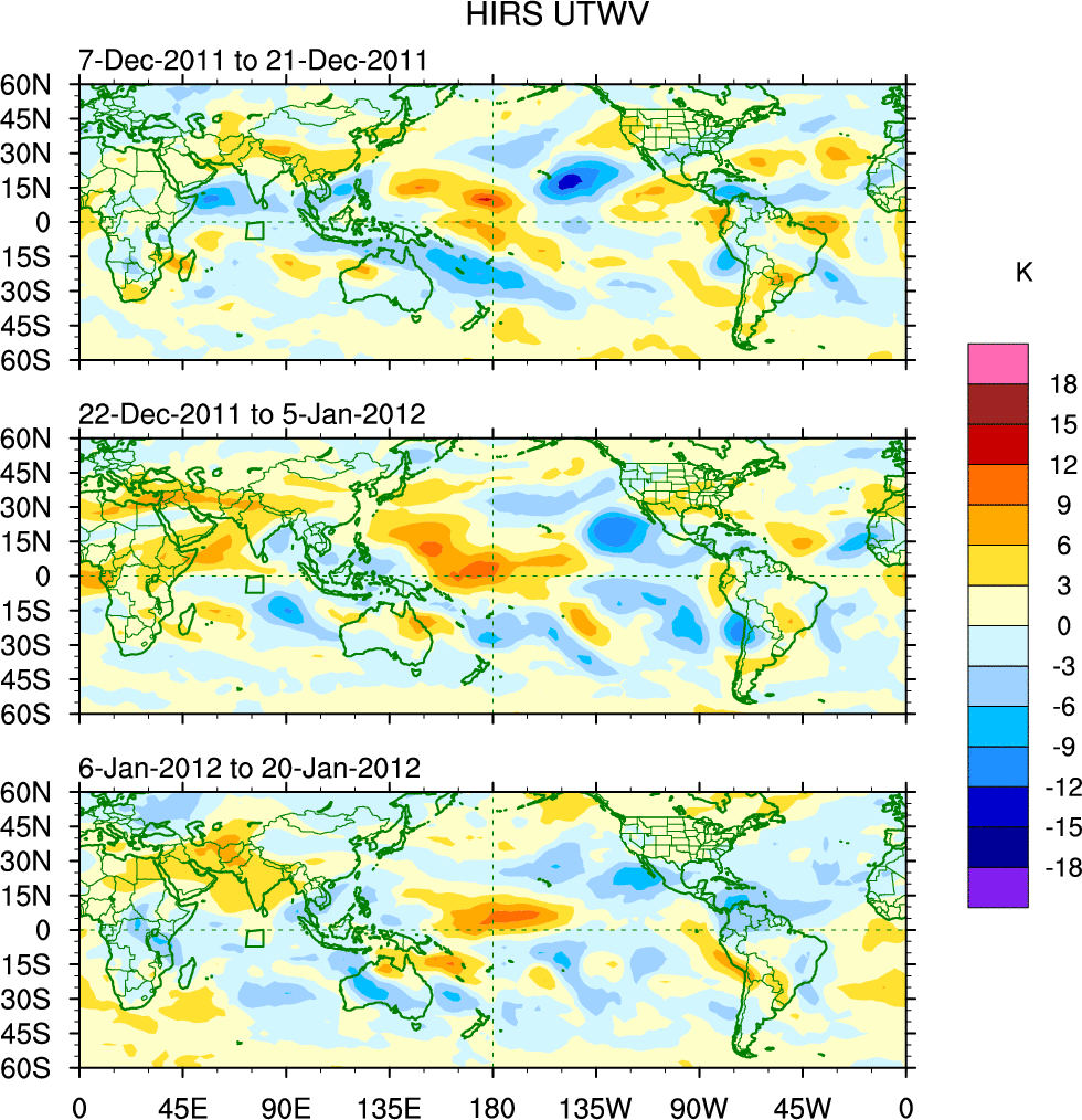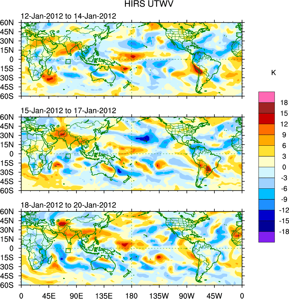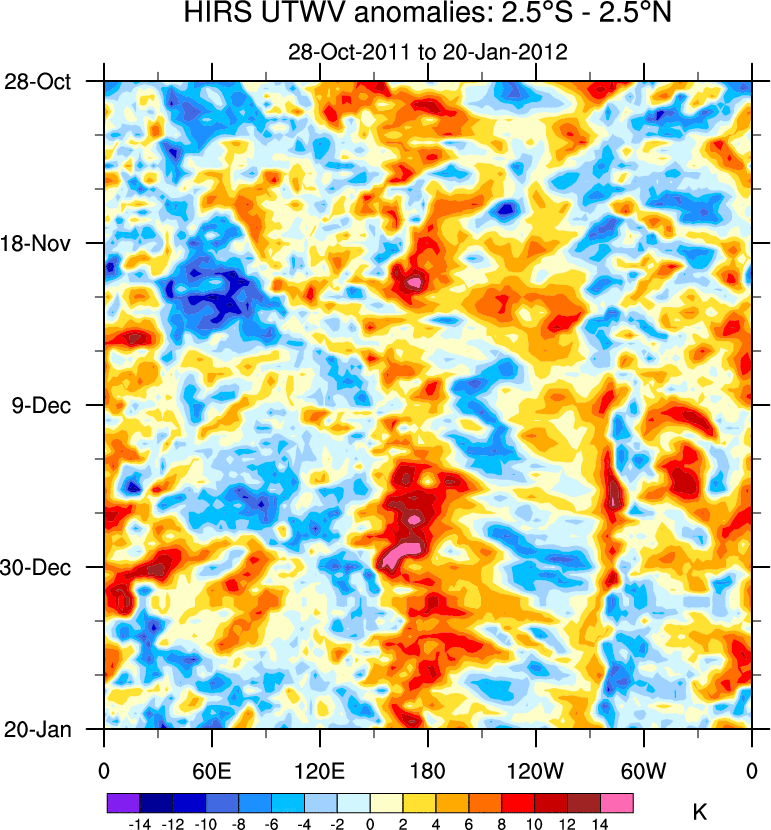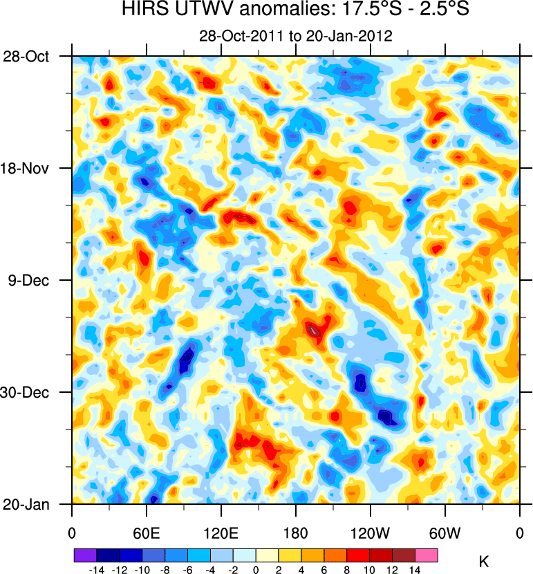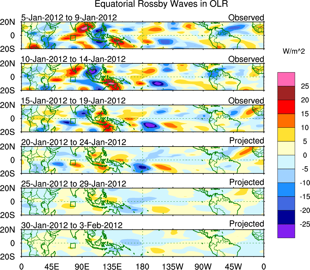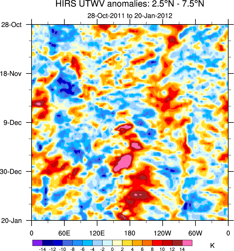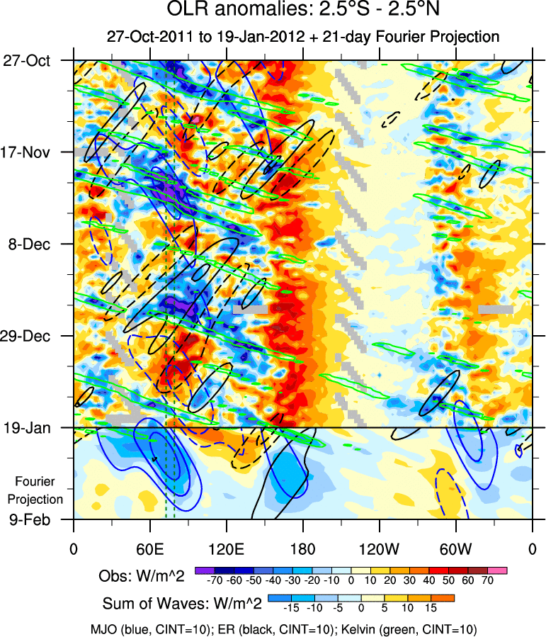 To identify tropical waves in near real-time, the OLR and UTWV data are filtered following Wheeler & Weickmann (2001 MWR). The daily anomalies are calculated using the first 3 harmonics of the seasonal cycle for 1979–2009. Missing values are then filled using linear interpolation in space and time. The most recent 365 days of anomalies are padded with 659 days of zeroes, and the result is filtered for each wave type.