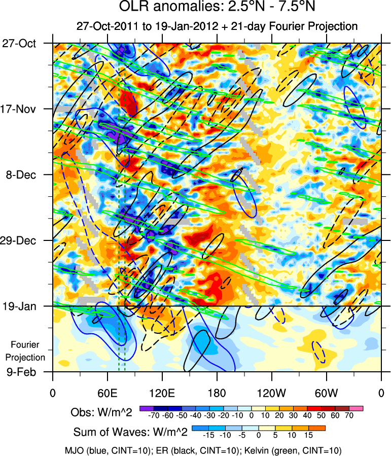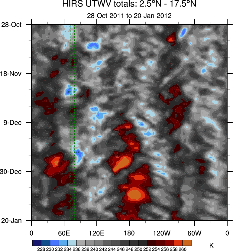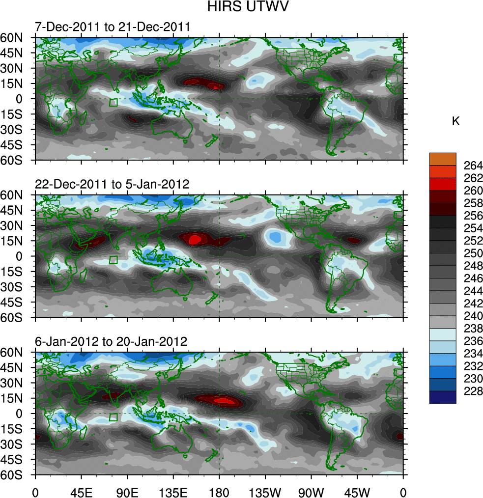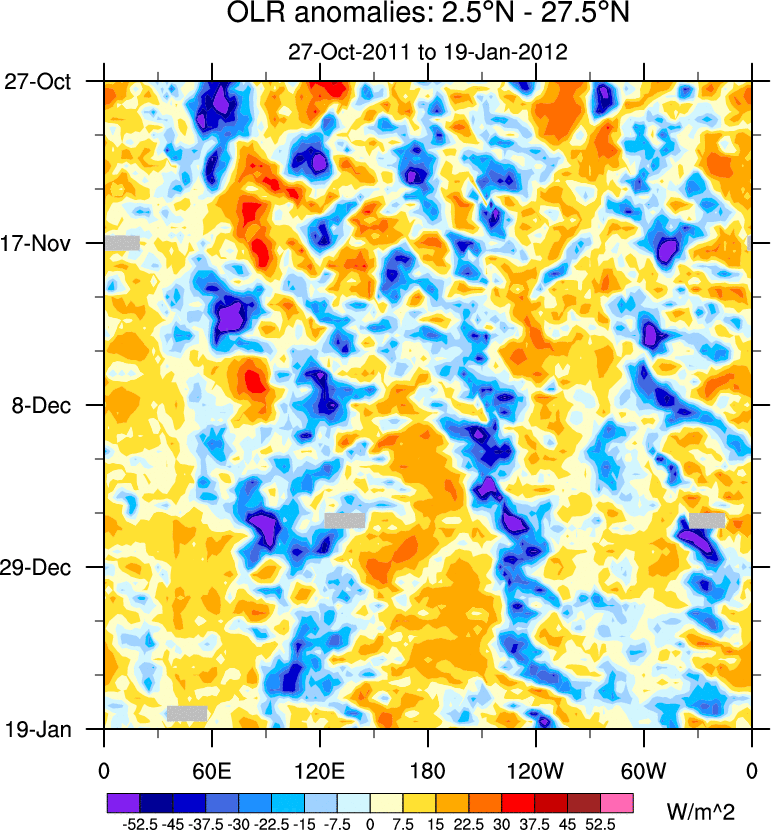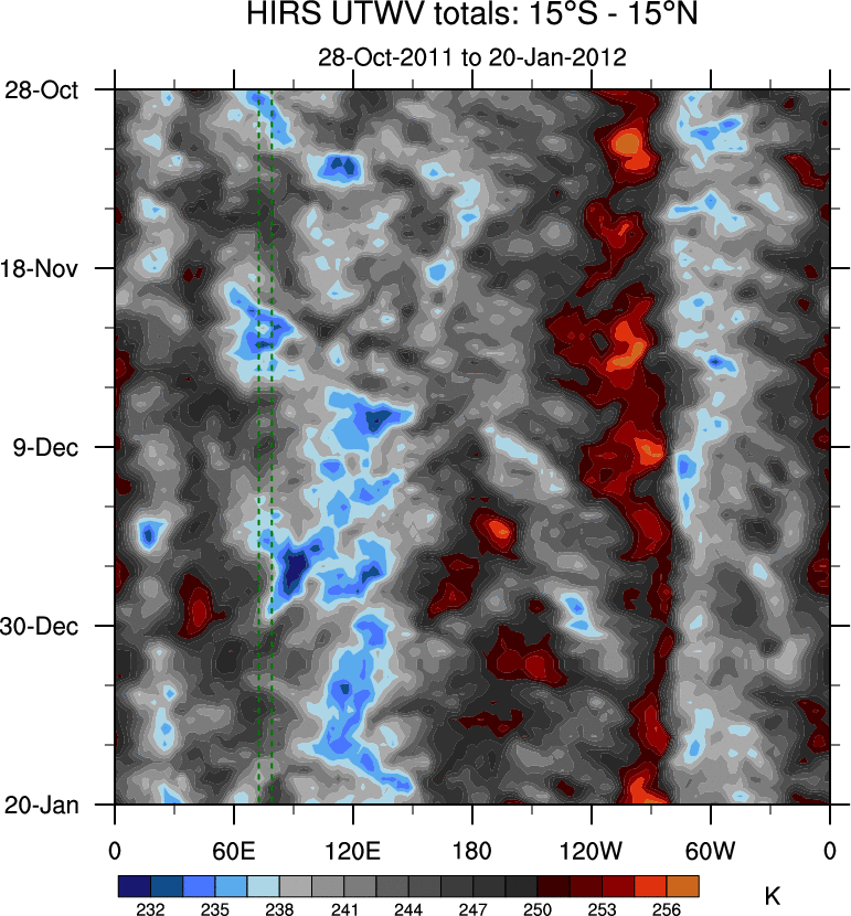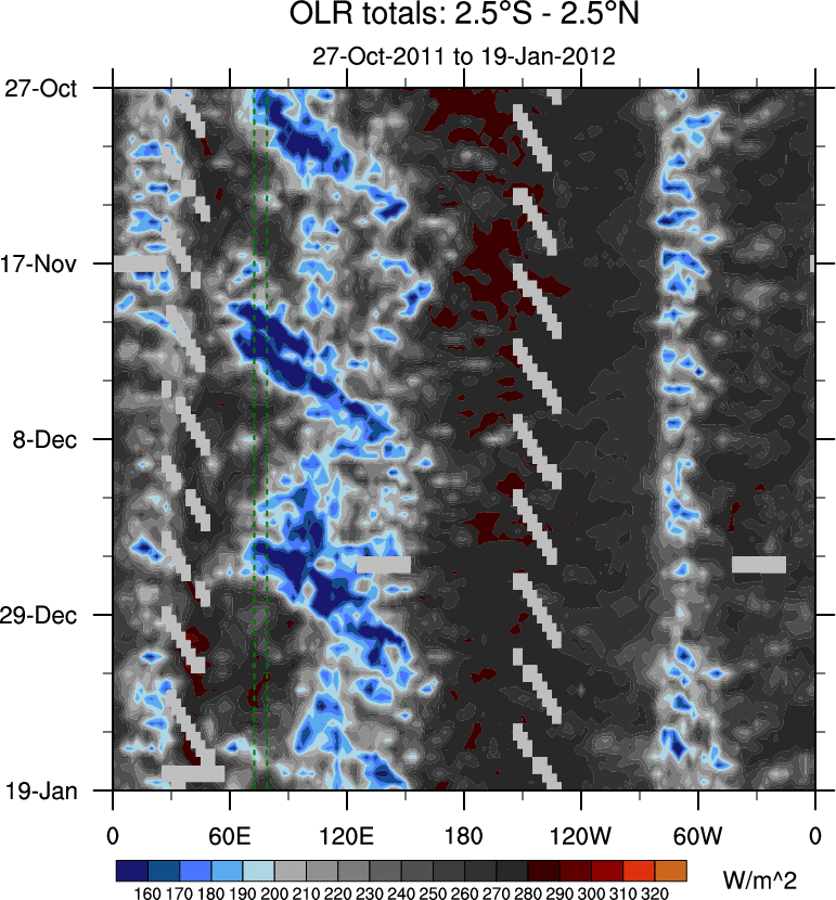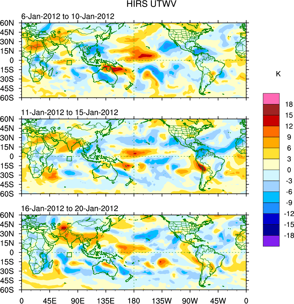 To identify tropical waves in near real-time, the OLR and UTWV data are filtered following Wheeler & Weickmann (2001 MWR). The daily anomalies are calculated using the first 3 harmonics of the seasonal cycle for 1979–2009. Missing values are then filled using linear interpolation in space and time. The most recent 365 days of anomalies are padded with 659 days of zeroes, and the result is filtered for each wave type.