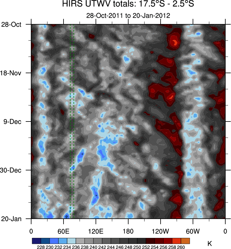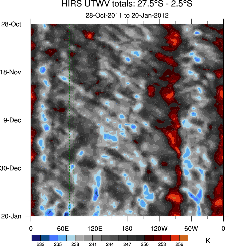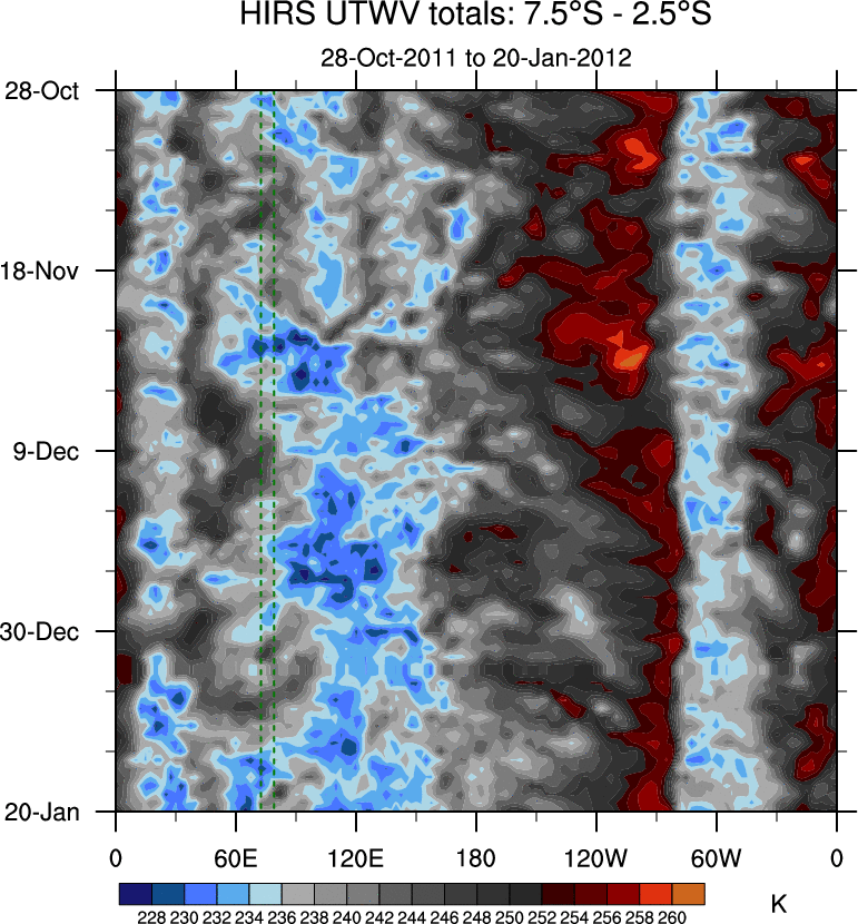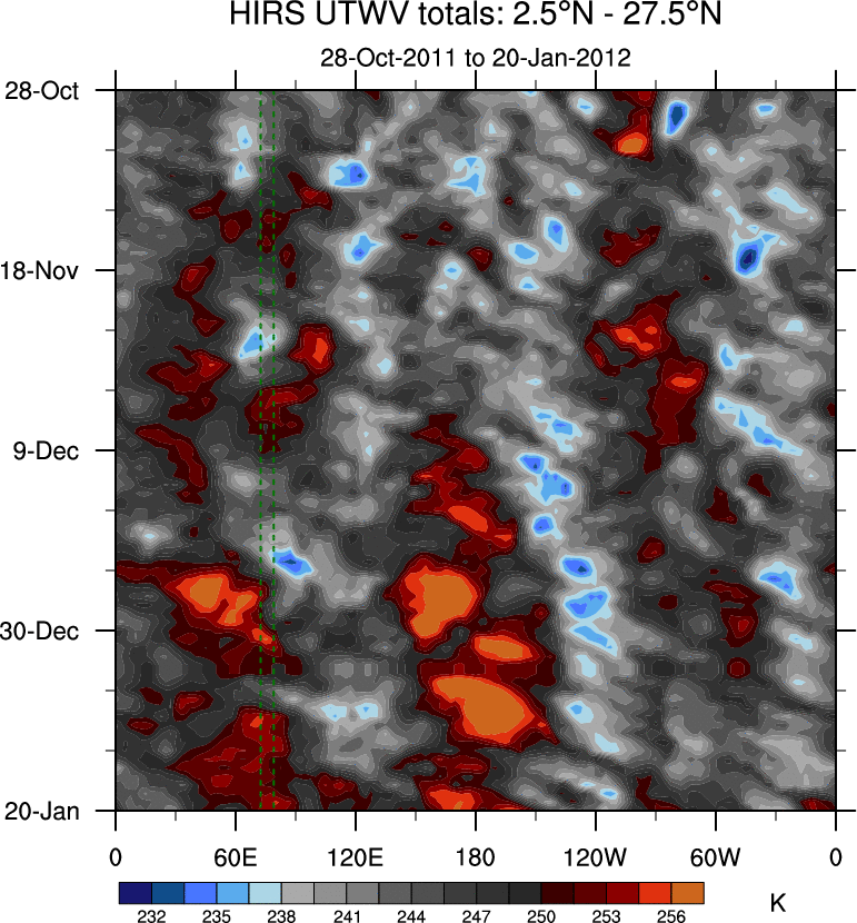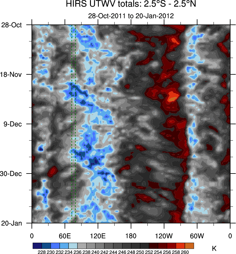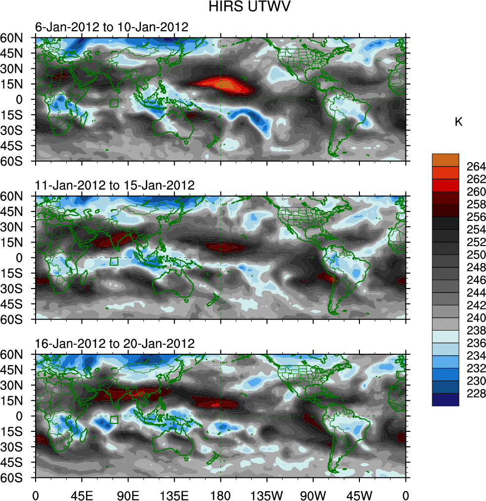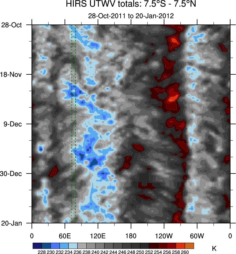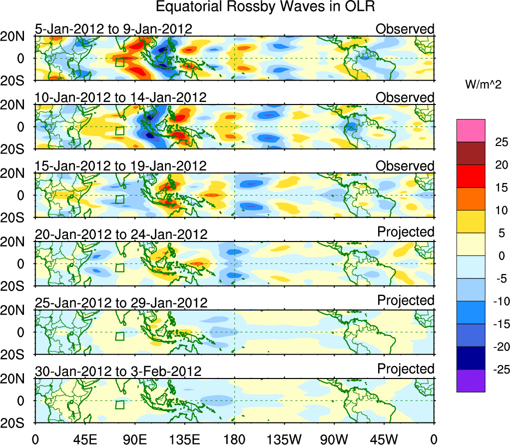 To identify tropical waves in near real-time, the OLR and UTWV data are filtered following Wheeler & Weickmann (2001 MWR). The daily anomalies are calculated using the first 3 harmonics of the seasonal cycle for 1979–2009. Missing values are then filled using linear interpolation in space and time. The most recent 365 days of anomalies are padded with 659 days of zeroes, and the result is filtered for each wave type.