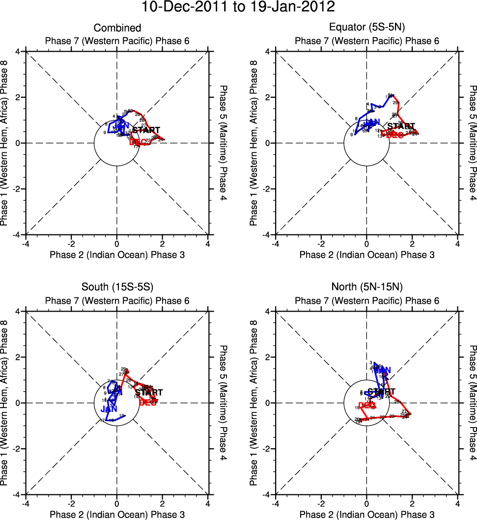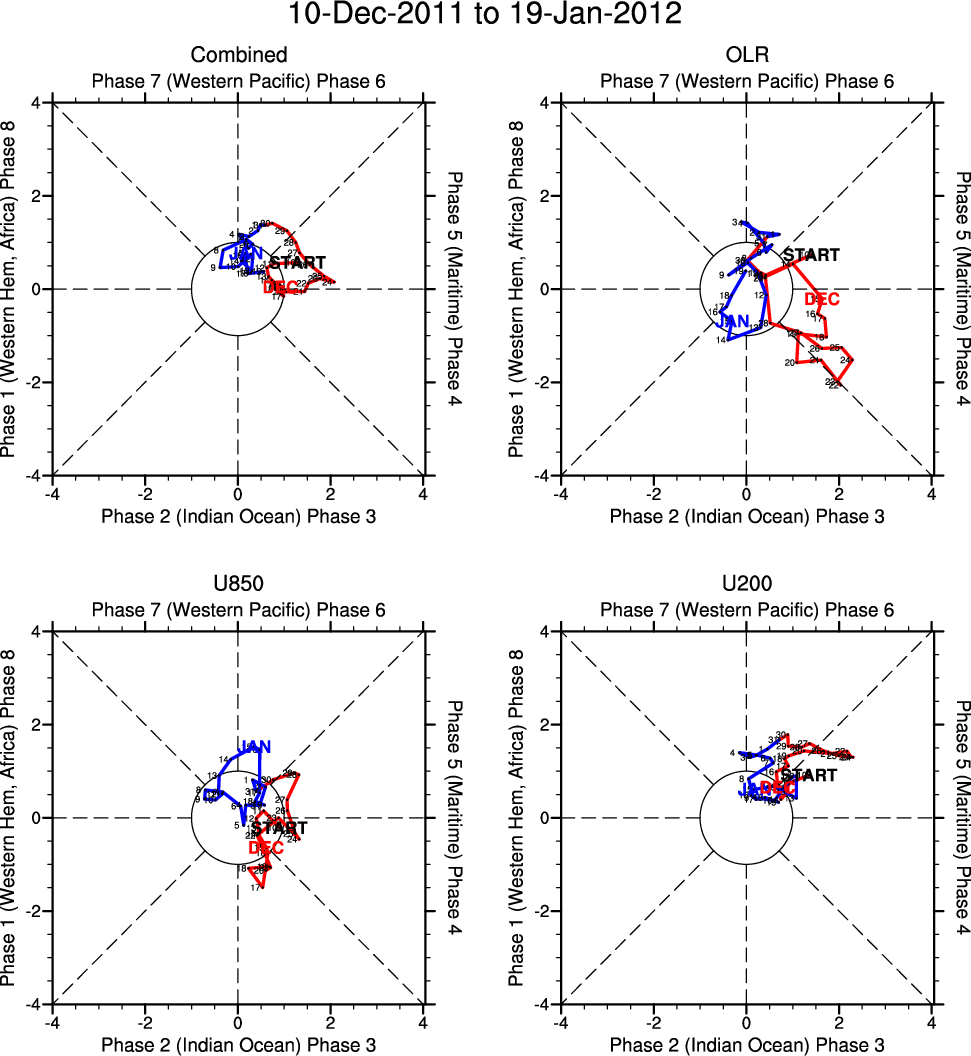 Wheeler and Hendon (2004) constructed the RMM index for monitoring the MJO. This index consists of the first two principal components (PCs) of OLR, 850-hPa zonal wind, and 200-hPa zonal wind averaged 15S-15N.