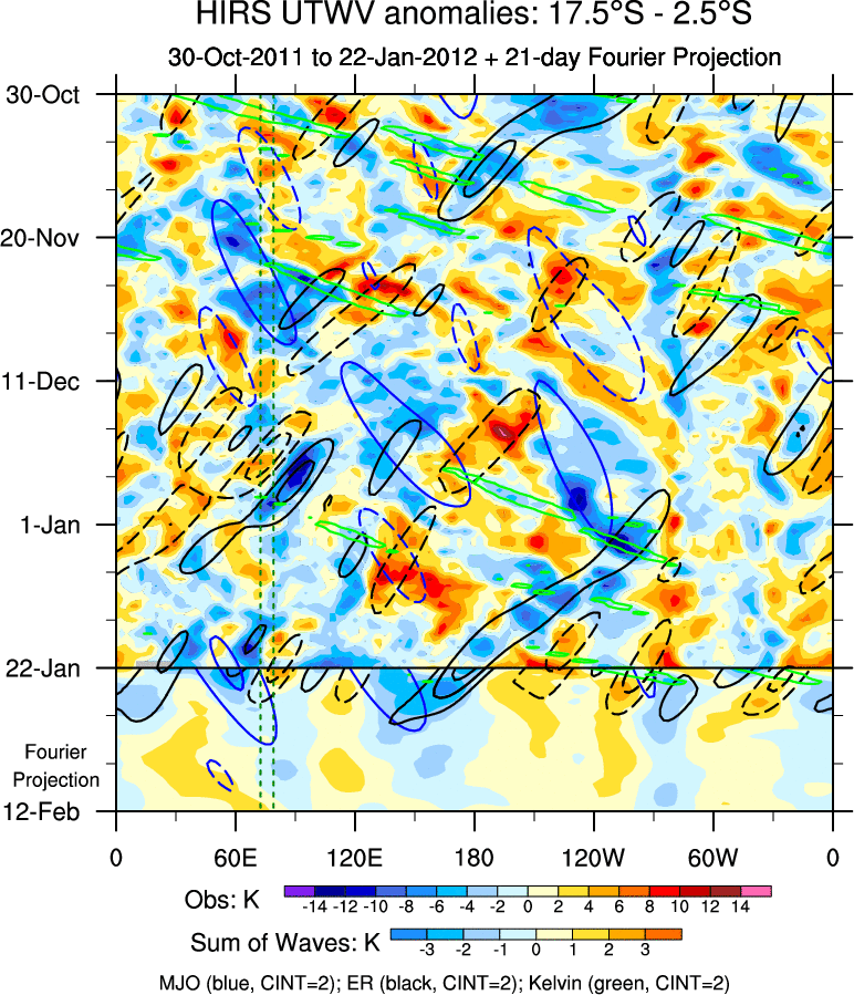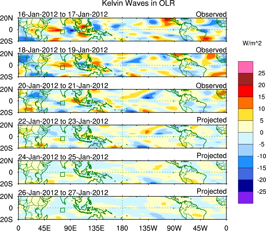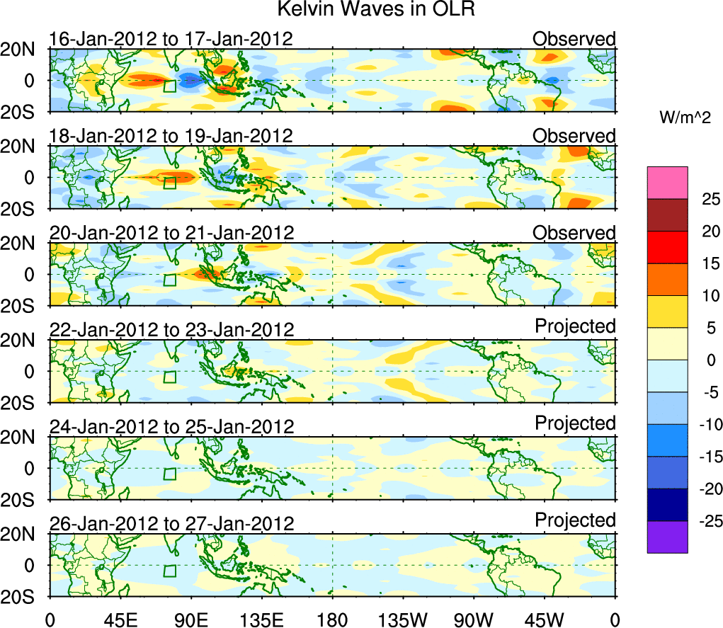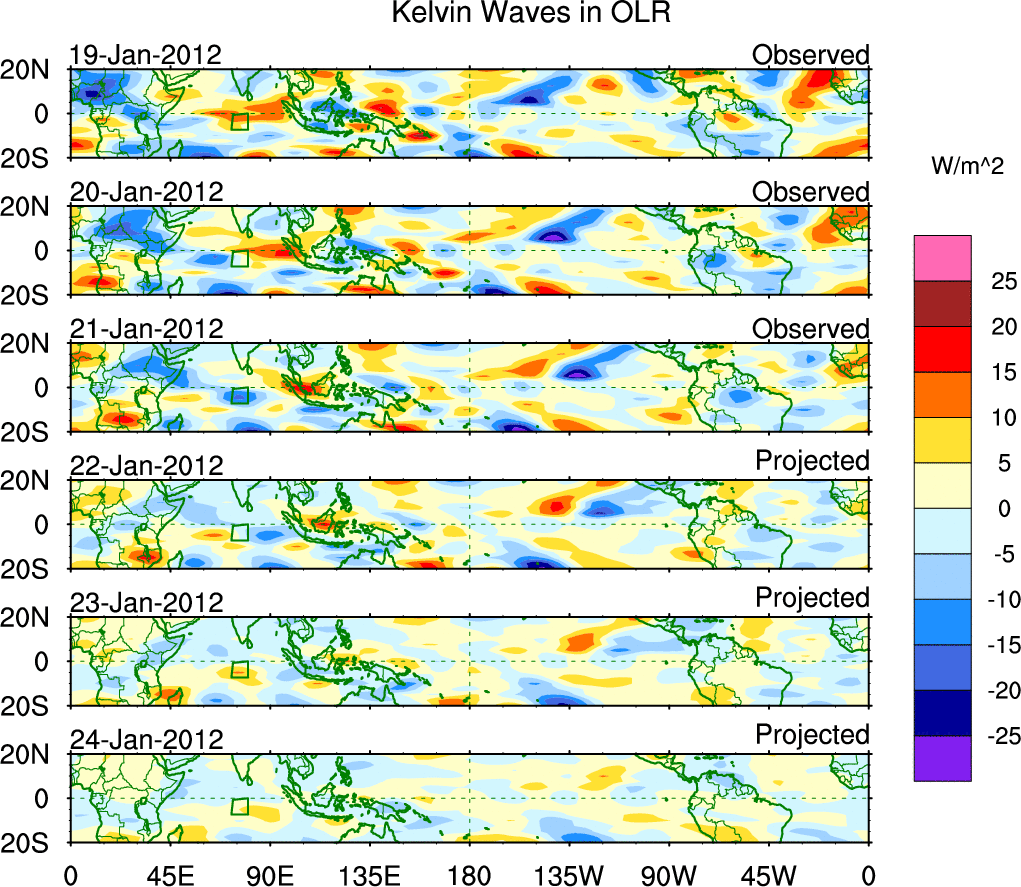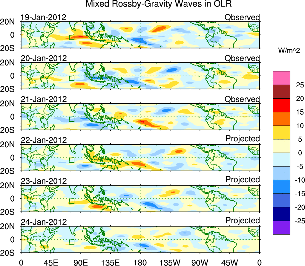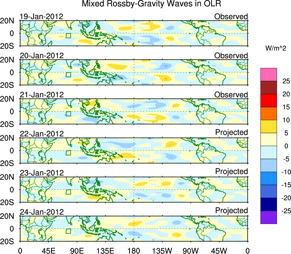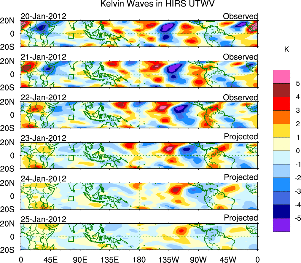 To identify tropical waves in near real-time, the OLR and UTWV data are filtered following Wheeler & Weickmann (2001 MWR). The daily anomalies are calculated using the first 3 harmonics of the seasonal cycle for 1979–2009. Missing values are then filled using linear interpolation in space and time. The most recent 365 days of anomalies are padded with 659 days of zeroes, and the result is filtered for each wave type.