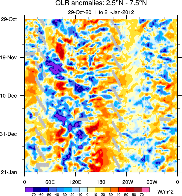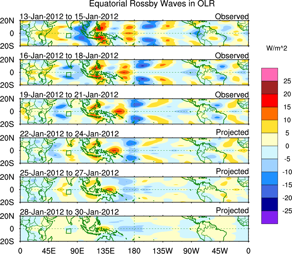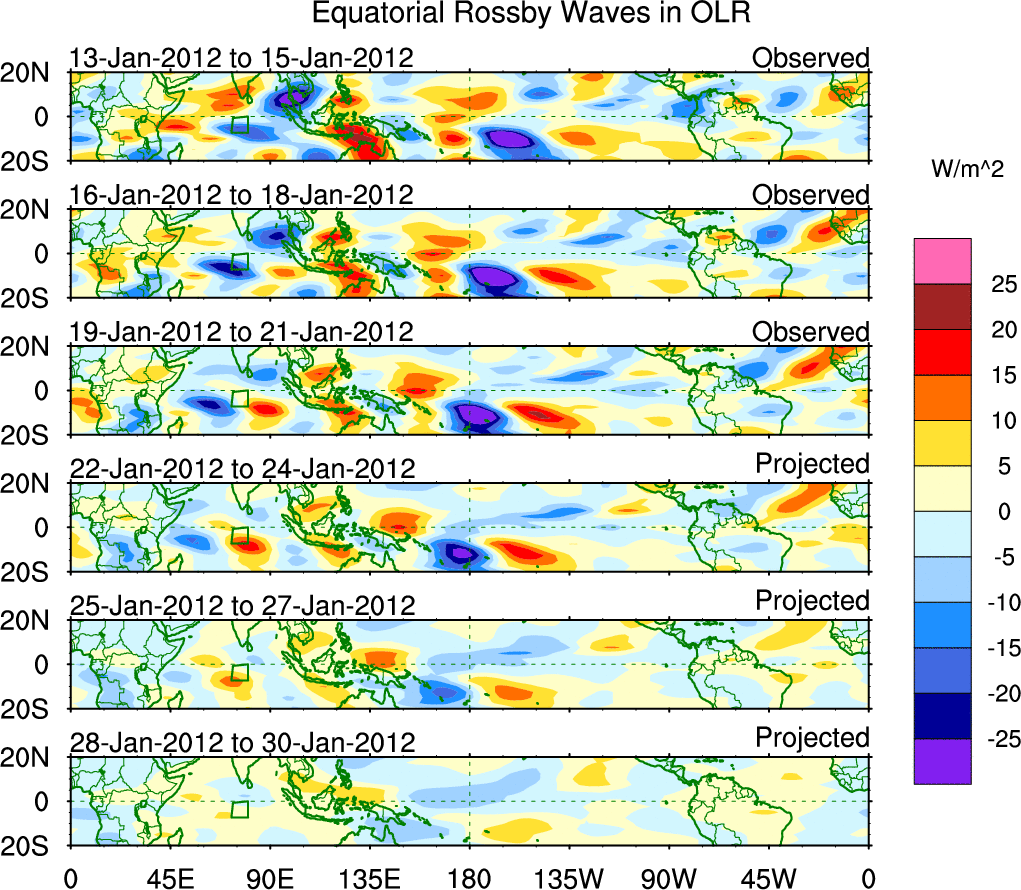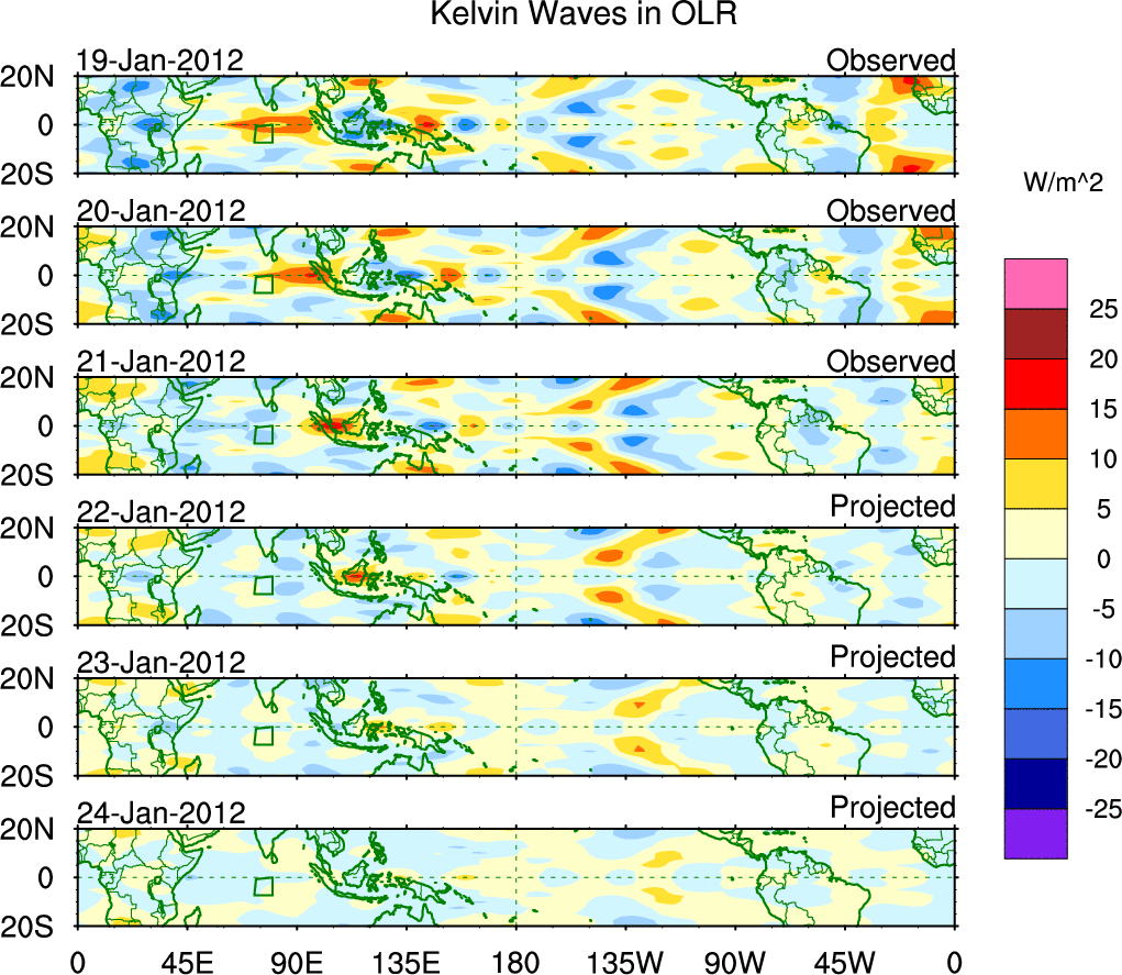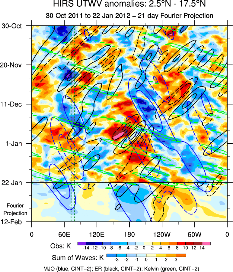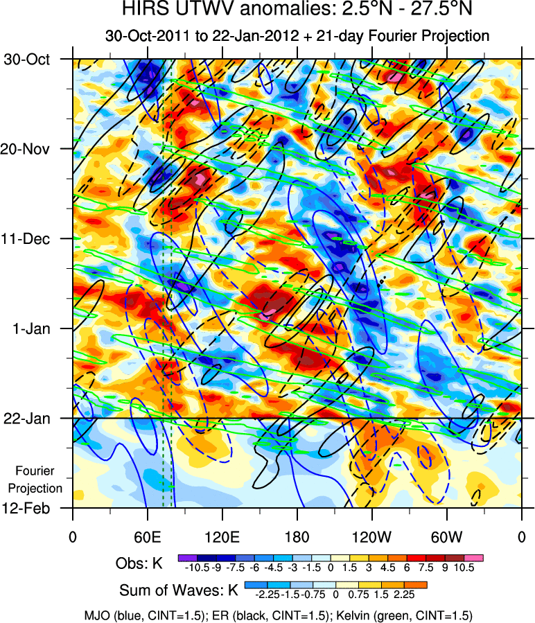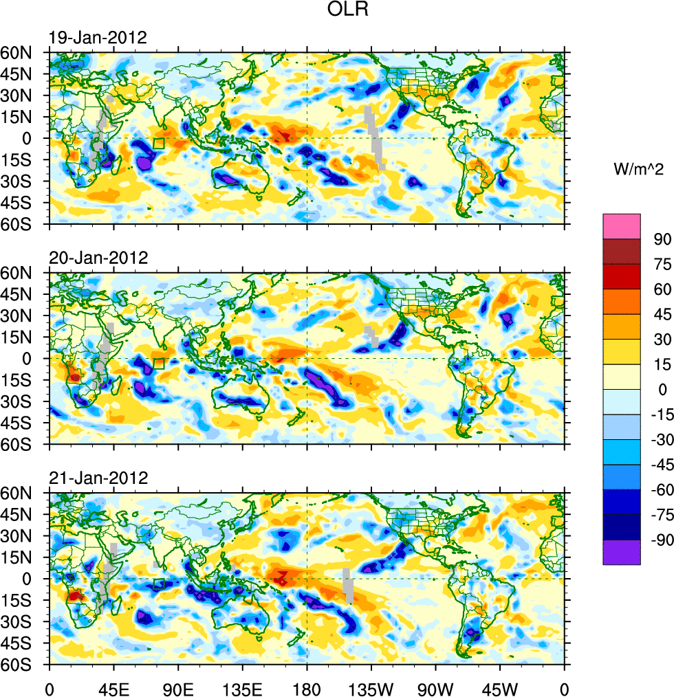 To identify tropical waves in near real-time, the OLR and UTWV data are filtered following Wheeler & Weickmann (2001 MWR). The daily anomalies are calculated using the first 3 harmonics of the seasonal cycle for 1979–2009. Missing values are then filled using linear interpolation in space and time. The most recent 365 days of anomalies are padded with 659 days of zeroes, and the result is filtered for each wave type.