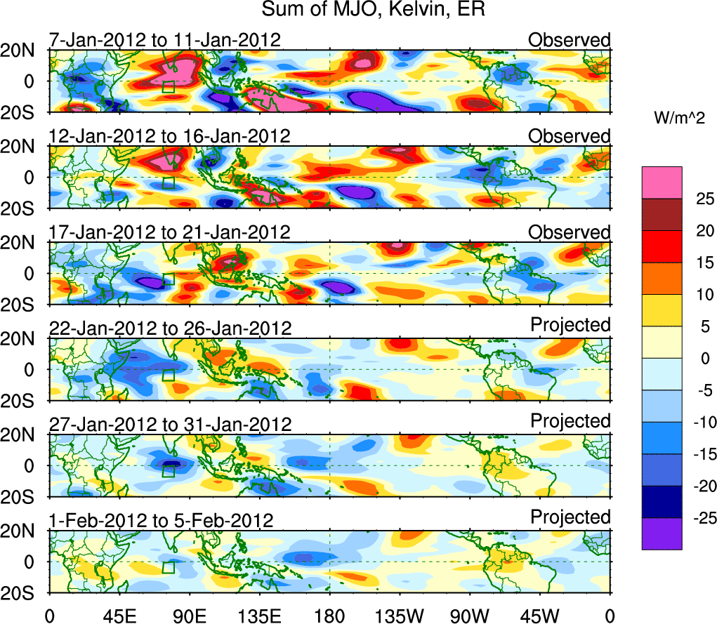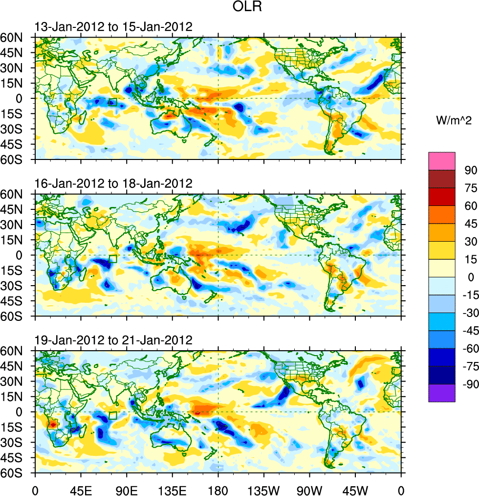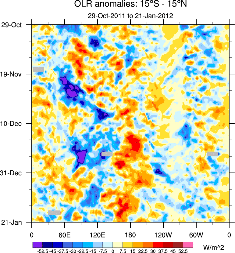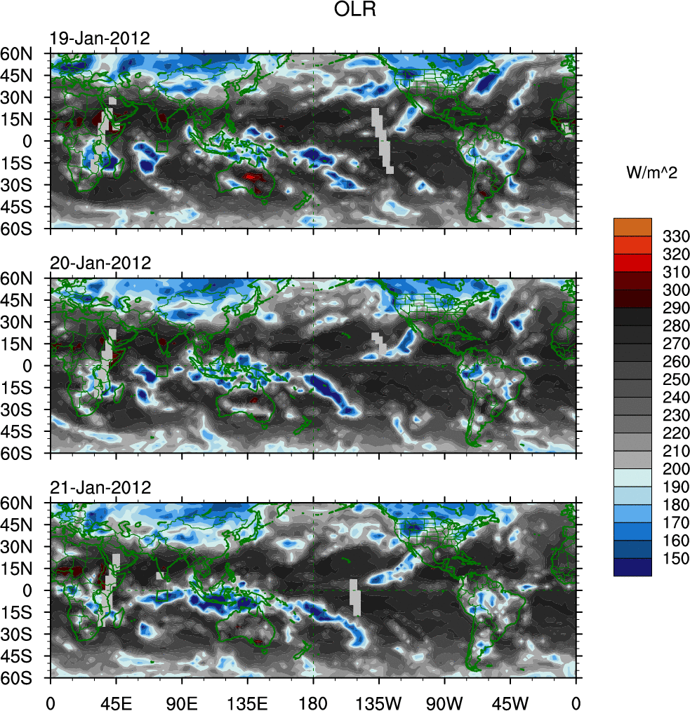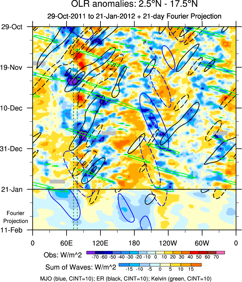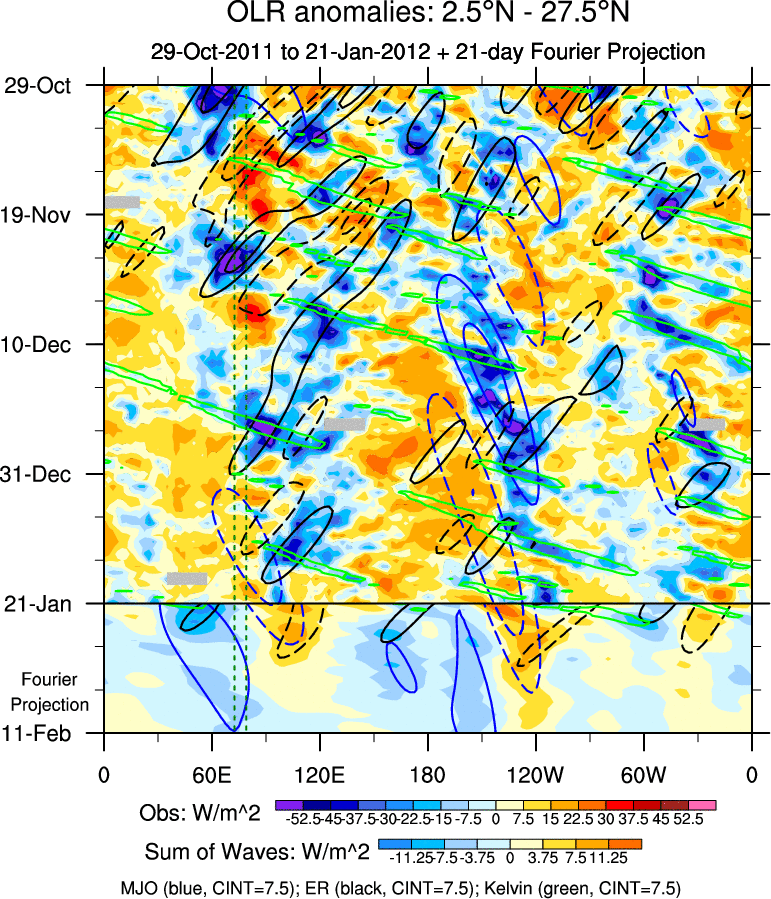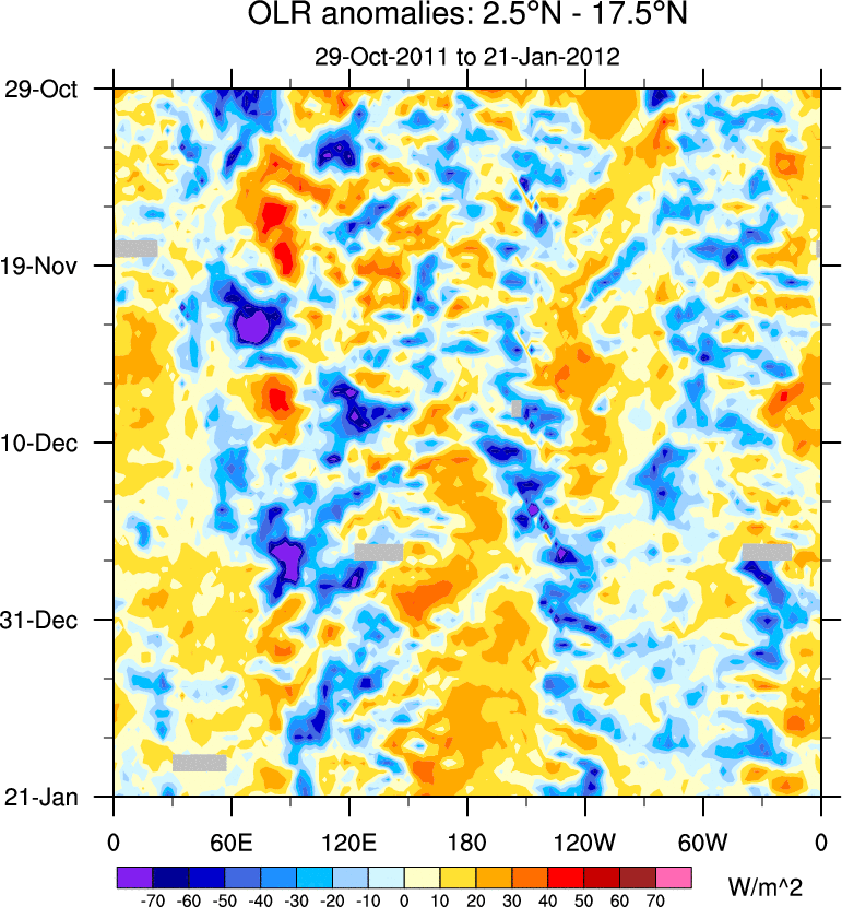 To identify tropical waves in near real-time, the OLR and UTWV data are filtered following Wheeler & Weickmann (2001 MWR). The daily anomalies are calculated using the first 3 harmonics of the seasonal cycle for 1979–2009. Missing values are then filled using linear interpolation in space and time. The most recent 365 days of anomalies are padded with 659 days of zeroes, and the result is filtered for each wave type.