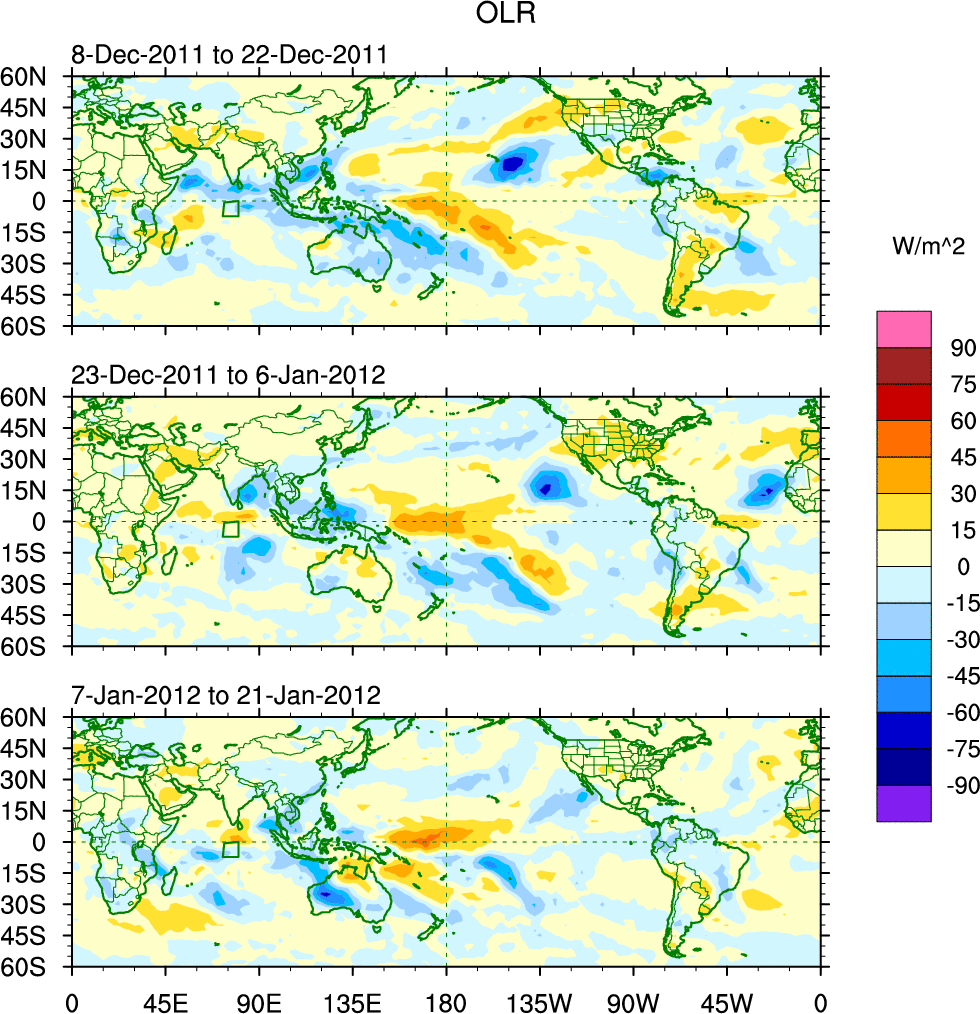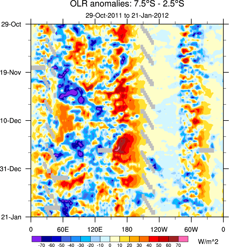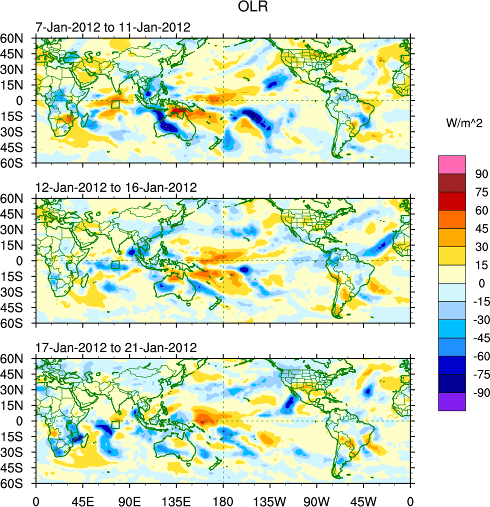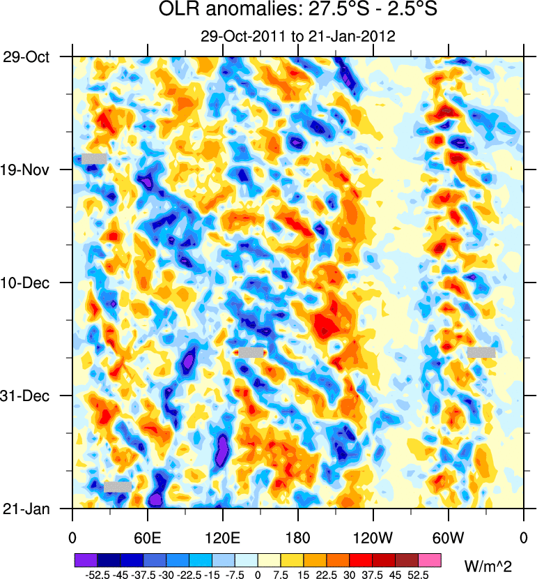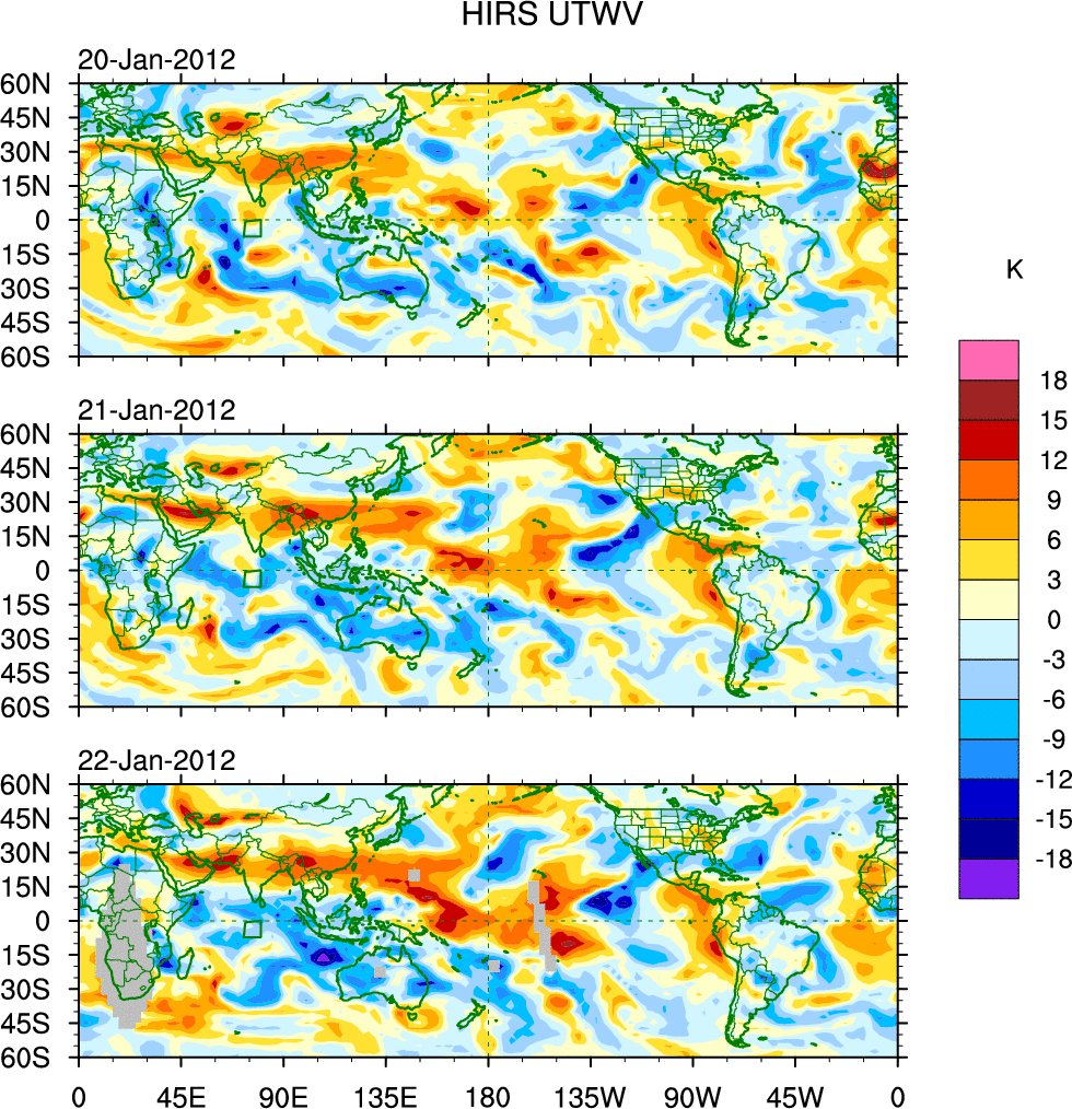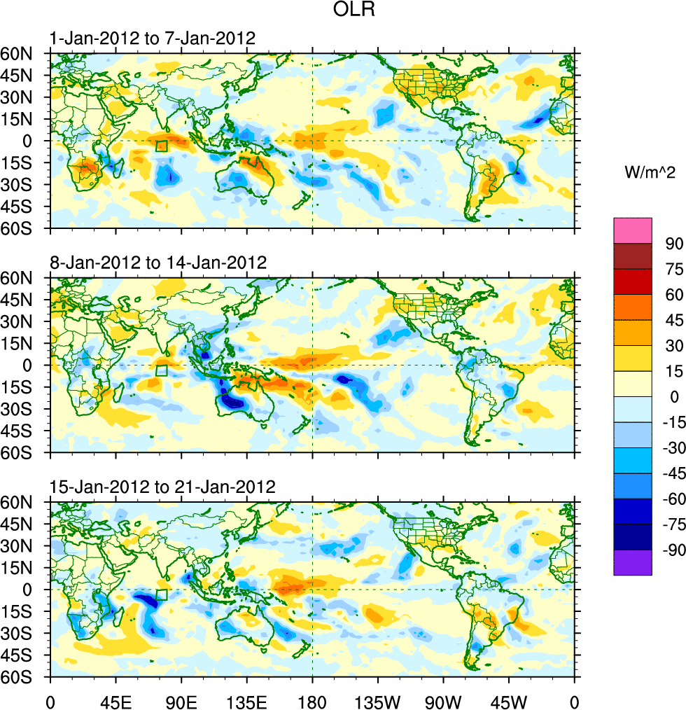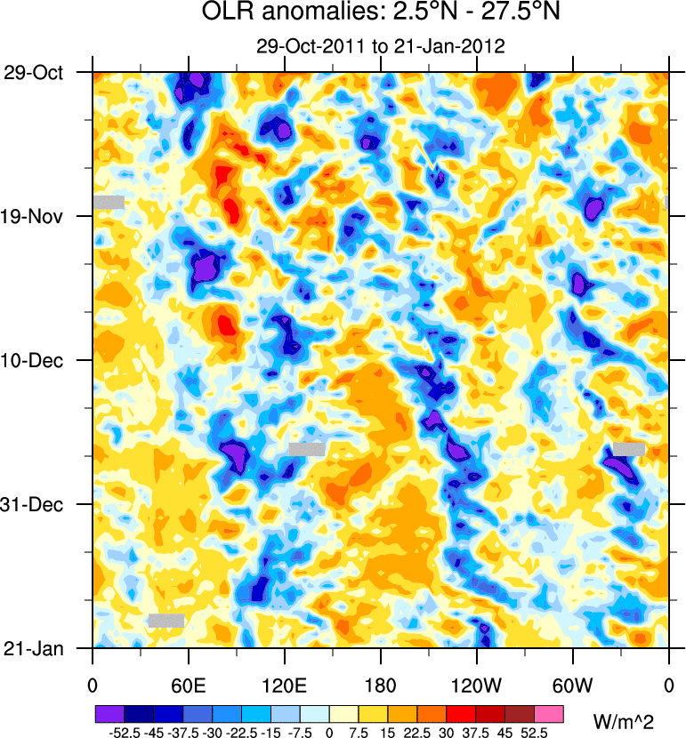To identify tropical waves in near real-time, the OLR and UTWV data are filtered following Wheeler & Weickmann (2001 MWR). The daily anomalies are calculated using the first 3 harmonics of the seasonal cycle for 1979–2009. Missing values are then filled using linear interpolation in space and time. The most recent 365 days of anomalies are padded with 659 days of zeroes, and the result is filtered for each wave type.