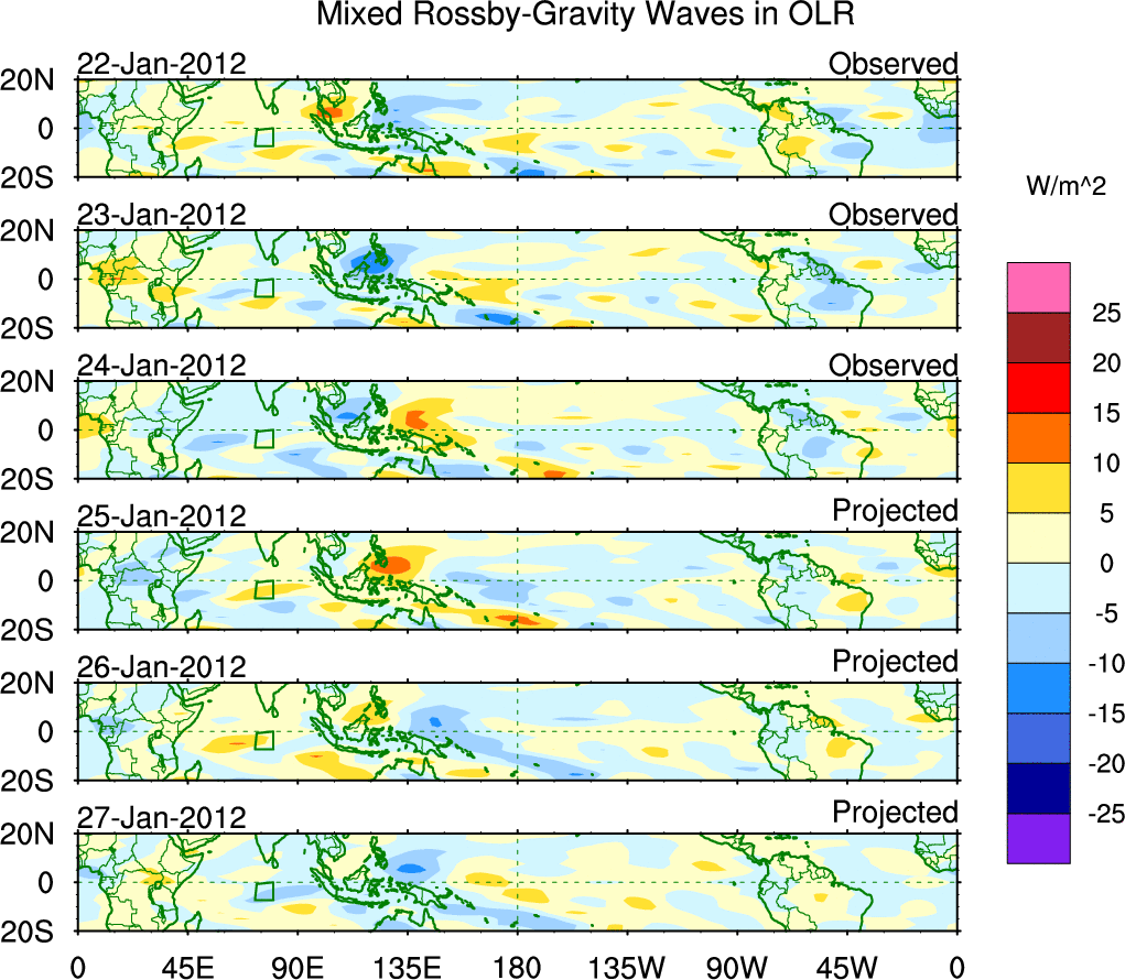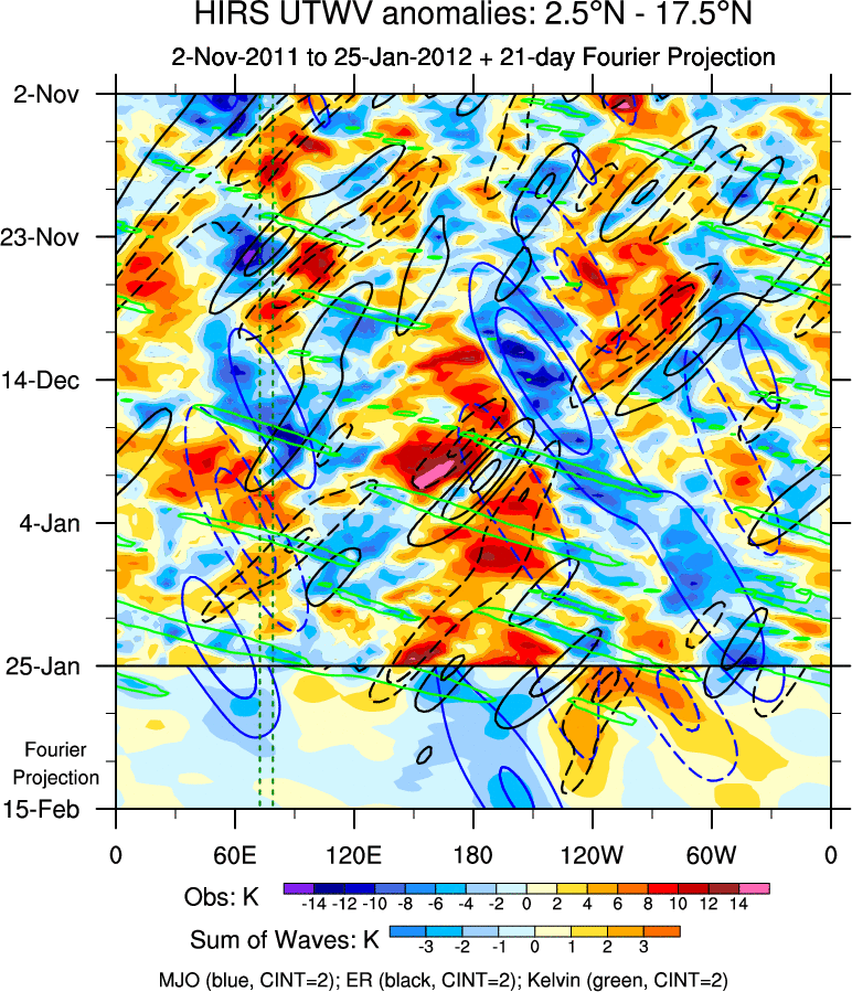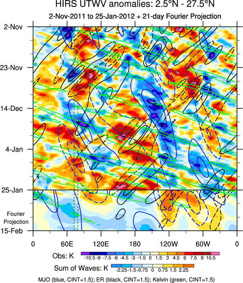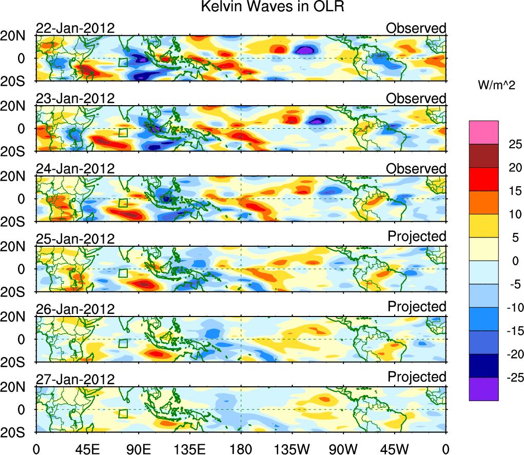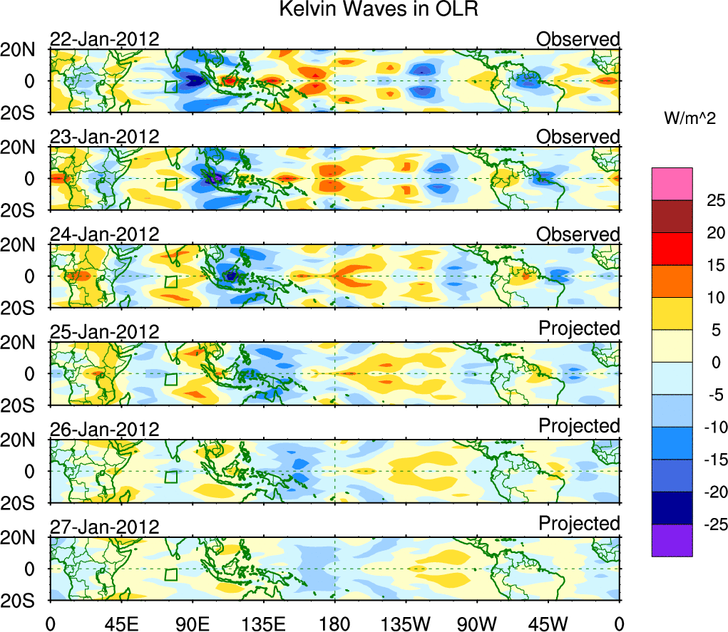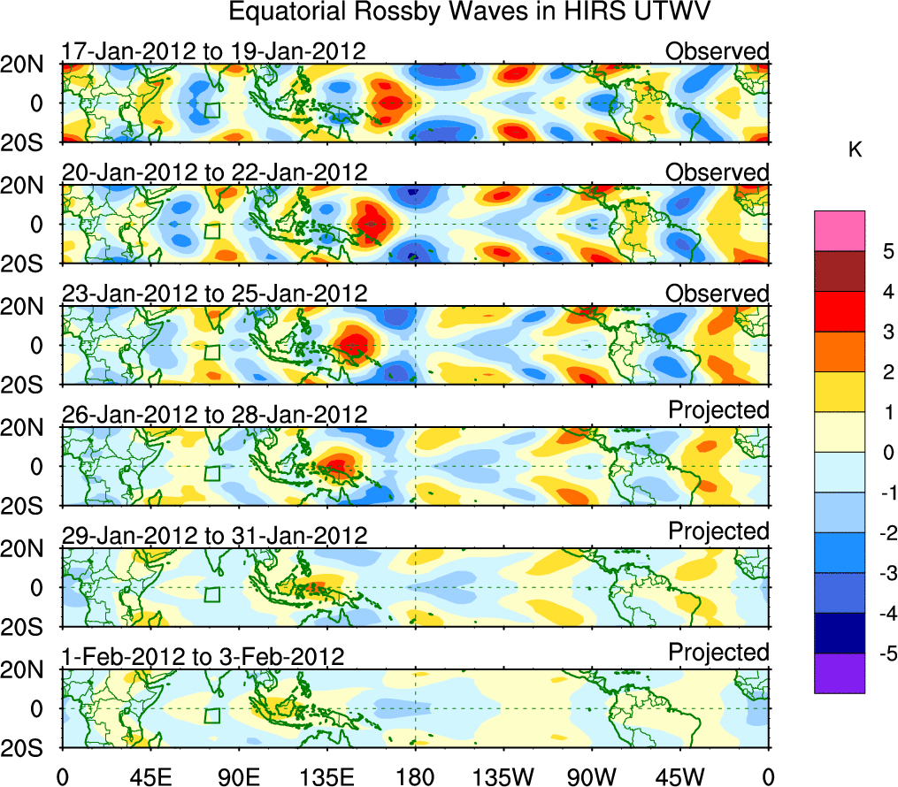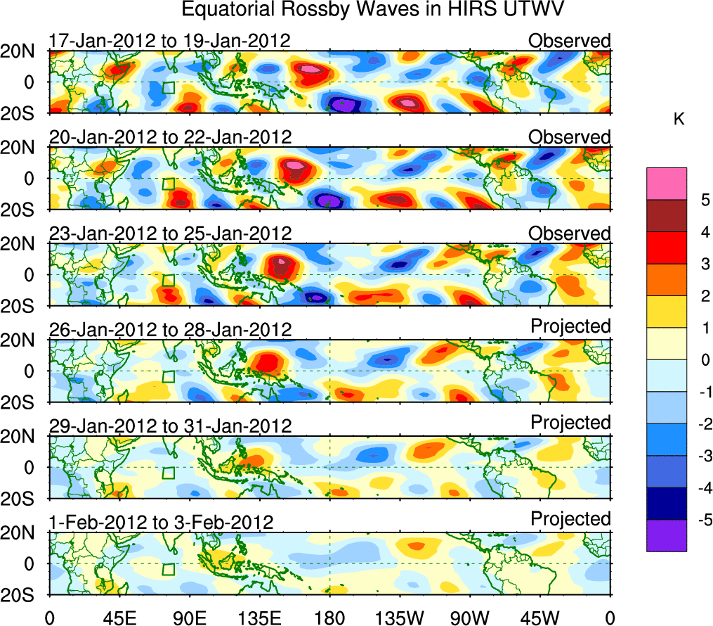 To identify tropical waves in near real-time, the OLR and UTWV data are filtered following Wheeler & Weickmann (2001 MWR). The daily anomalies are calculated using the first 3 harmonics of the seasonal cycle for 1979–2009. Missing values are then filled using linear interpolation in space and time. The most recent 365 days of anomalies are padded with 659 days of zeroes, and the result is filtered for each wave type.