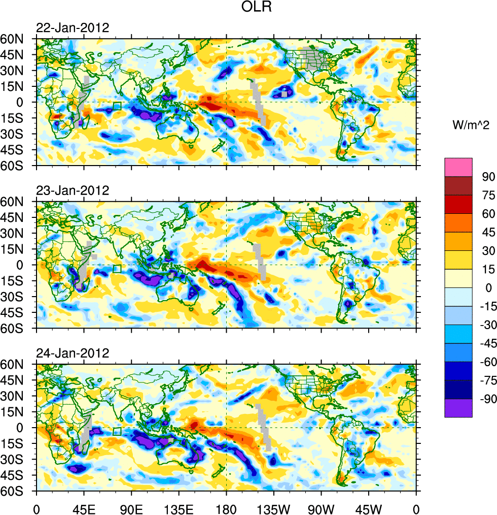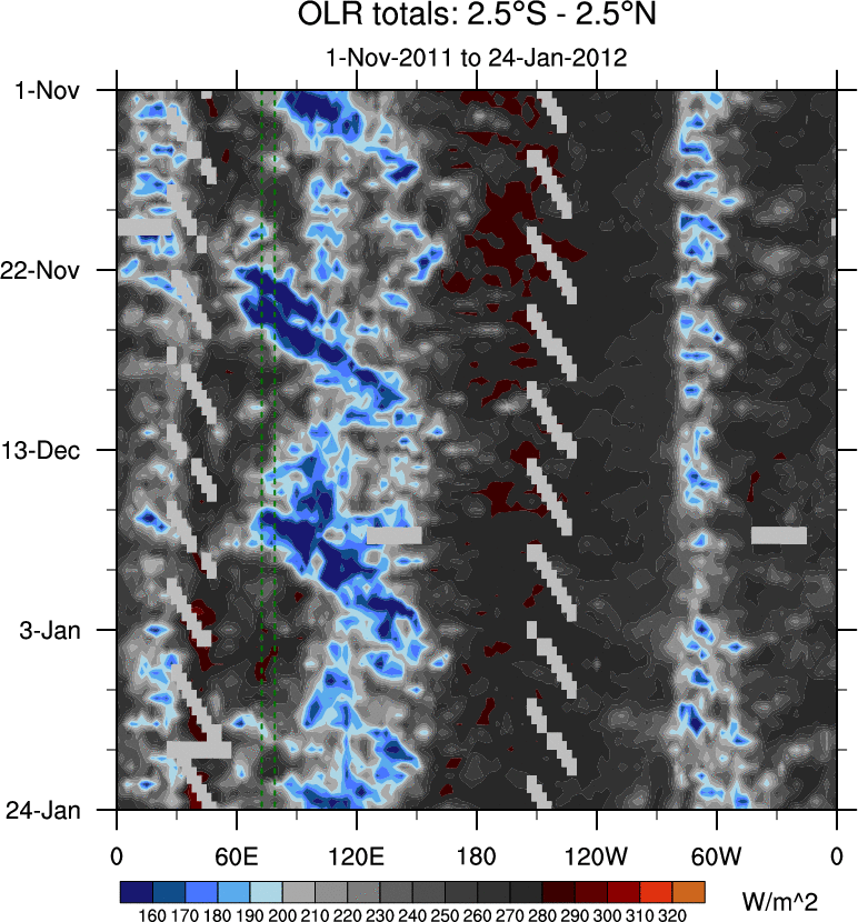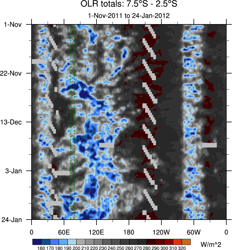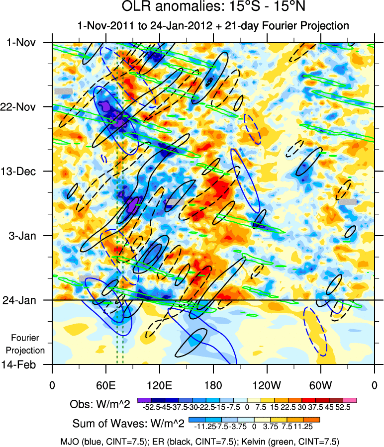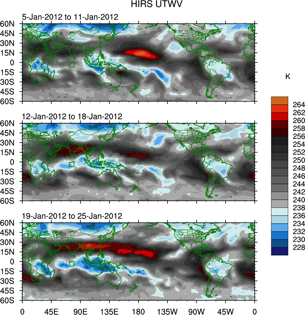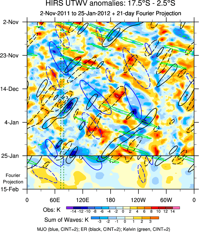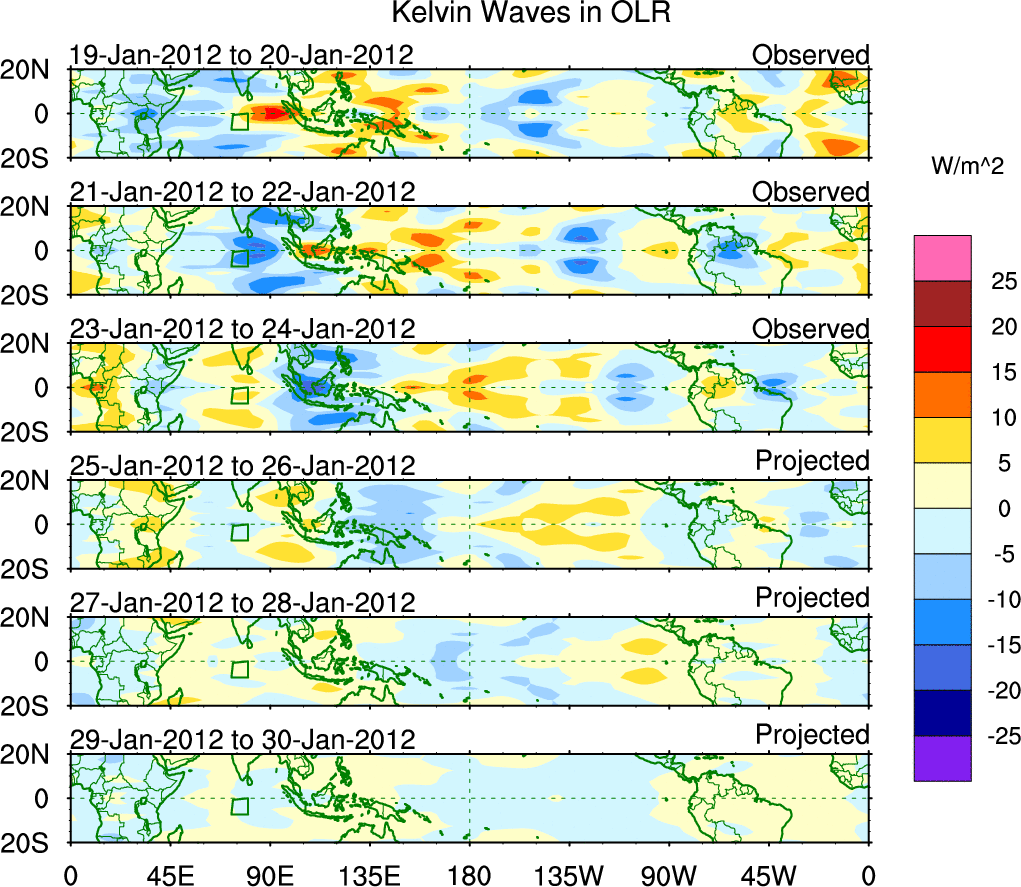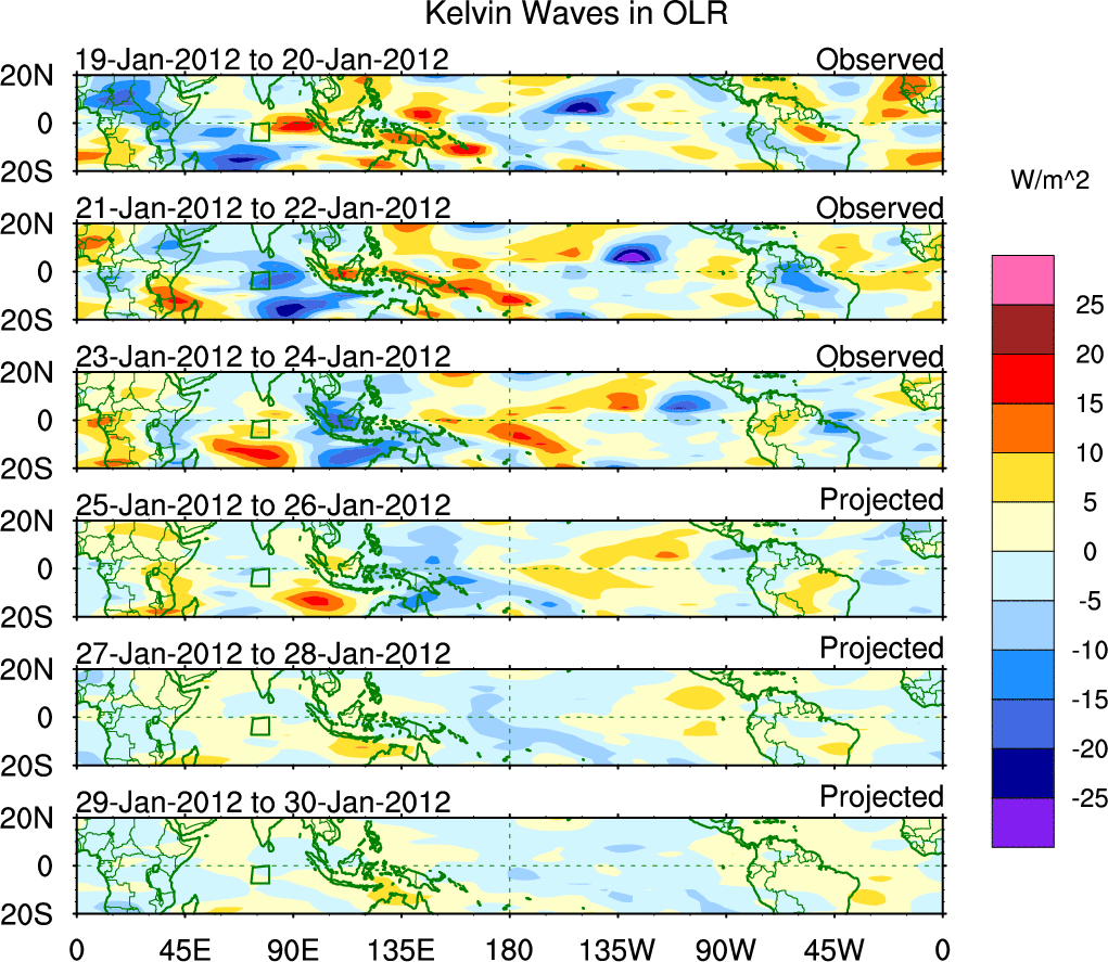 To identify tropical waves in near real-time, the OLR and UTWV data are filtered following Wheeler & Weickmann (2001 MWR). The daily anomalies are calculated using the first 3 harmonics of the seasonal cycle for 1979–2009. Missing values are then filled using linear interpolation in space and time. The most recent 365 days of anomalies are padded with 659 days of zeroes, and the result is filtered for each wave type.