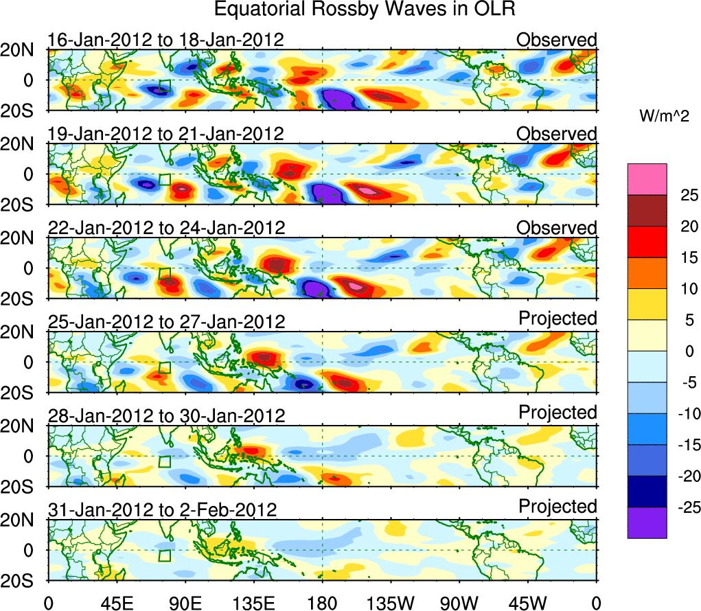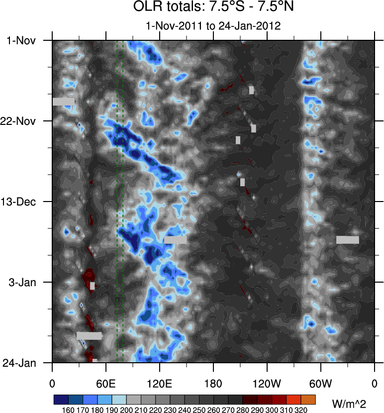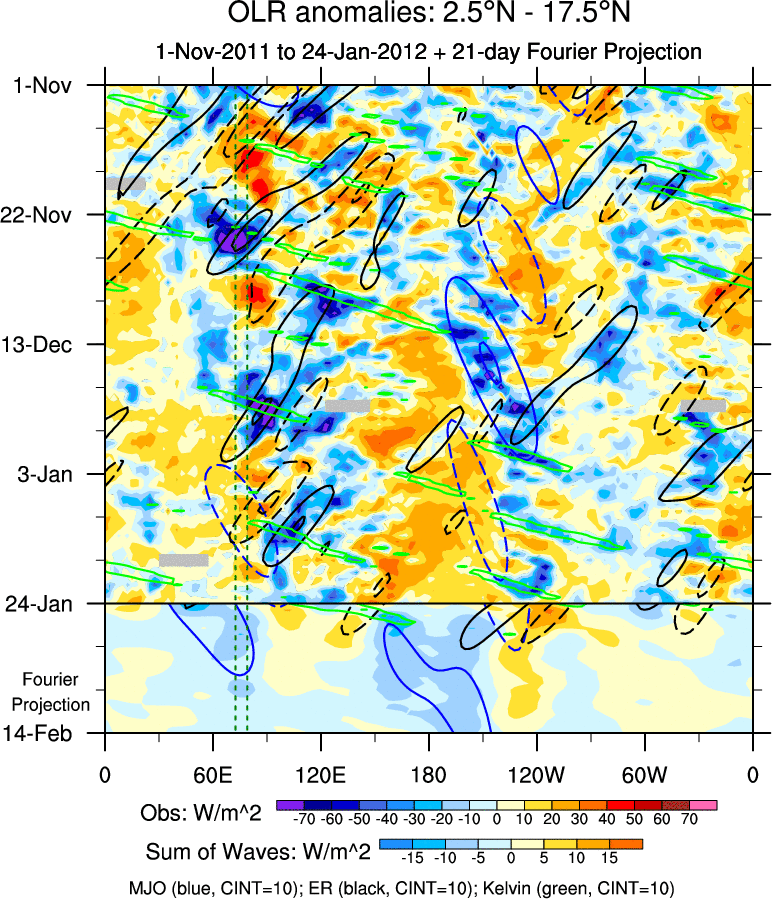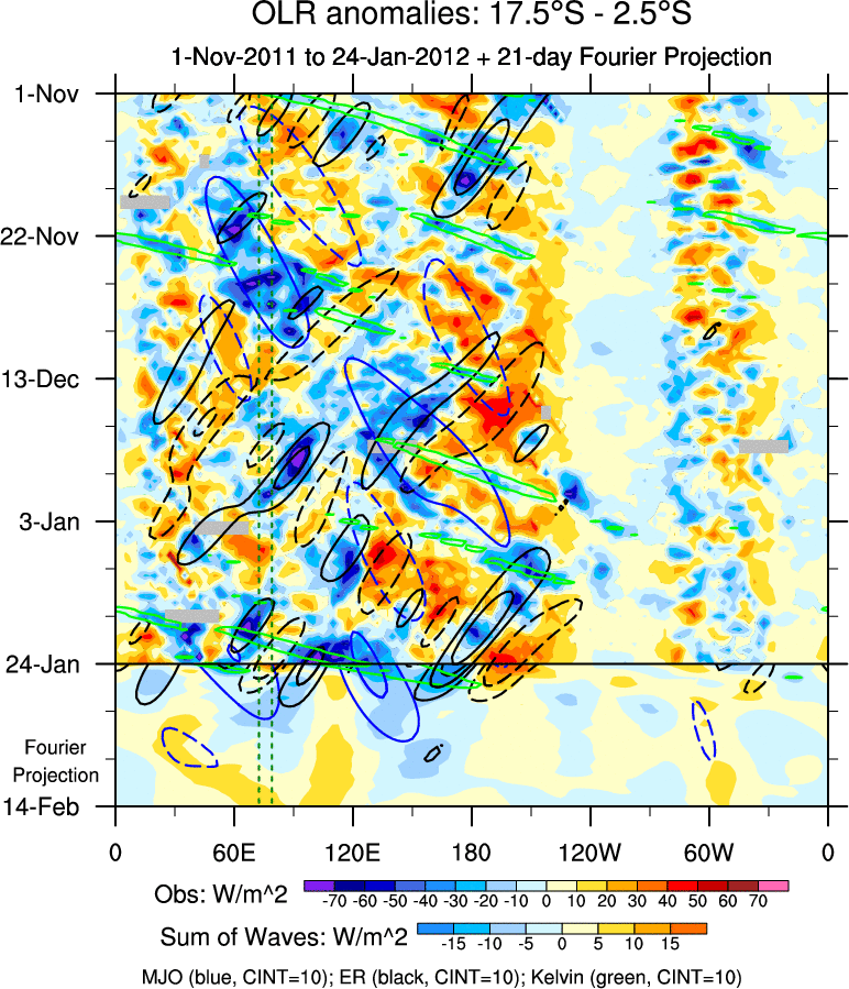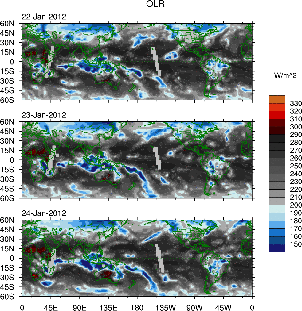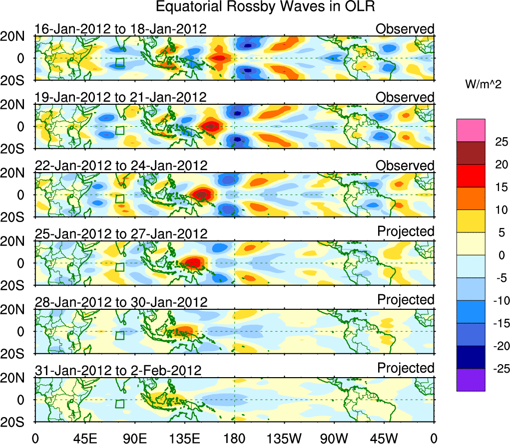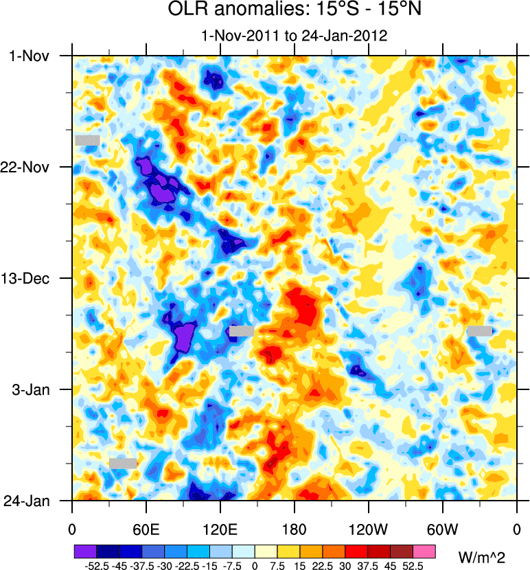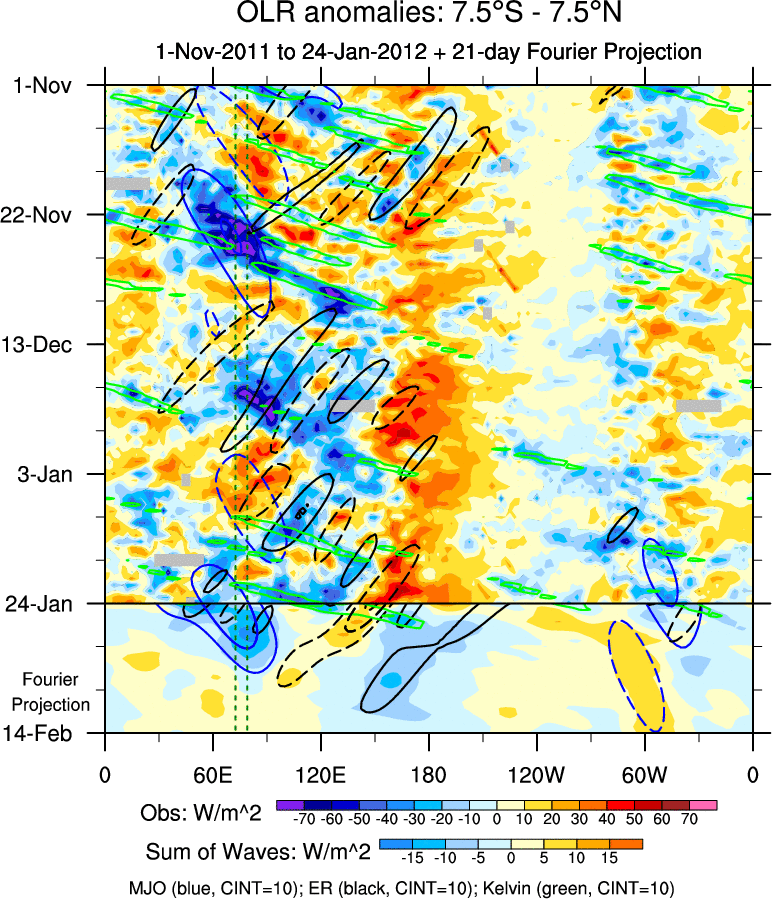 To identify tropical waves in near real-time, the OLR and UTWV data are filtered following Wheeler & Weickmann (2001 MWR). The daily anomalies are calculated using the first 3 harmonics of the seasonal cycle for 1979–2009. Missing values are then filled using linear interpolation in space and time. The most recent 365 days of anomalies are padded with 659 days of zeroes, and the result is filtered for each wave type.