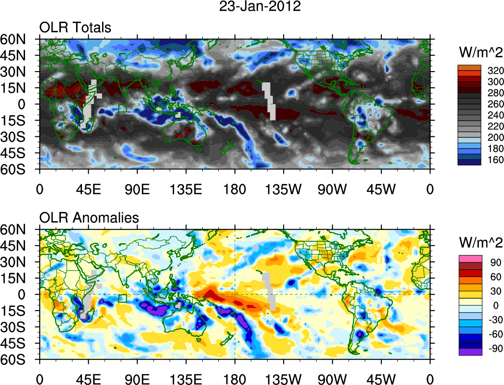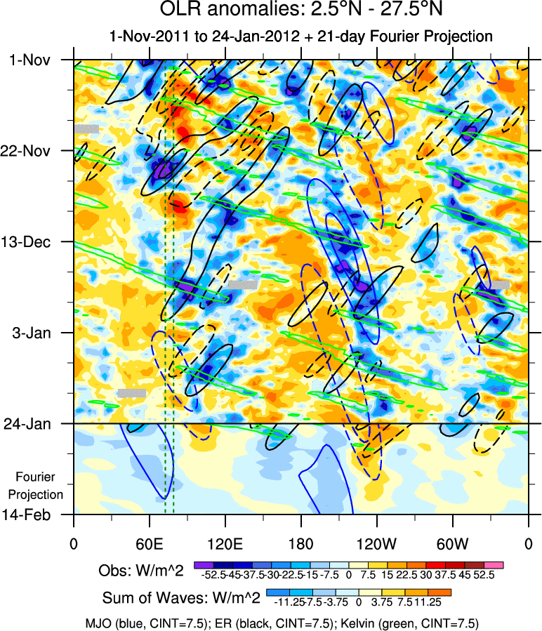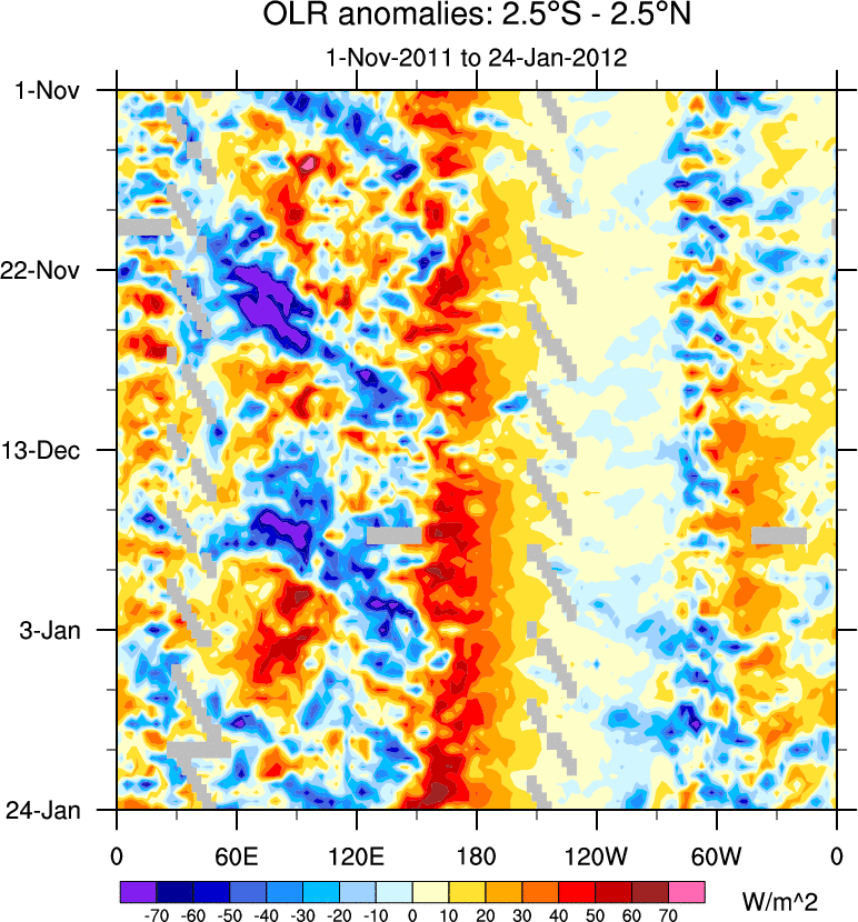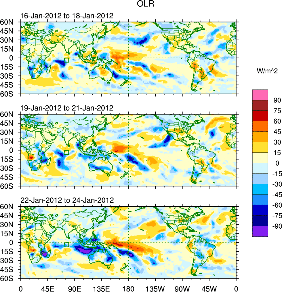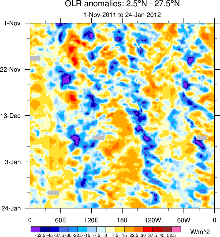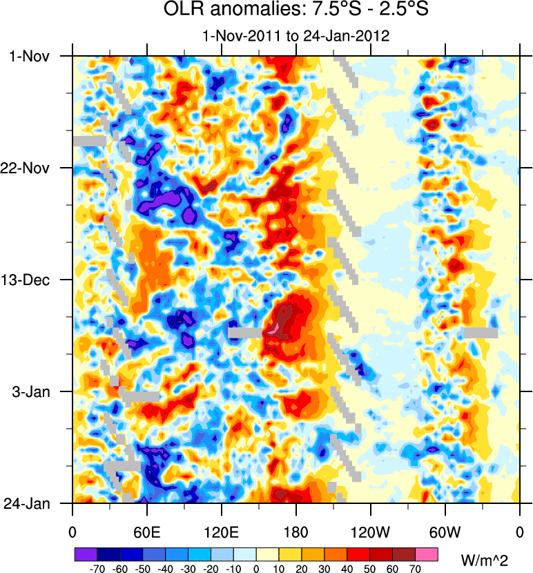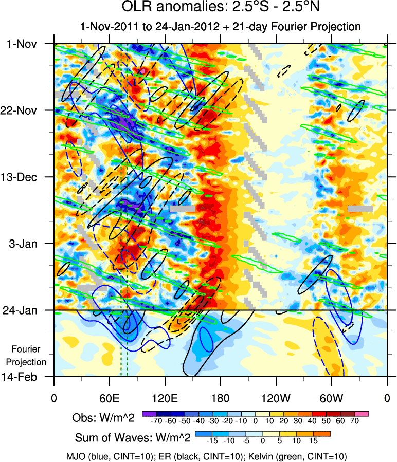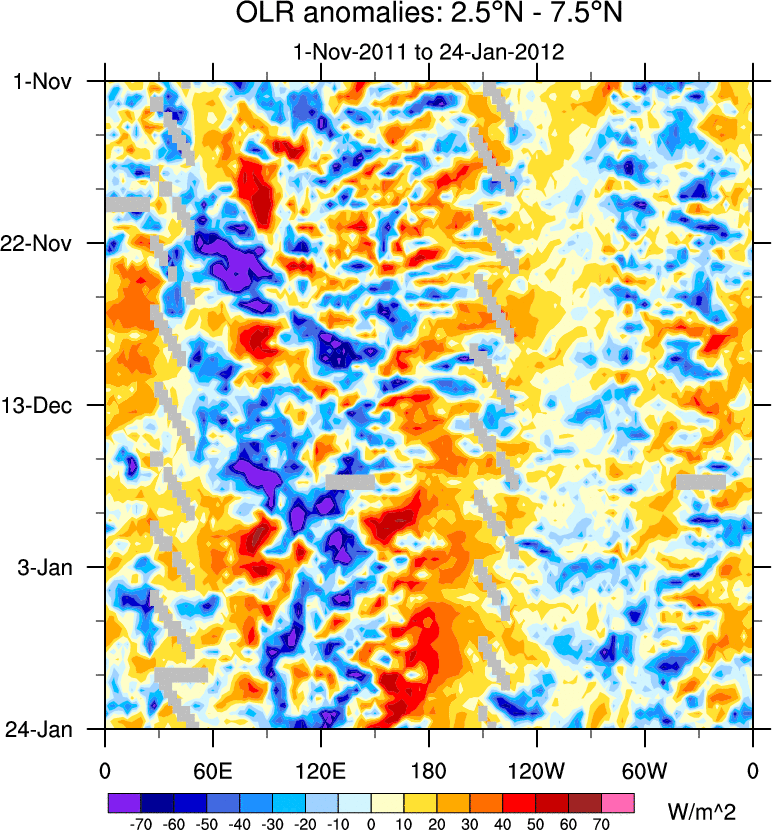 To identify tropical waves in near real-time, the OLR and UTWV data are filtered following Wheeler & Weickmann (2001 MWR). The daily anomalies are calculated using the first 3 harmonics of the seasonal cycle for 1979–2009. Missing values are then filled using linear interpolation in space and time. The most recent 365 days of anomalies are padded with 659 days of zeroes, and the result is filtered for each wave type.