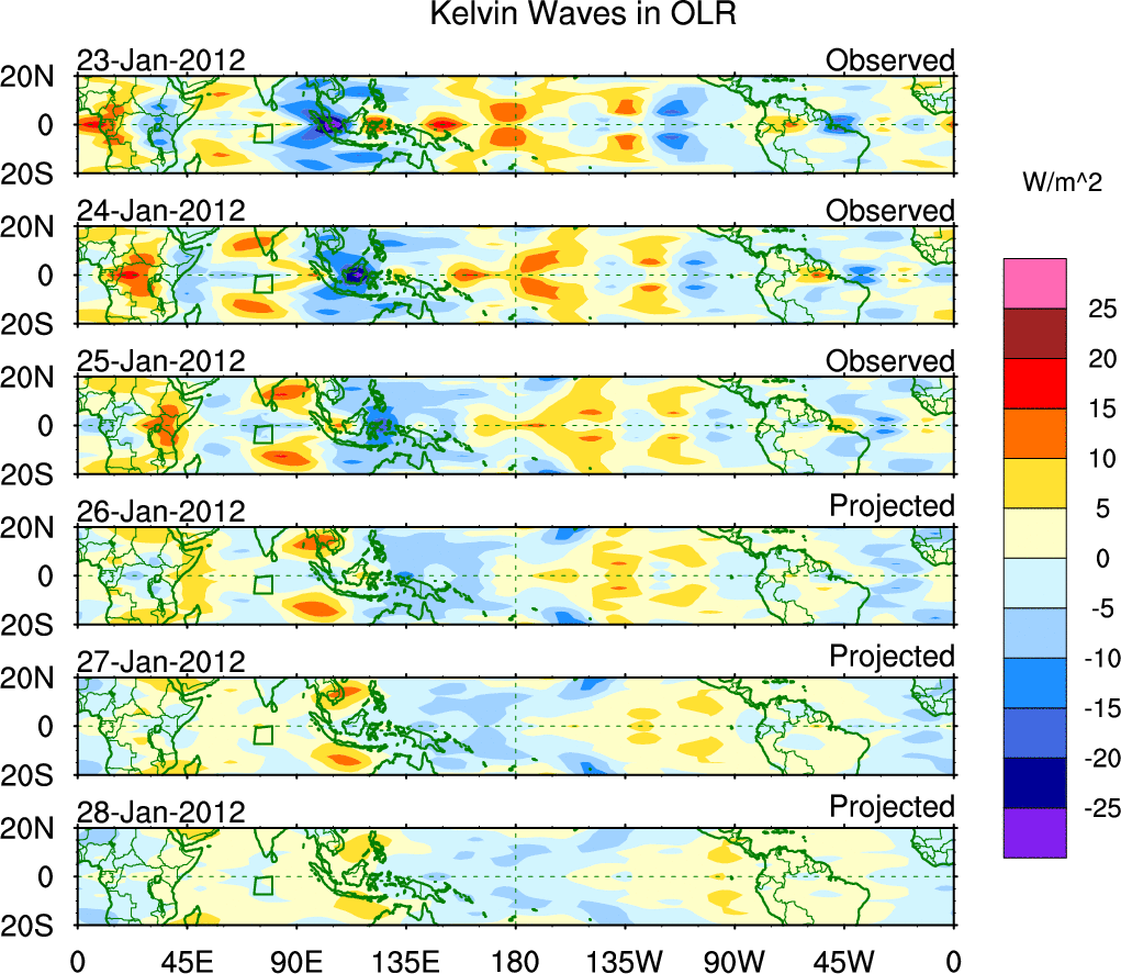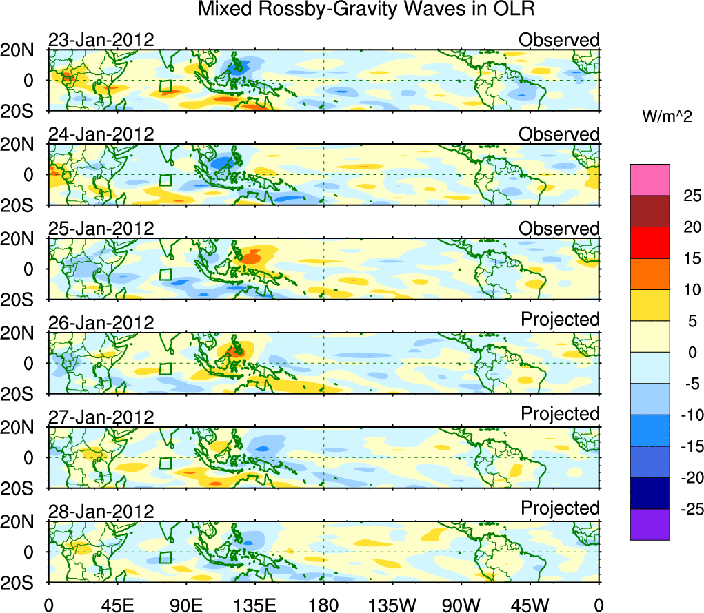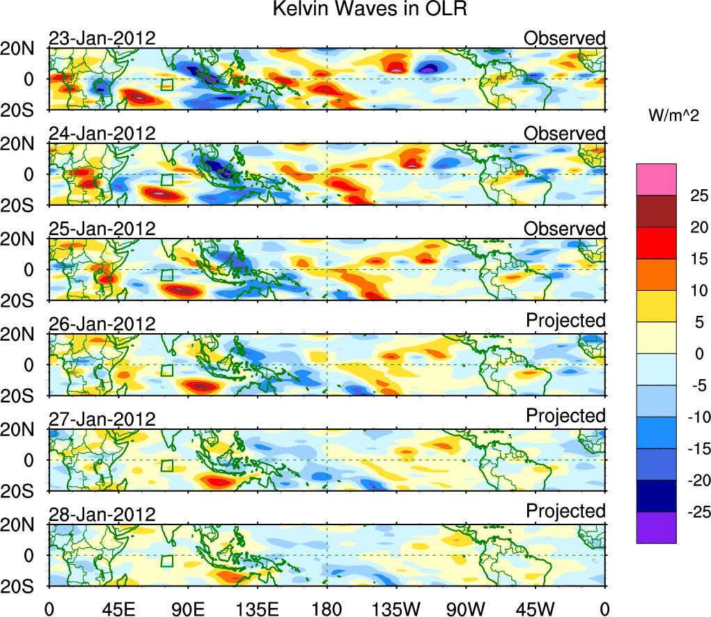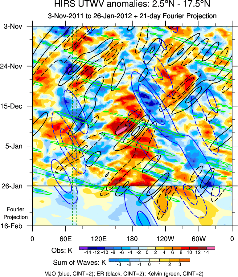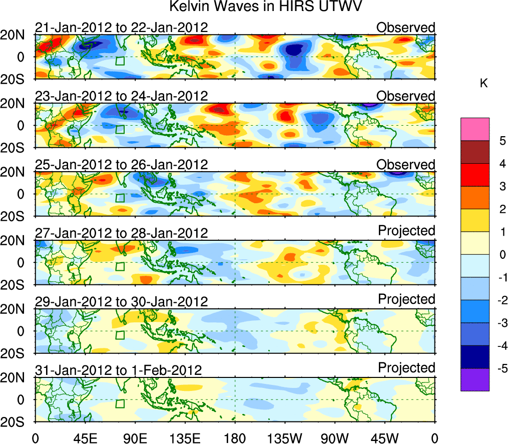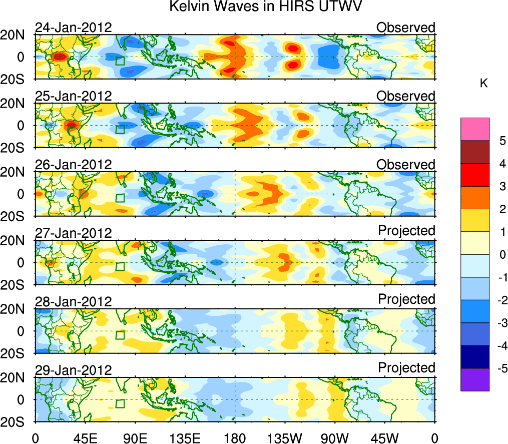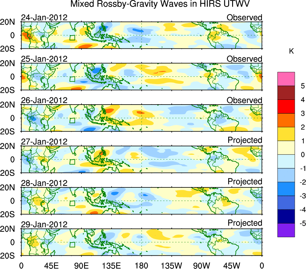 To identify tropical waves in near real-time, the OLR and UTWV data are filtered following Wheeler & Weickmann (2001 MWR). The daily anomalies are calculated using the first 3 harmonics of the seasonal cycle for 1979–2009. Missing values are then filled using linear interpolation in space and time. The most recent 365 days of anomalies are padded with 659 days of zeroes, and the result is filtered for each wave type.