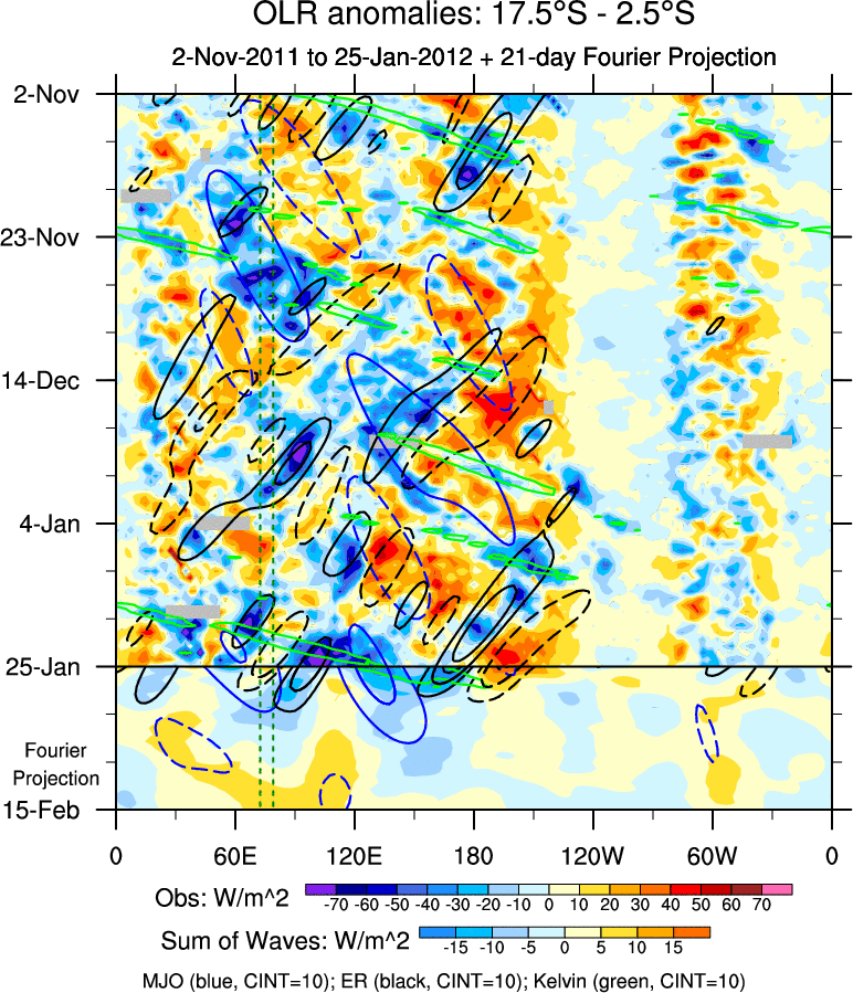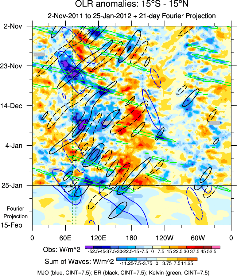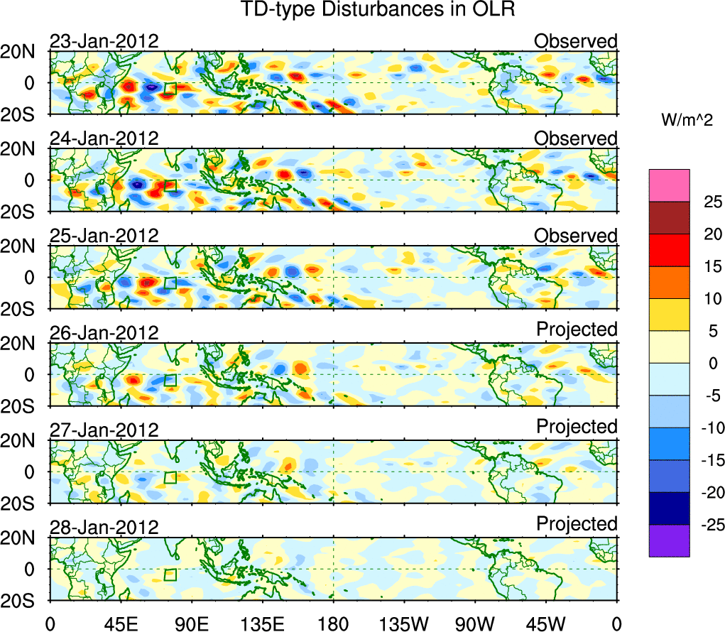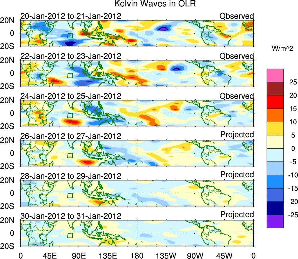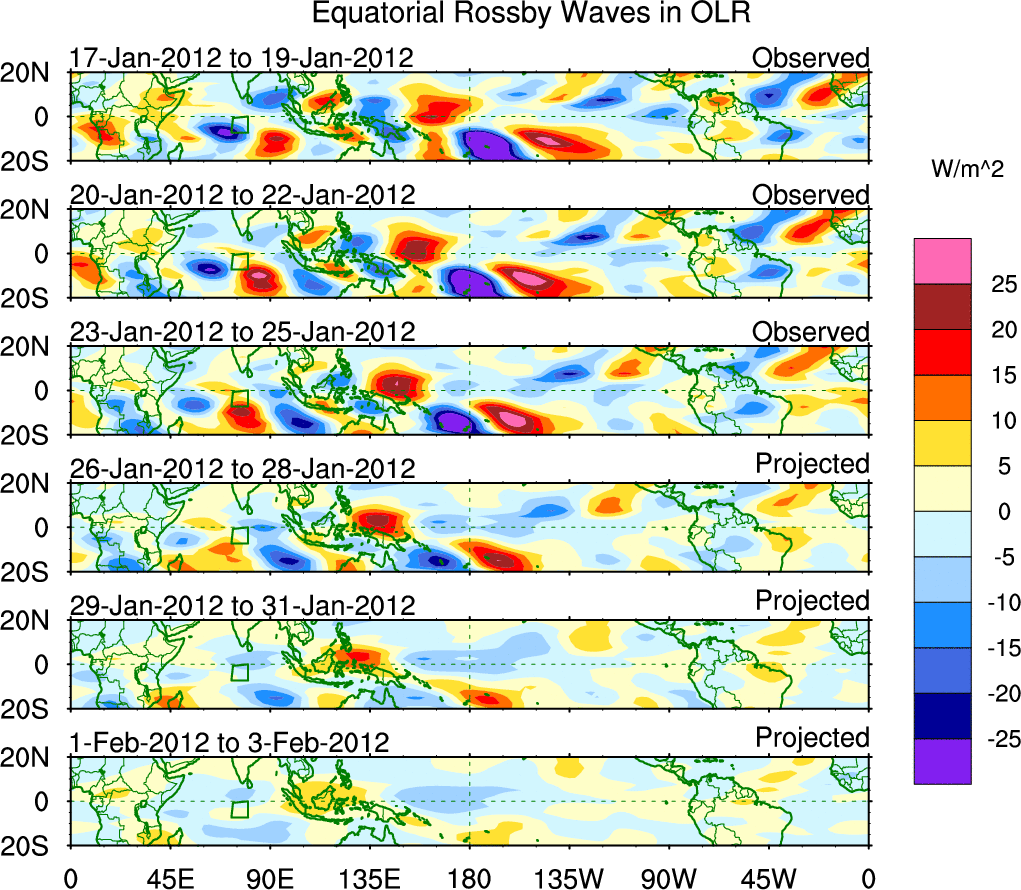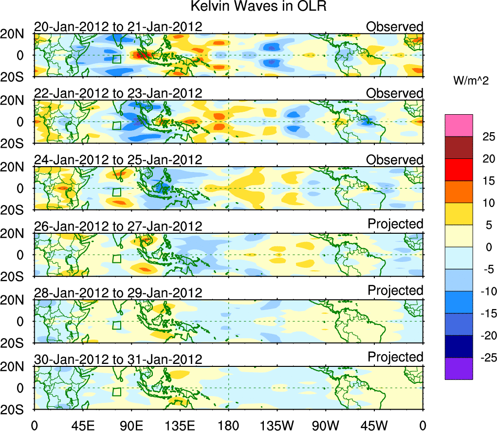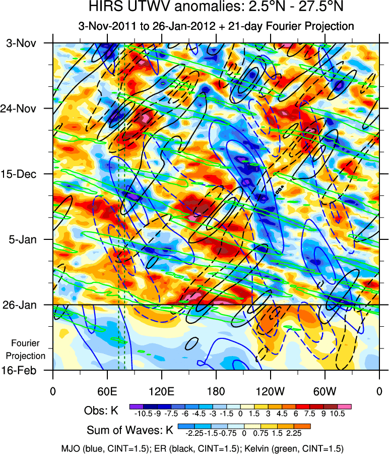 To identify tropical waves in near real-time, the OLR and UTWV data are filtered following Wheeler & Weickmann (2001 MWR). The daily anomalies are calculated using the first 3 harmonics of the seasonal cycle for 1979–2009. Missing values are then filled using linear interpolation in space and time. The most recent 365 days of anomalies are padded with 659 days of zeroes, and the result is filtered for each wave type.