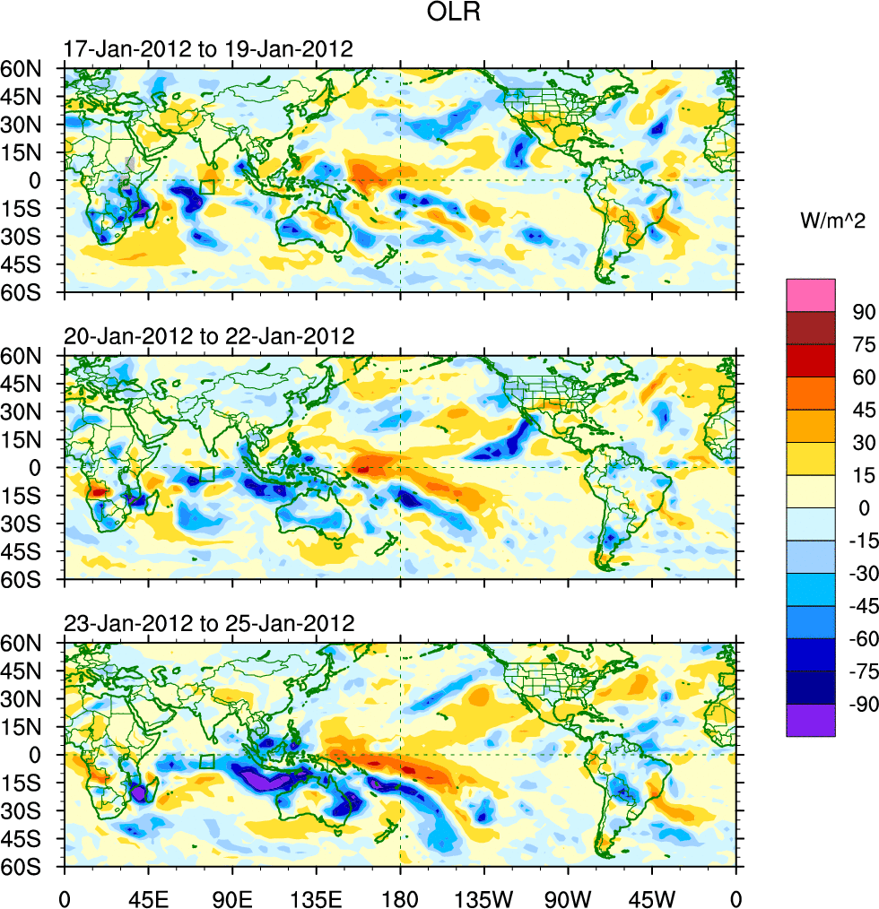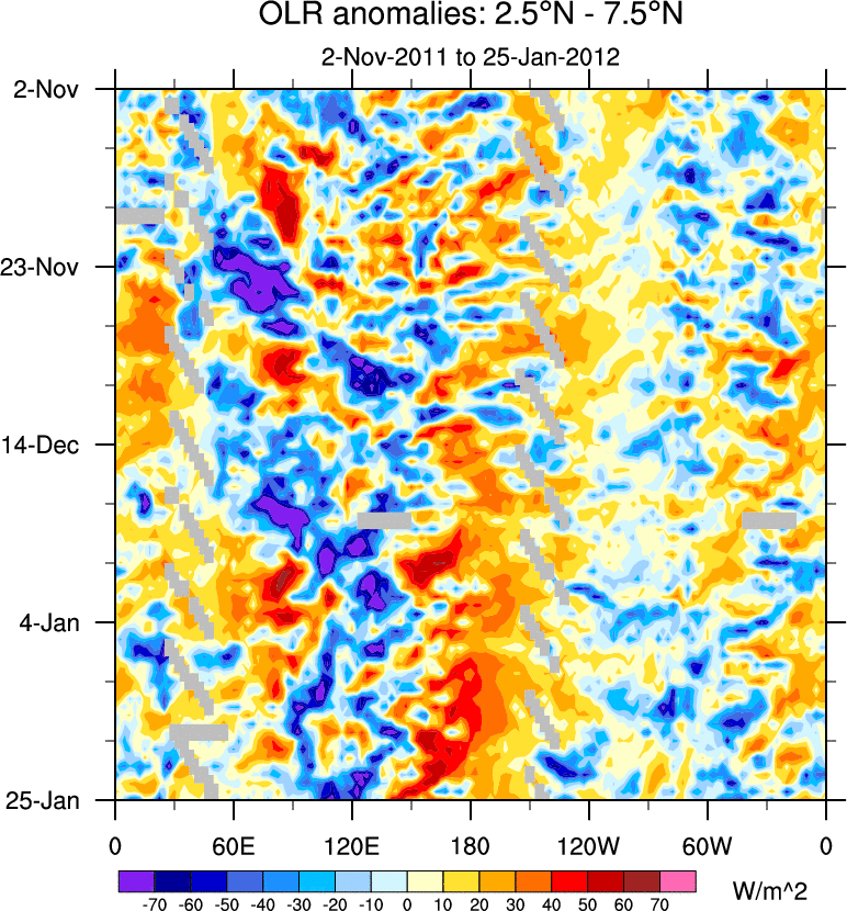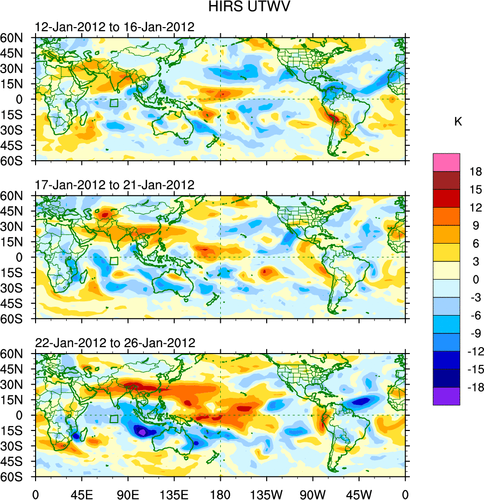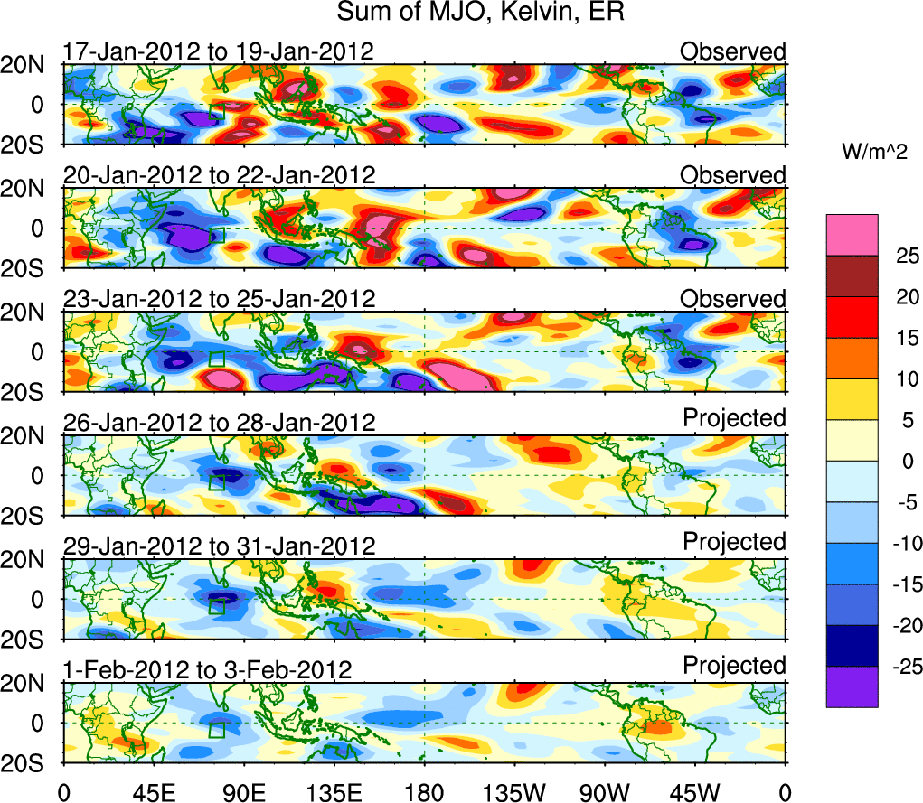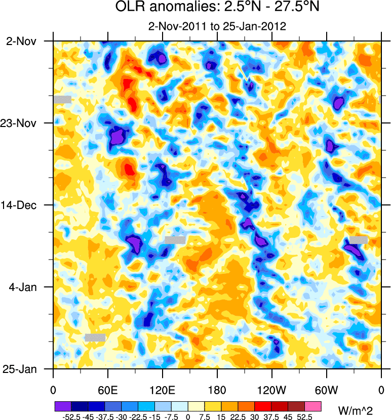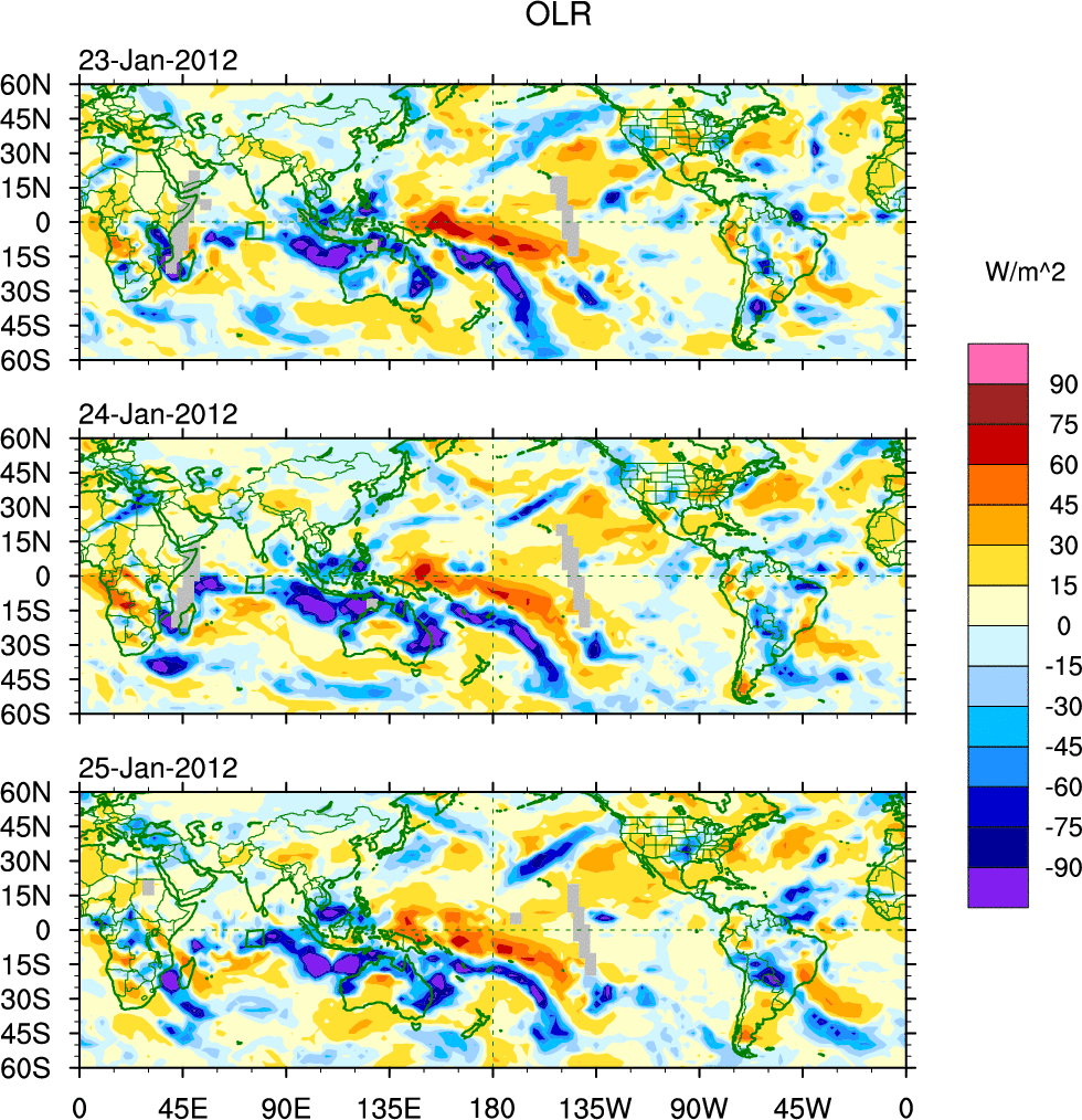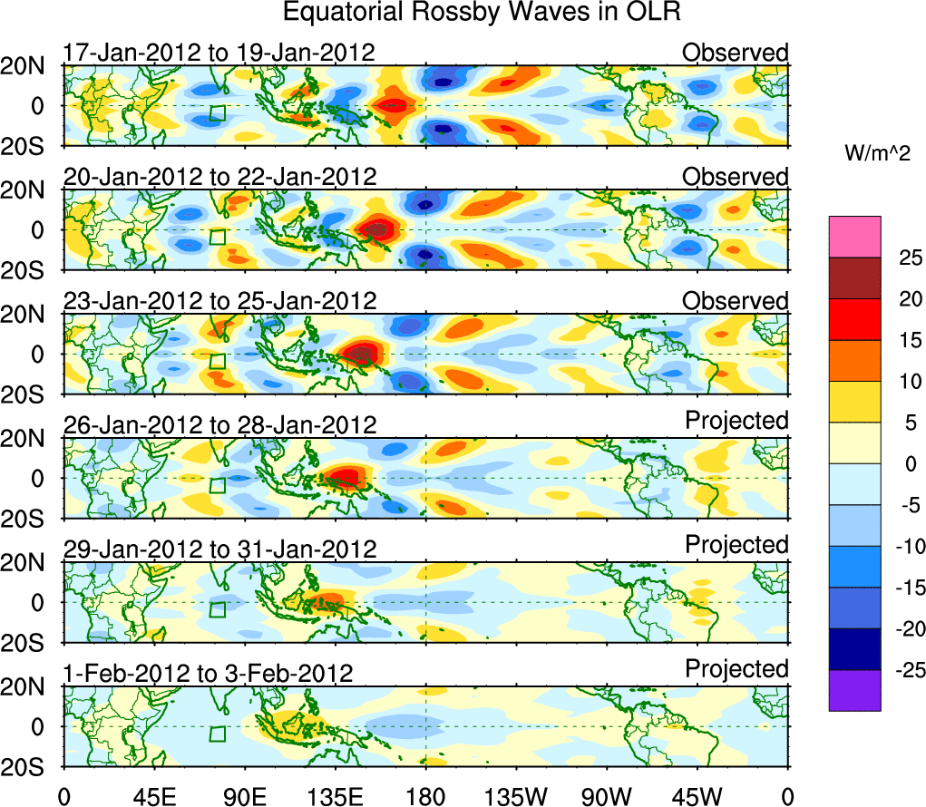 To identify tropical waves in near real-time, the OLR and UTWV data are filtered following Wheeler & Weickmann (2001 MWR). The daily anomalies are calculated using the first 3 harmonics of the seasonal cycle for 1979–2009. Missing values are then filled using linear interpolation in space and time. The most recent 365 days of anomalies are padded with 659 days of zeroes, and the result is filtered for each wave type.
