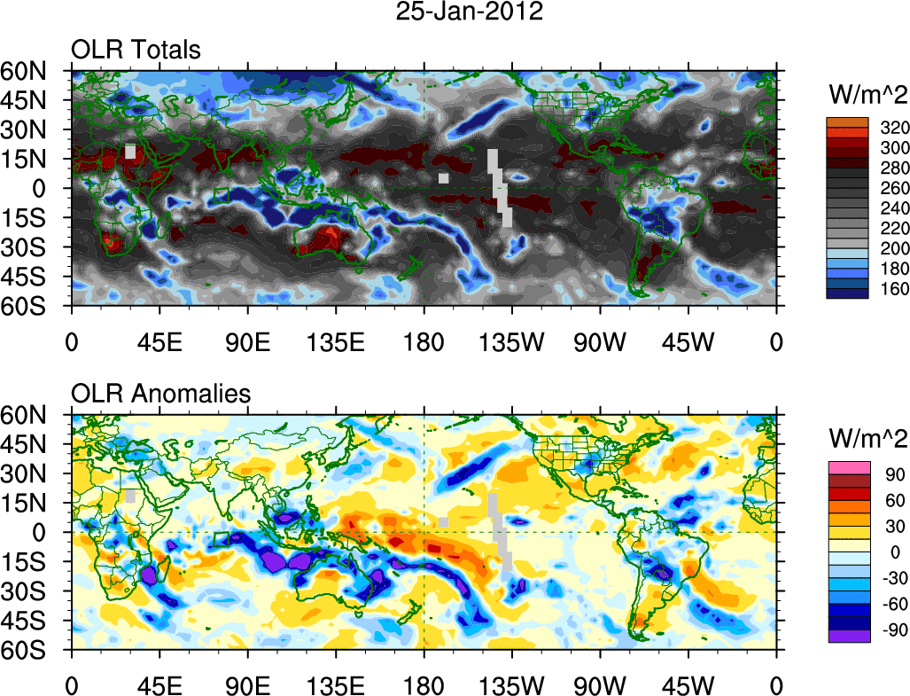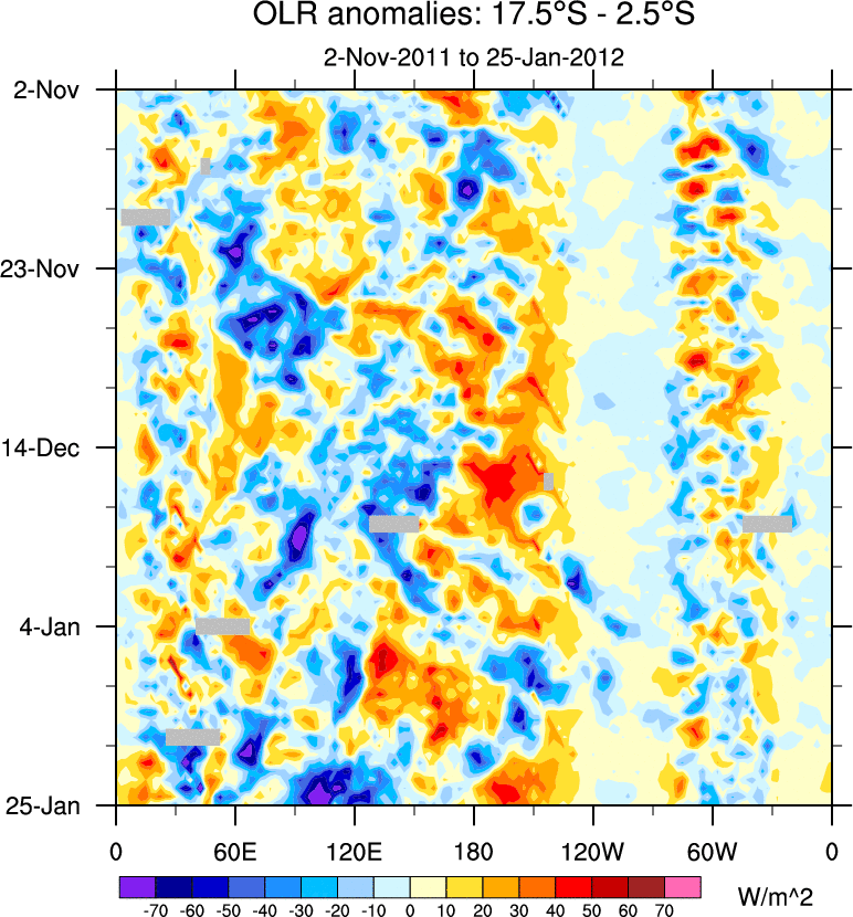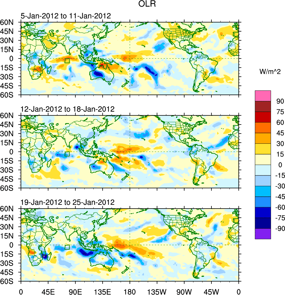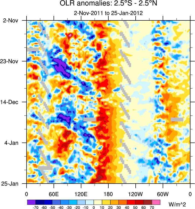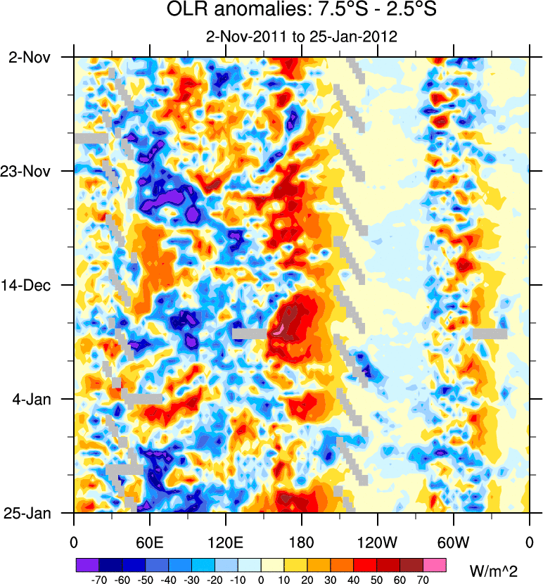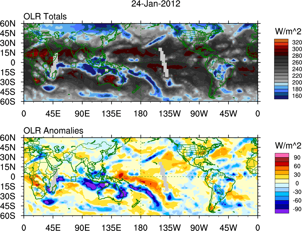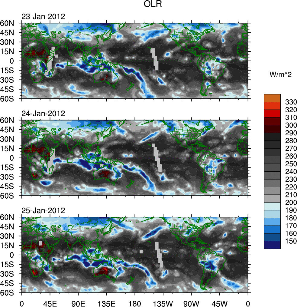 To identify tropical waves in near real-time, the OLR and UTWV data are filtered following Wheeler & Weickmann (2001 MWR). The daily anomalies are calculated using the first 3 harmonics of the seasonal cycle for 1979–2009. Missing values are then filled using linear interpolation in space and time. The most recent 365 days of anomalies are padded with 659 days of zeroes, and the result is filtered for each wave type.