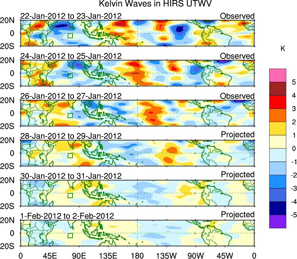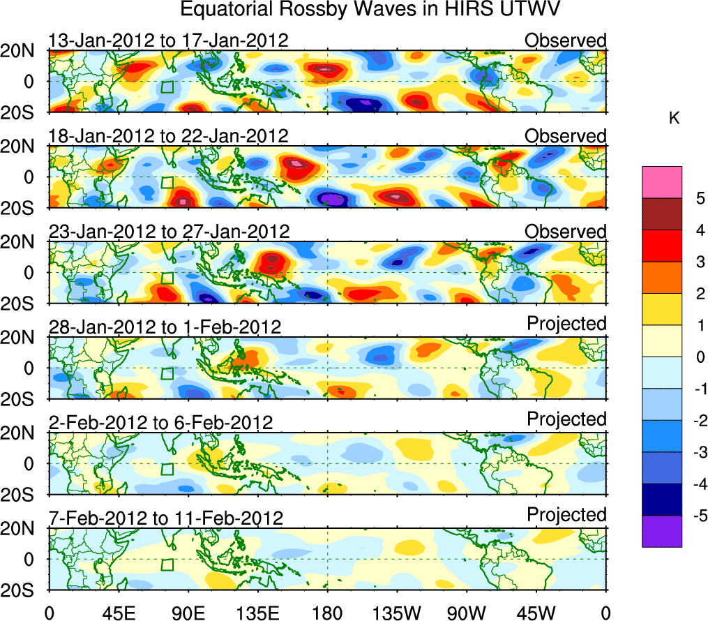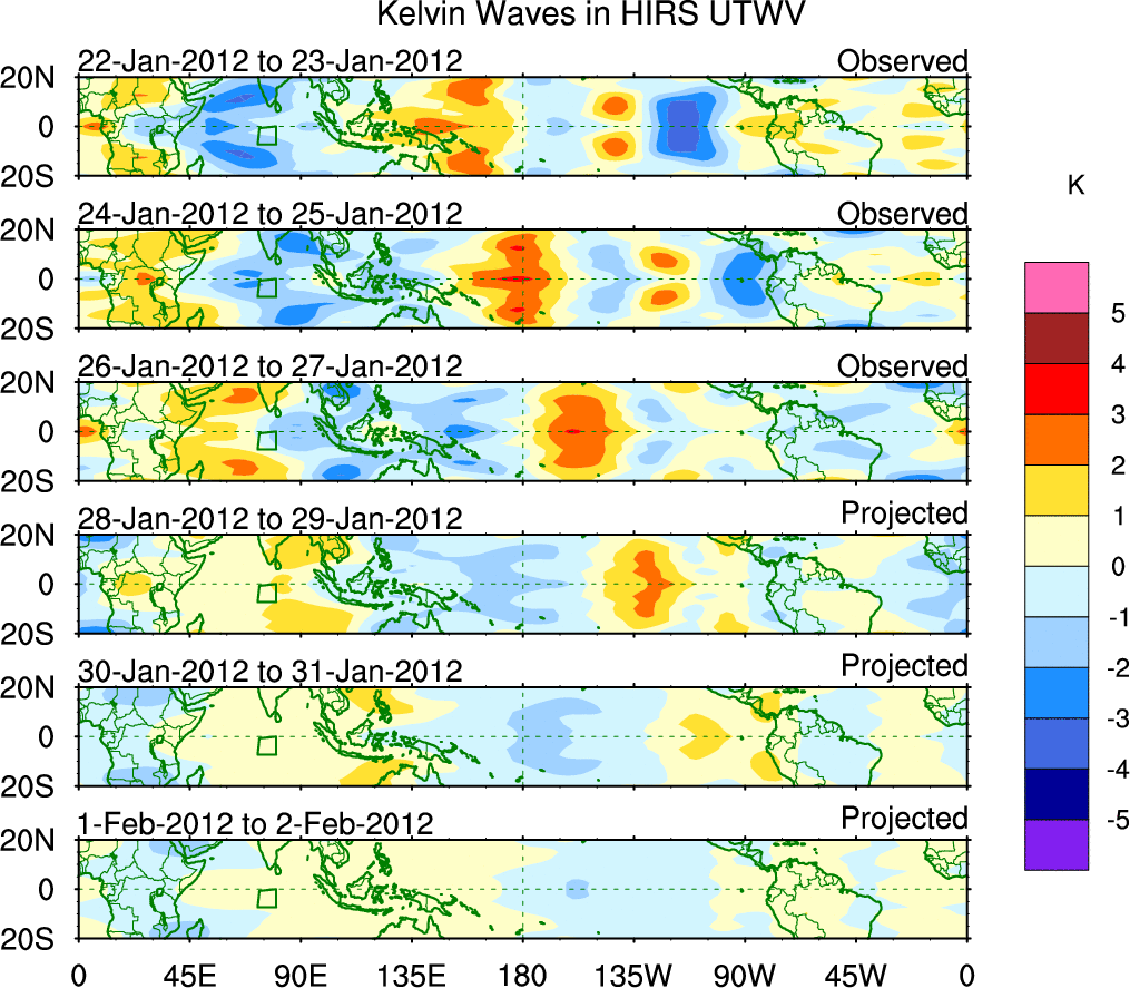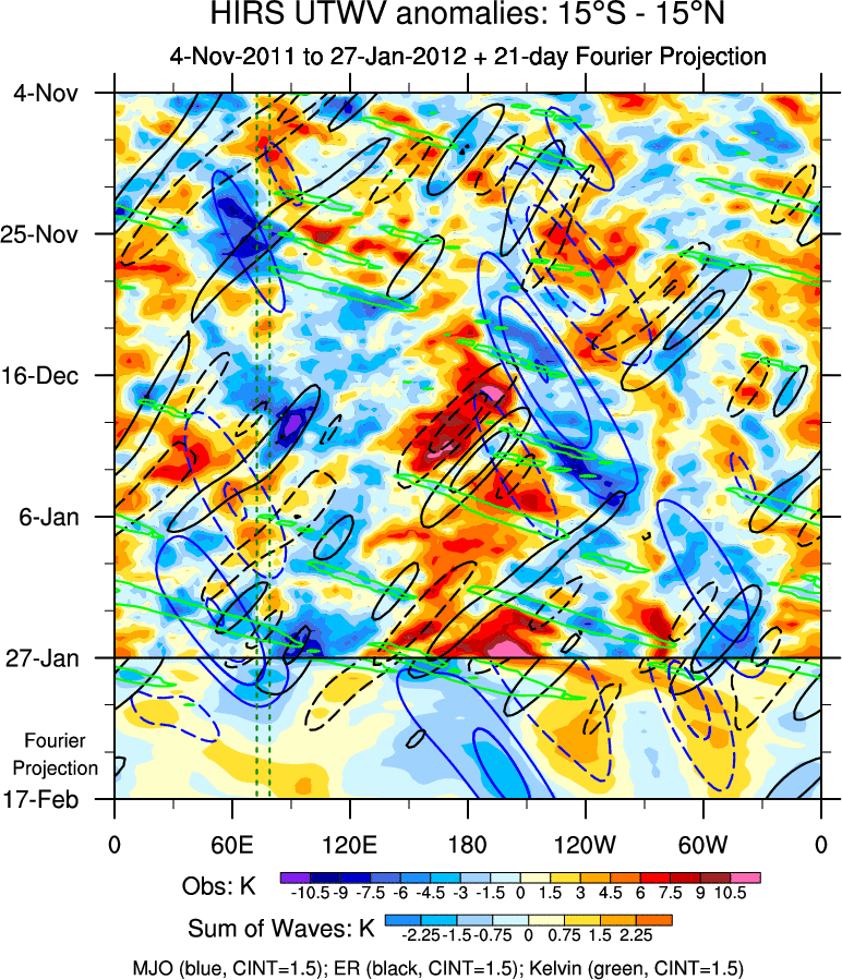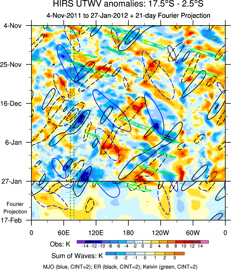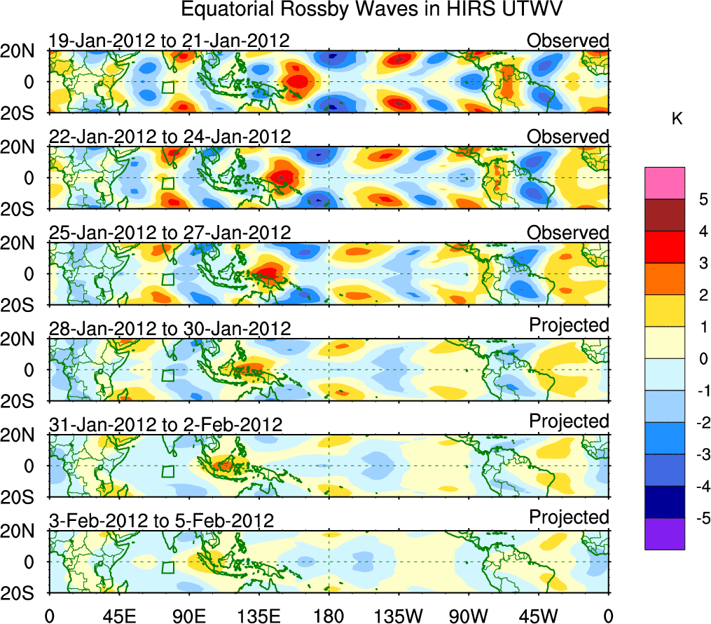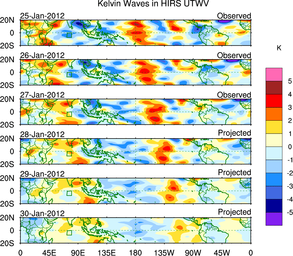 To identify tropical waves in near real-time, the OLR and UTWV data are filtered following Wheeler & Weickmann (2001 MWR). The daily anomalies are calculated using the first 3 harmonics of the seasonal cycle for 1979–2009. Missing values are then filled using linear interpolation in space and time. The most recent 365 days of anomalies are padded with 659 days of zeroes, and the result is filtered for each wave type.