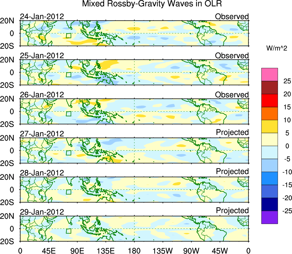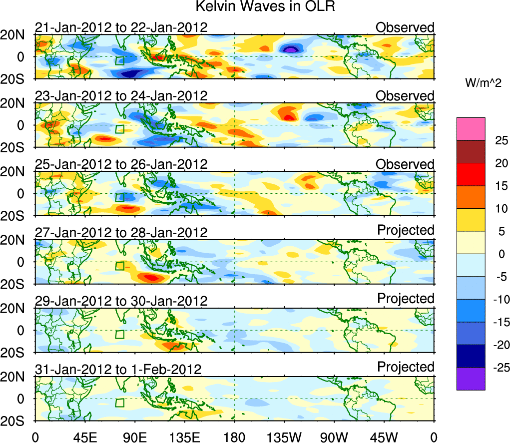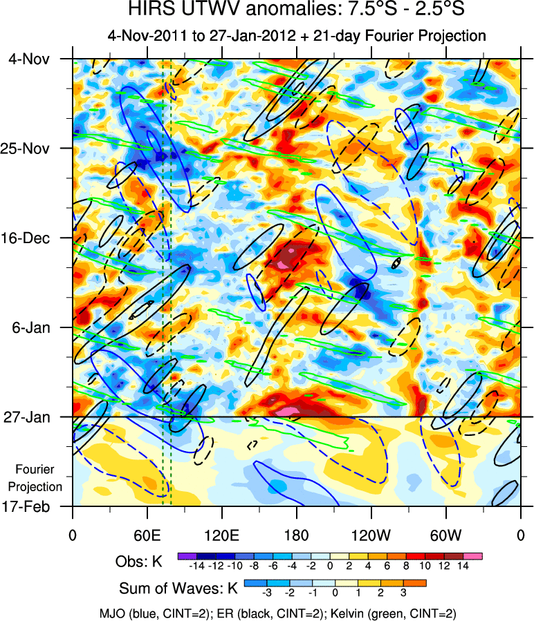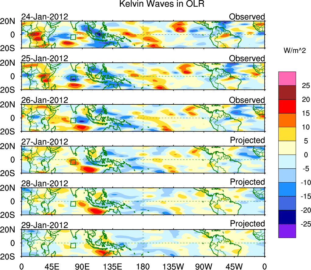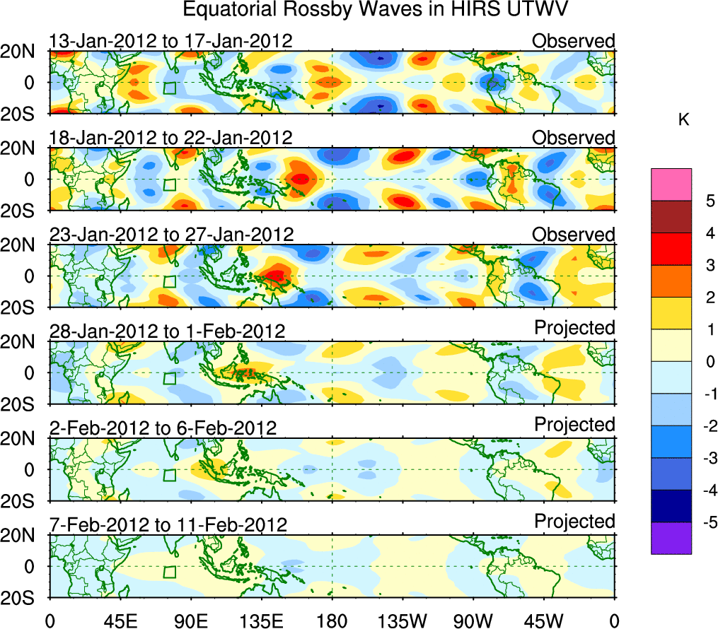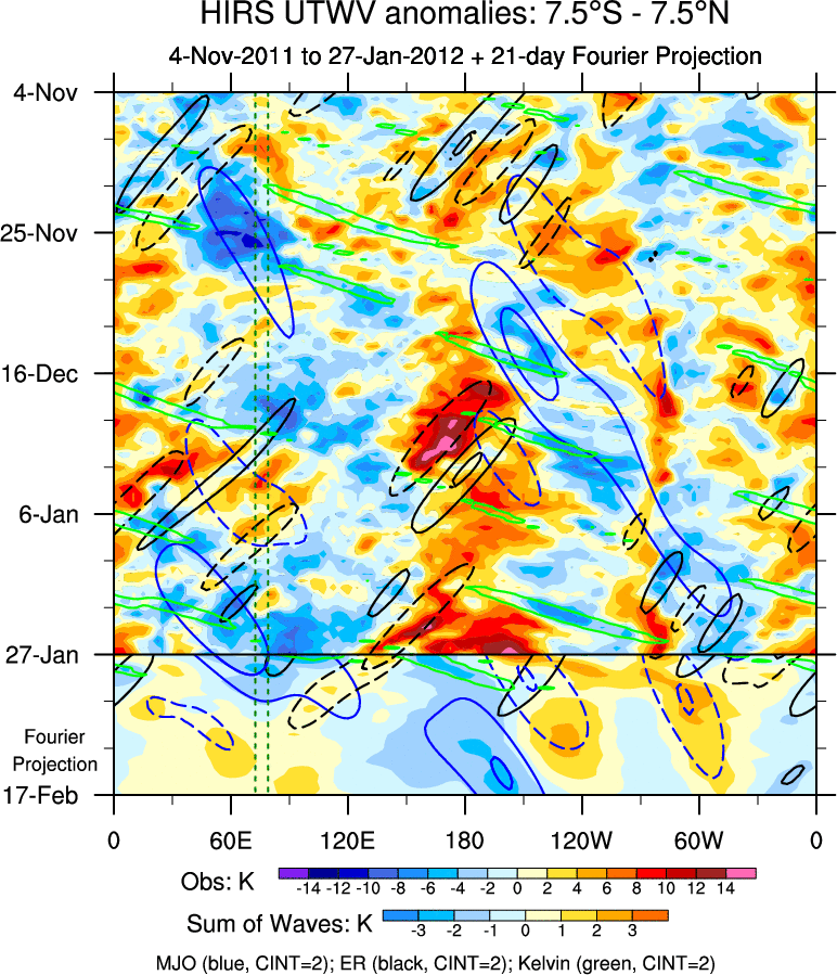 To identify tropical waves in near real-time, the OLR and UTWV data are filtered following Wheeler & Weickmann (2001 MWR). The daily anomalies are calculated using the first 3 harmonics of the seasonal cycle for 1979–2009. Missing values are then filled using linear interpolation in space and time. The most recent 365 days of anomalies are padded with 659 days of zeroes, and the result is filtered for each wave type.