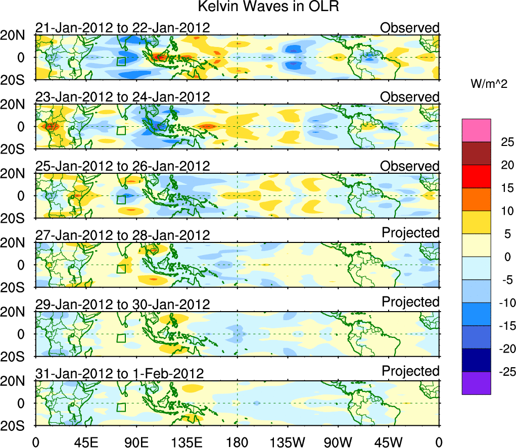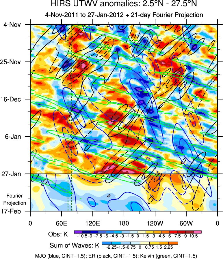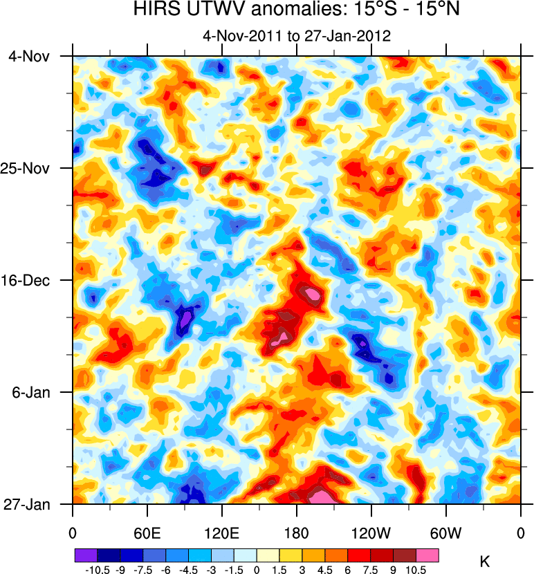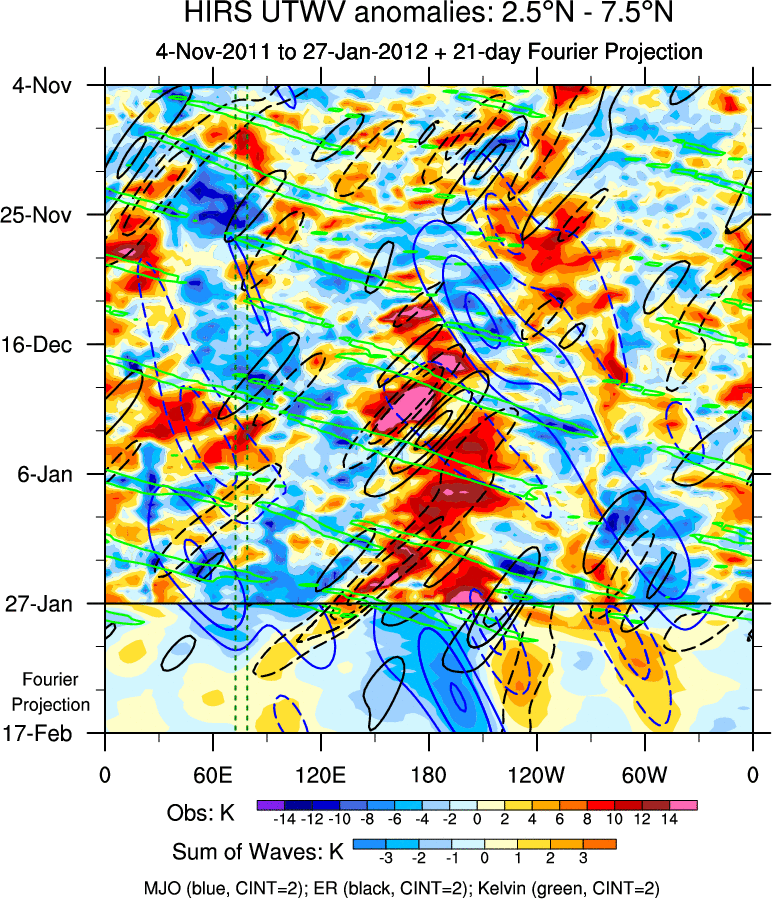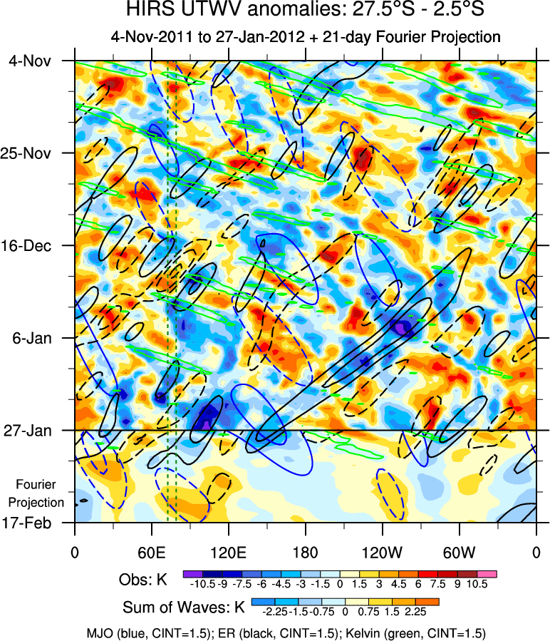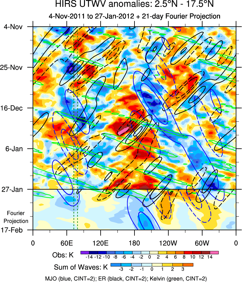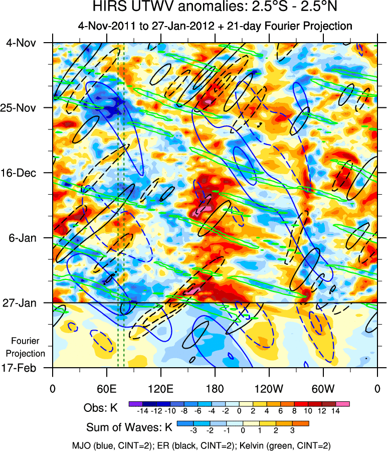 To identify tropical waves in near real-time, the OLR and UTWV data are filtered following Wheeler & Weickmann (2001 MWR). The daily anomalies are calculated using the first 3 harmonics of the seasonal cycle for 1979–2009. Missing values are then filled using linear interpolation in space and time. The most recent 365 days of anomalies are padded with 659 days of zeroes, and the result is filtered for each wave type.