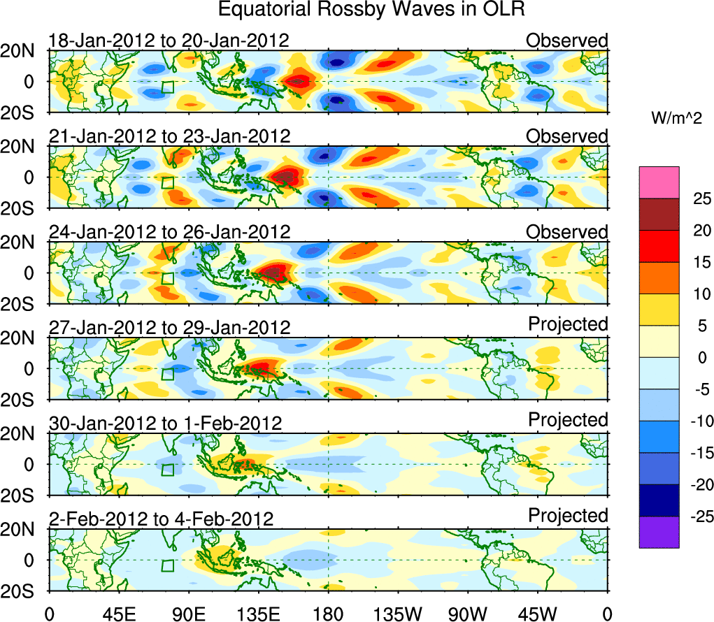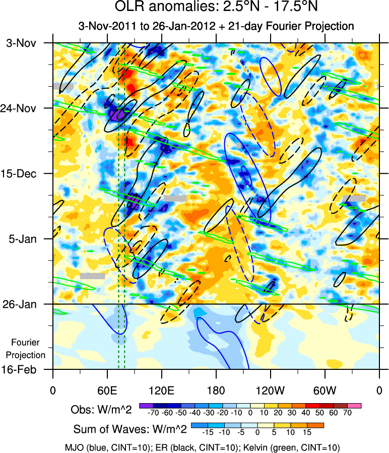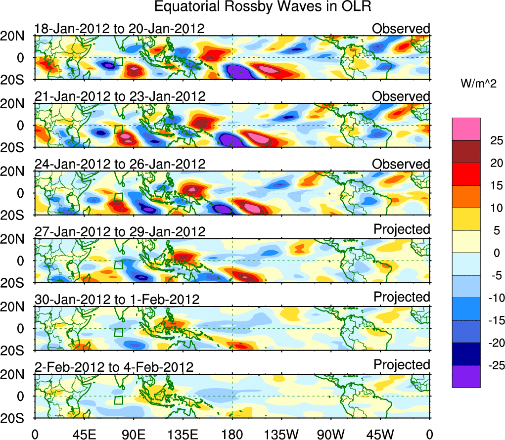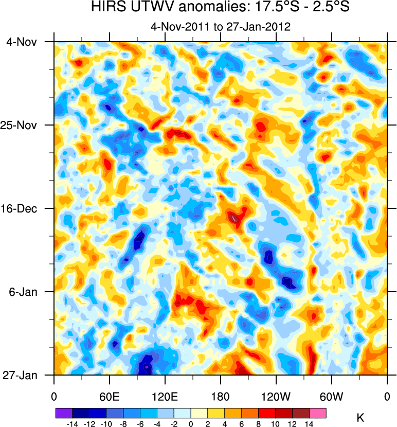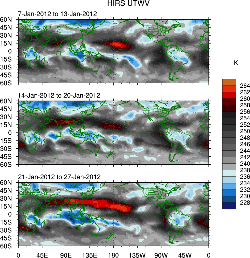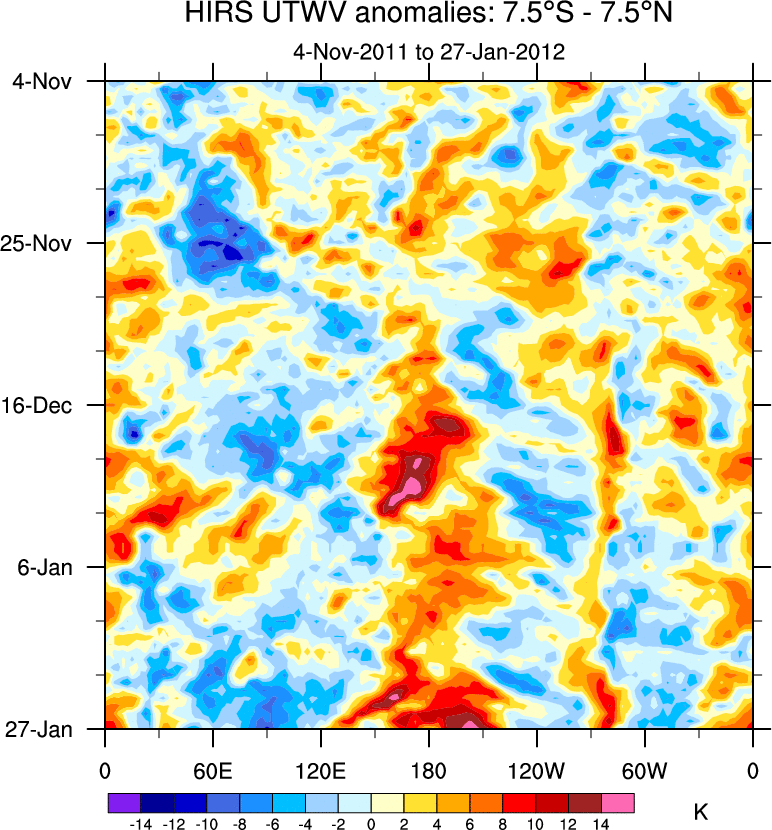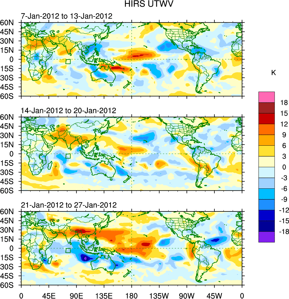 To identify tropical waves in near real-time, the OLR and UTWV data are filtered following Wheeler & Weickmann (2001 MWR). The daily anomalies are calculated using the first 3 harmonics of the seasonal cycle for 1979–2009. Missing values are then filled using linear interpolation in space and time. The most recent 365 days of anomalies are padded with 659 days of zeroes, and the result is filtered for each wave type.