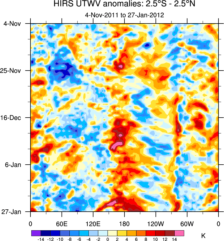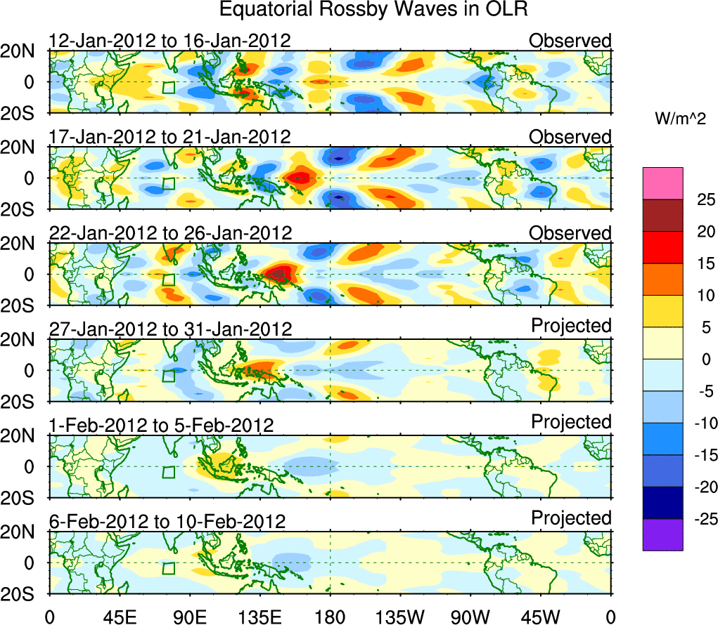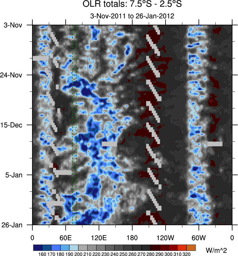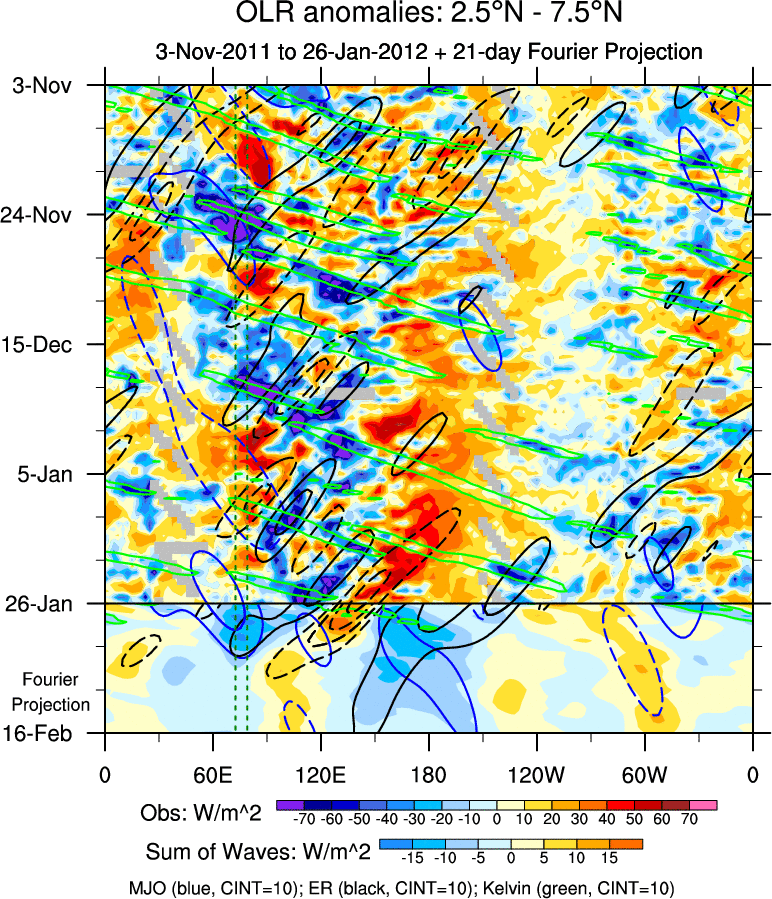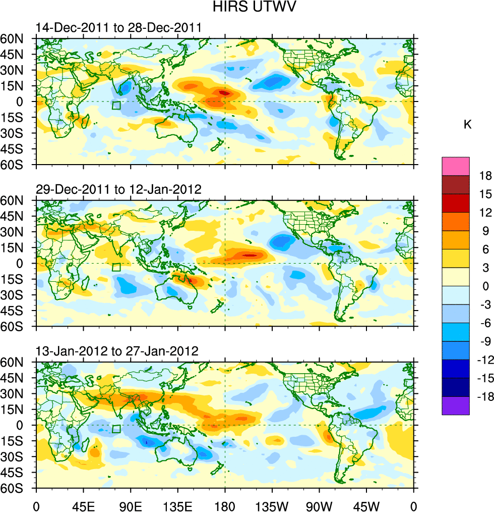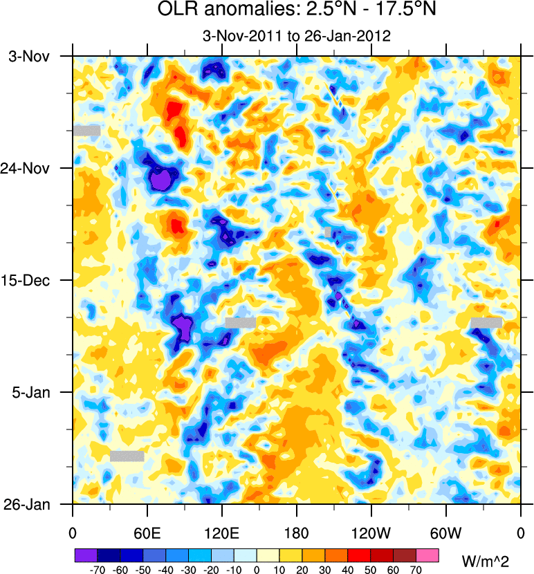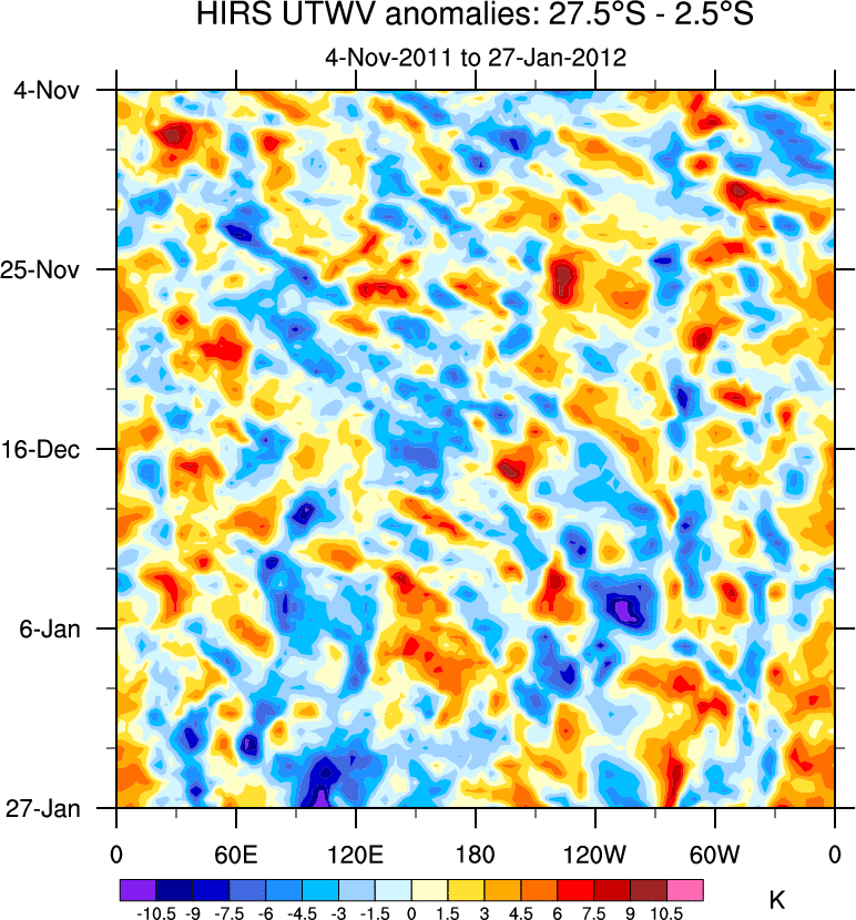 To identify tropical waves in near real-time, the OLR and UTWV data are filtered following Wheeler & Weickmann (2001 MWR). The daily anomalies are calculated using the first 3 harmonics of the seasonal cycle for 1979–2009. Missing values are then filled using linear interpolation in space and time. The most recent 365 days of anomalies are padded with 659 days of zeroes, and the result is filtered for each wave type.