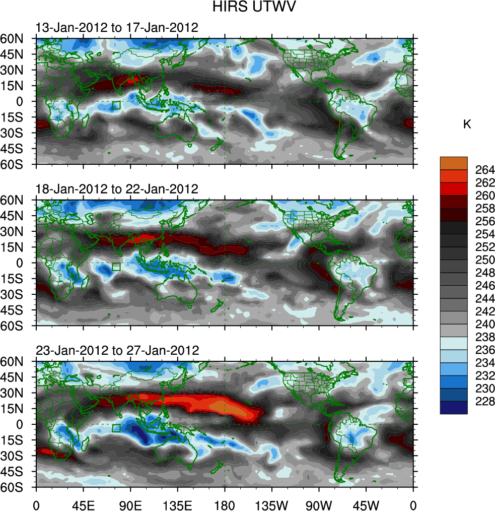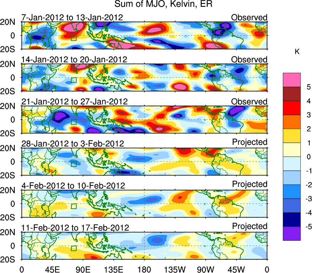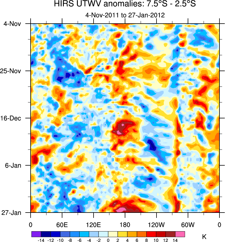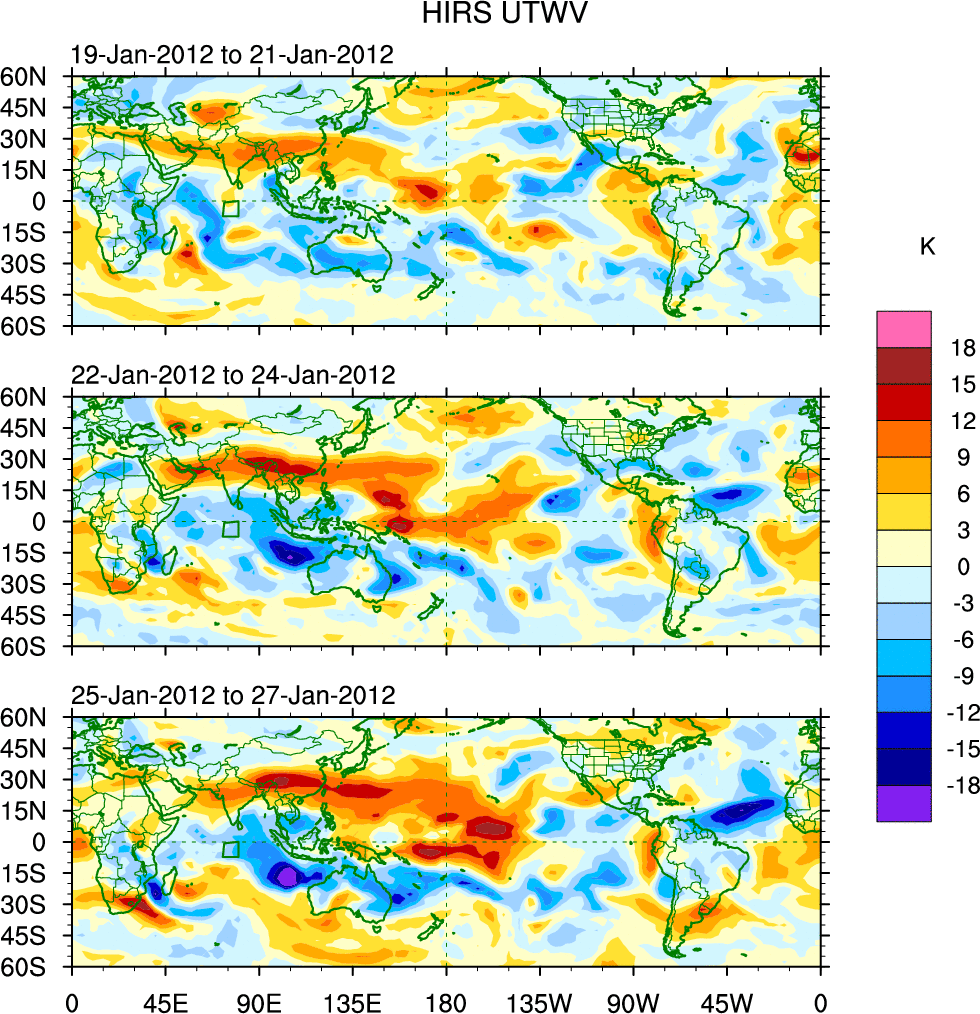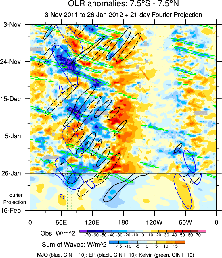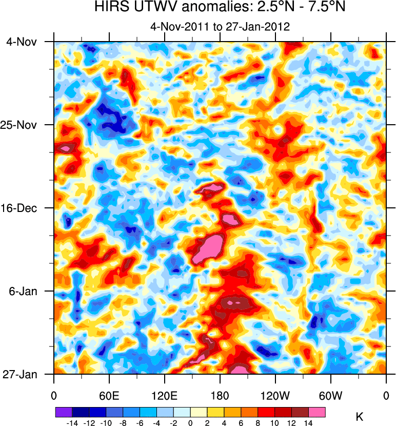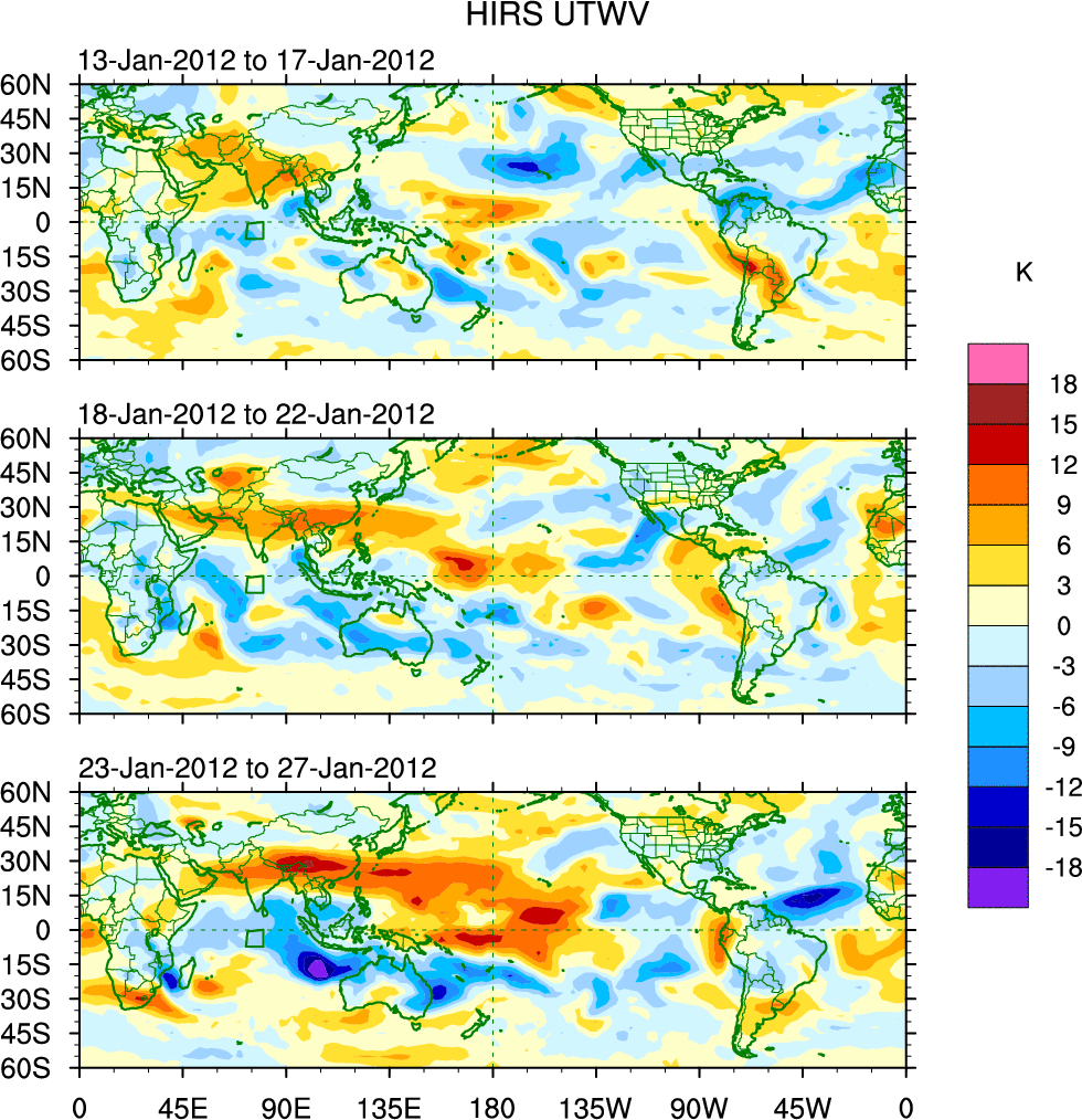 To identify tropical waves in near real-time, the OLR and UTWV data are filtered following Wheeler & Weickmann (2001 MWR). The daily anomalies are calculated using the first 3 harmonics of the seasonal cycle for 1979–2009. Missing values are then filled using linear interpolation in space and time. The most recent 365 days of anomalies are padded with 659 days of zeroes, and the result is filtered for each wave type.