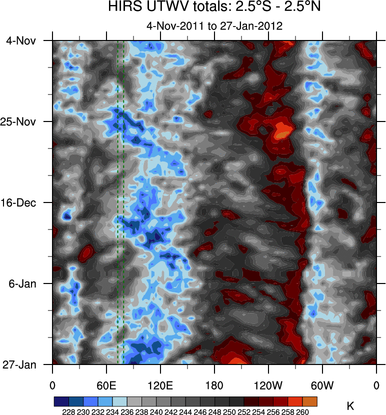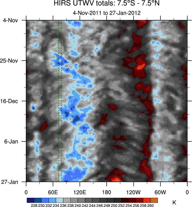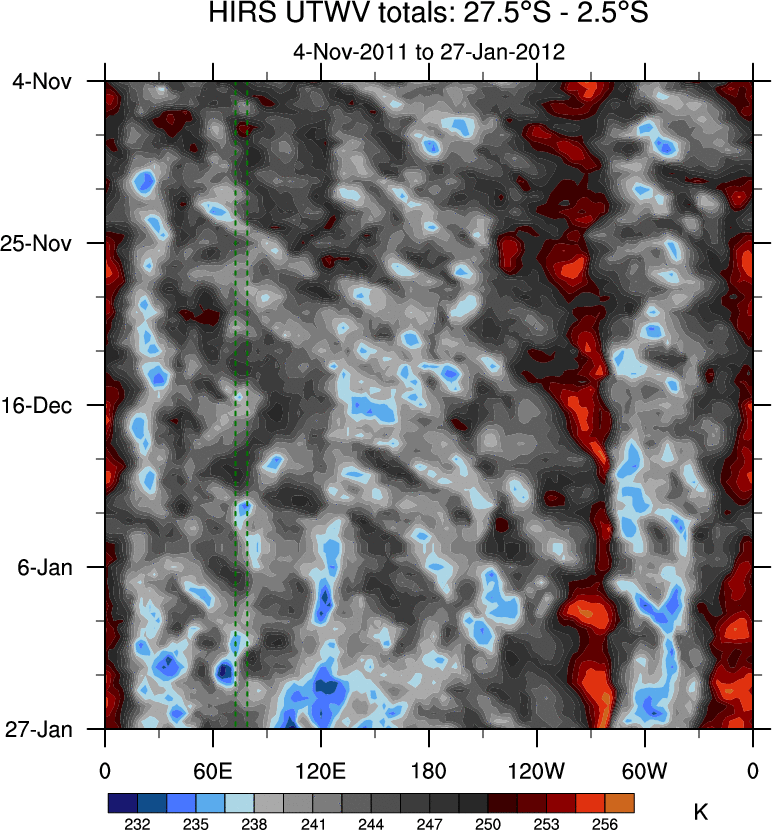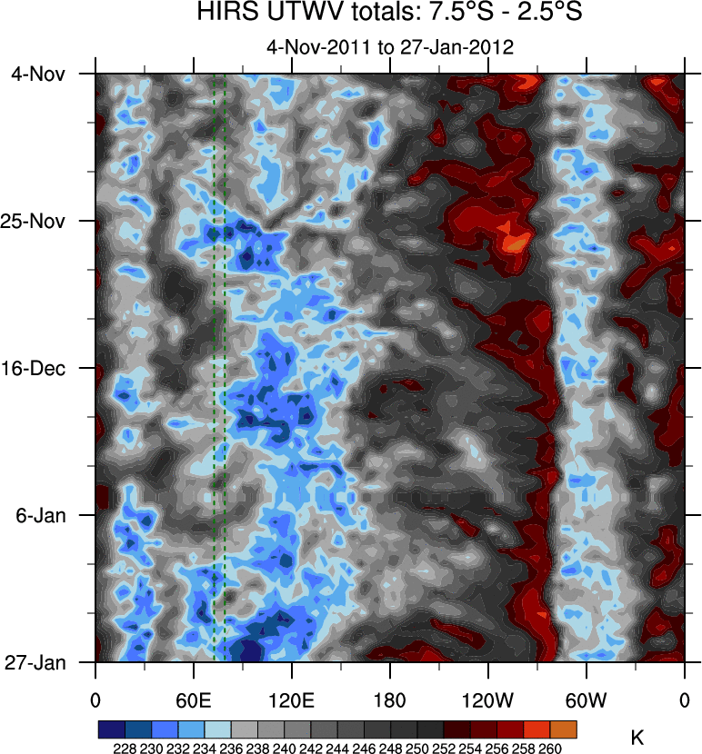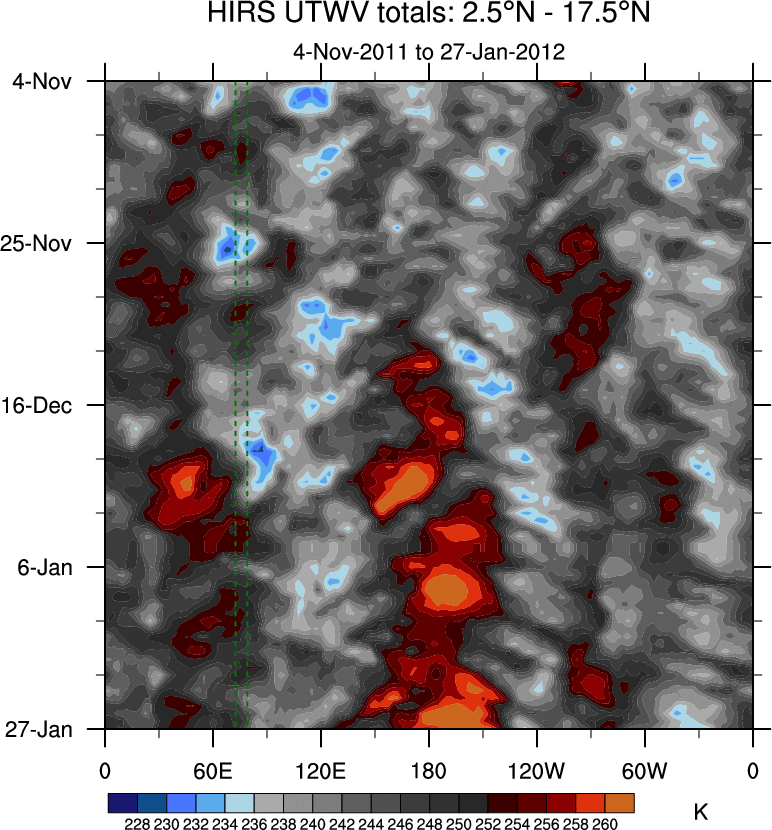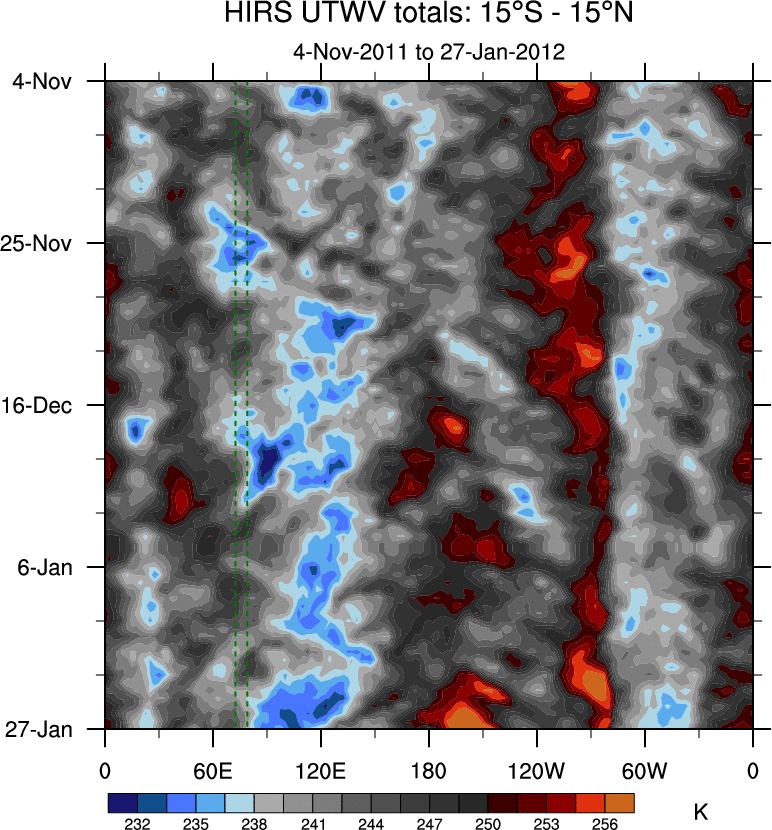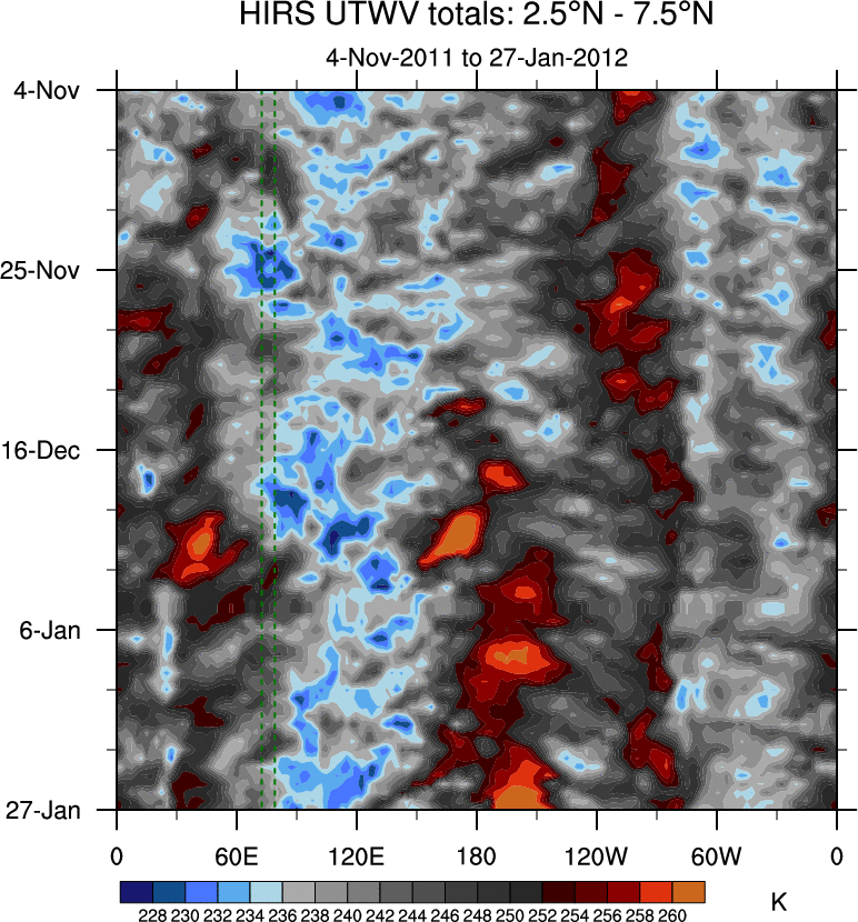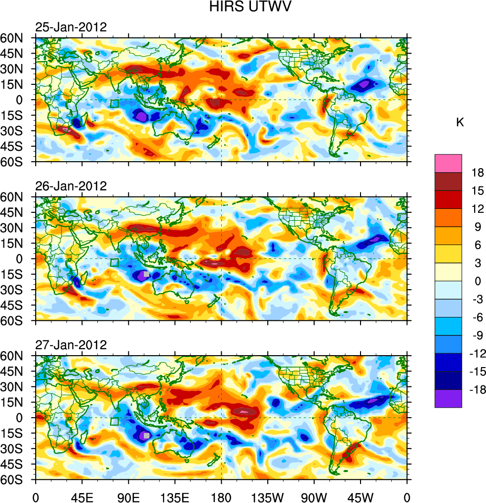 To identify tropical waves in near real-time, the OLR and UTWV data are filtered following Wheeler & Weickmann (2001 MWR). The daily anomalies are calculated using the first 3 harmonics of the seasonal cycle for 1979–2009. Missing values are then filled using linear interpolation in space and time. The most recent 365 days of anomalies are padded with 659 days of zeroes, and the result is filtered for each wave type.