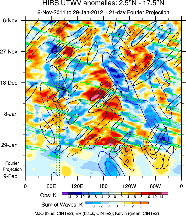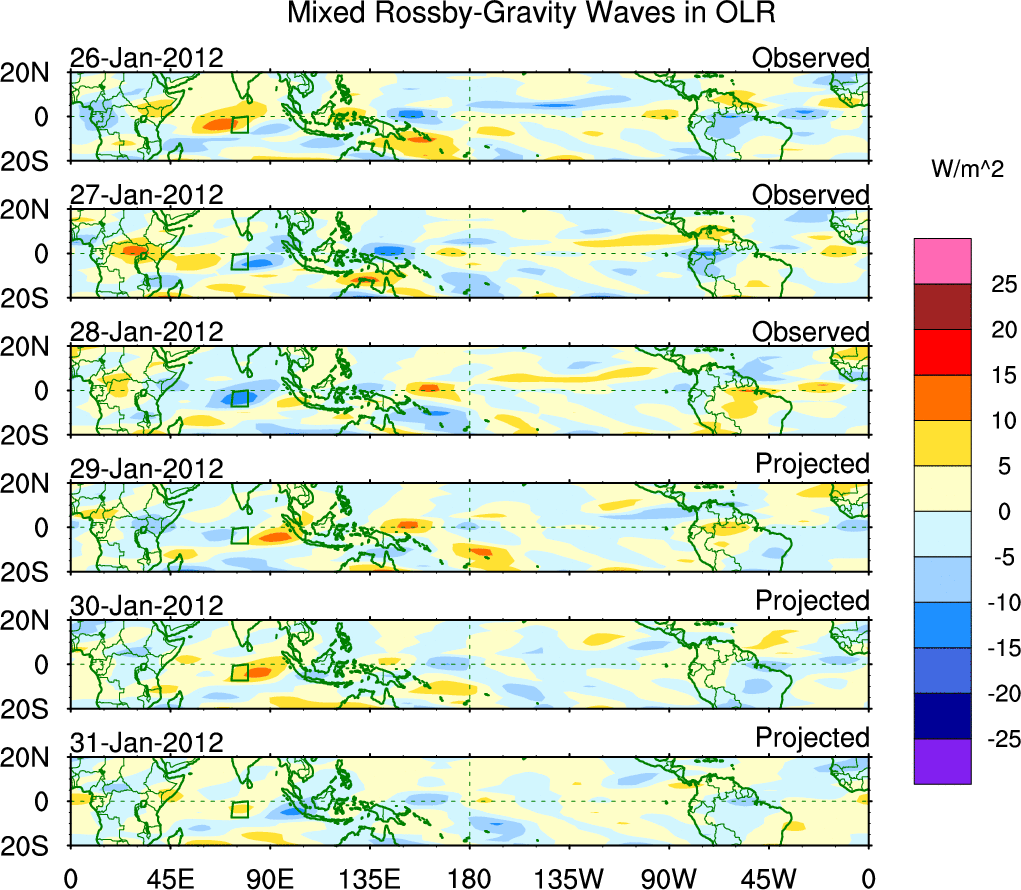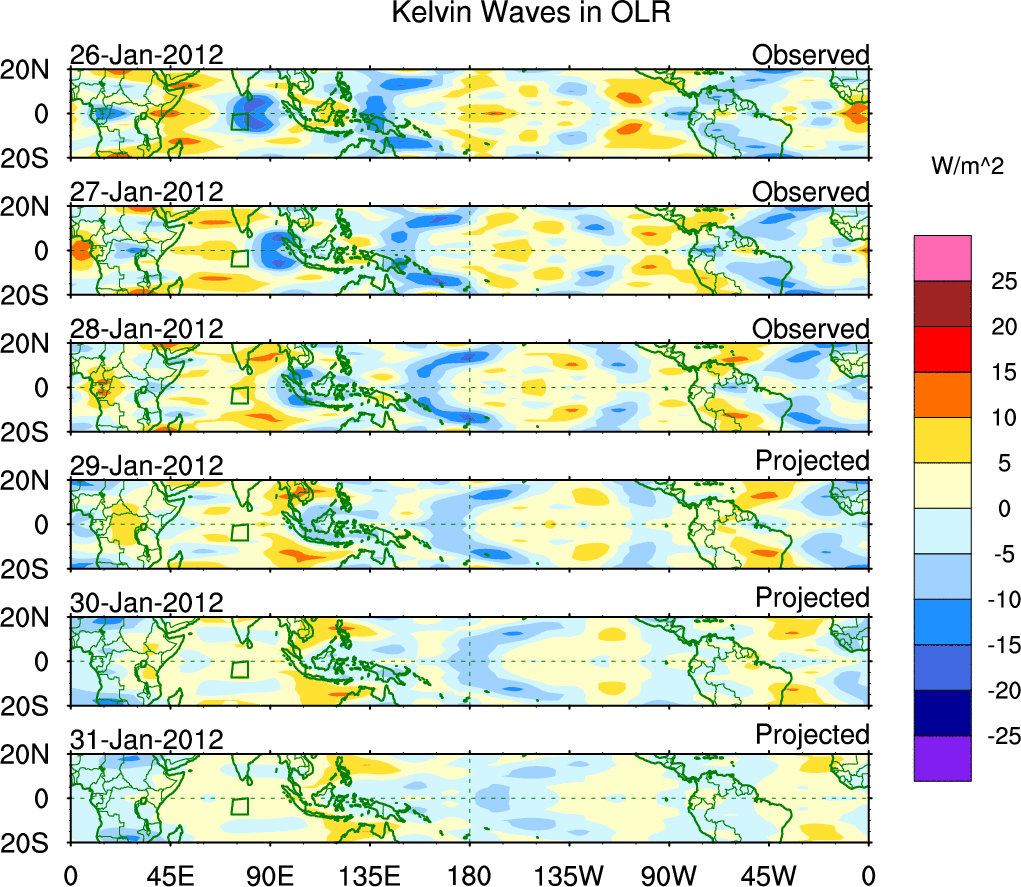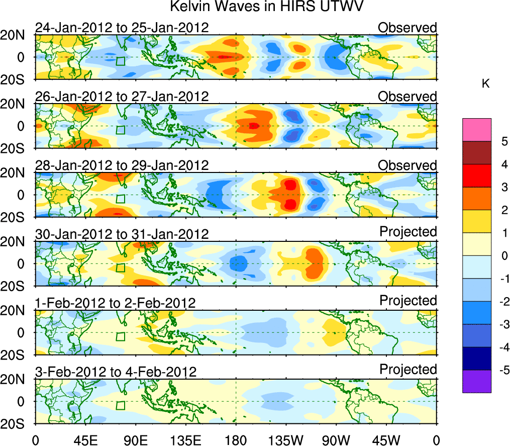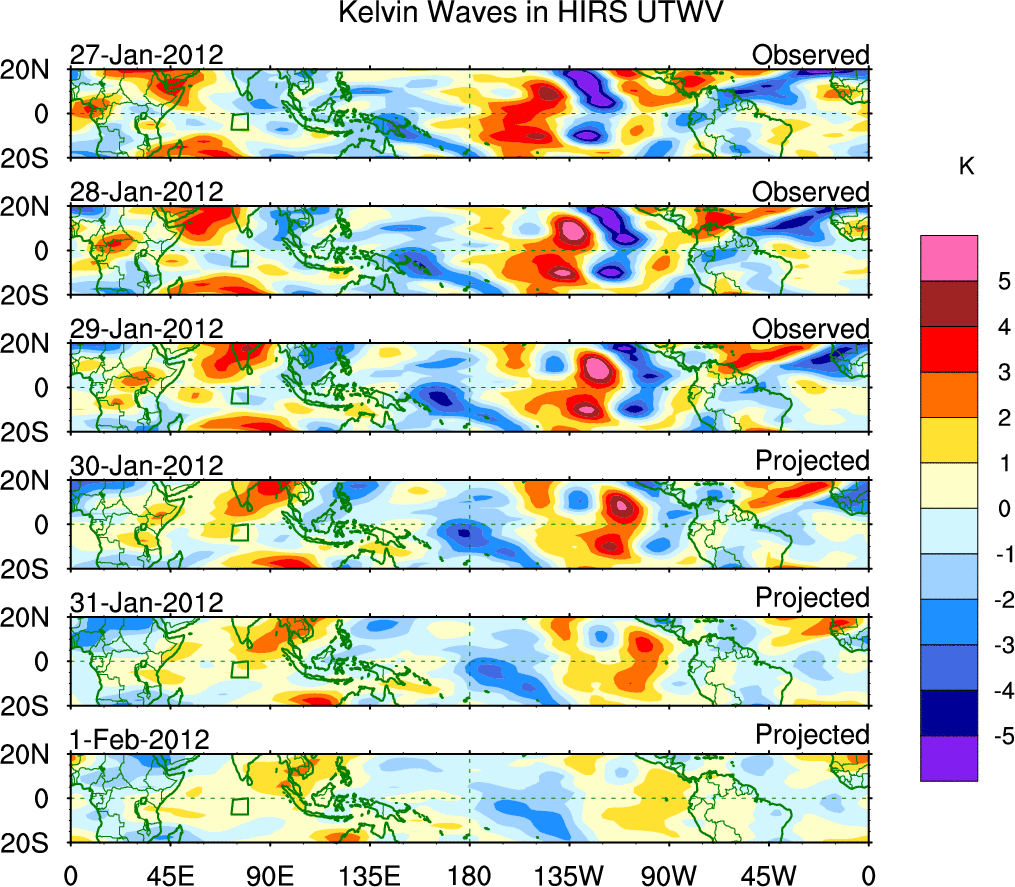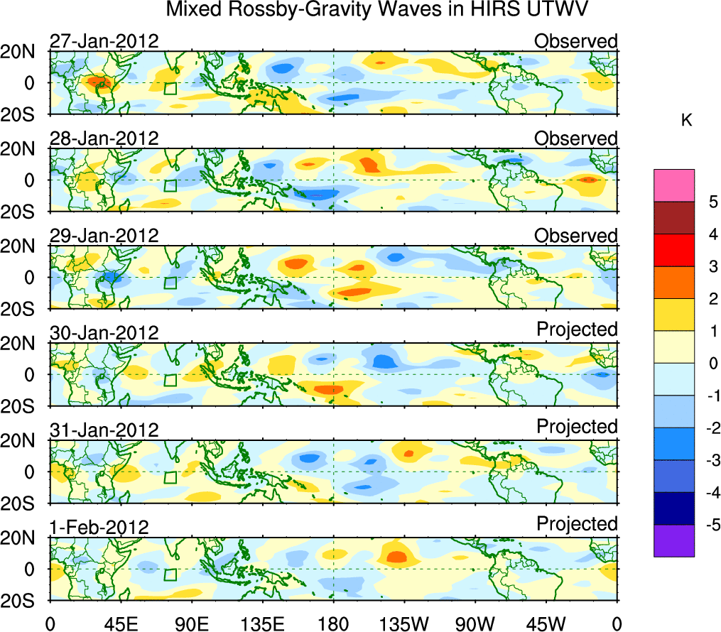 To identify tropical waves in near real-time, the OLR and UTWV data are filtered following Wheeler & Weickmann (2001 MWR). The daily anomalies are calculated using the first 3 harmonics of the seasonal cycle for 1979–2009. Missing values are then filled using linear interpolation in space and time. The most recent 365 days of anomalies are padded with 659 days of zeroes, and the result is filtered for each wave type.