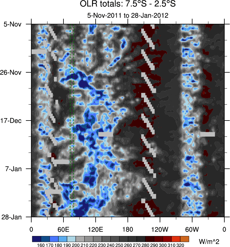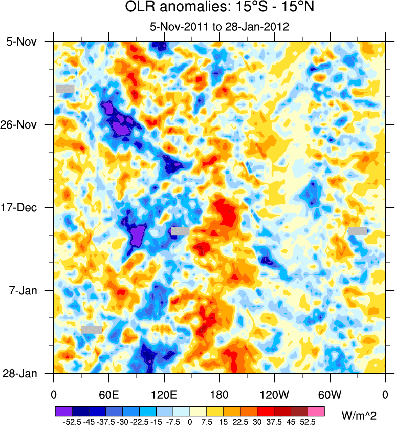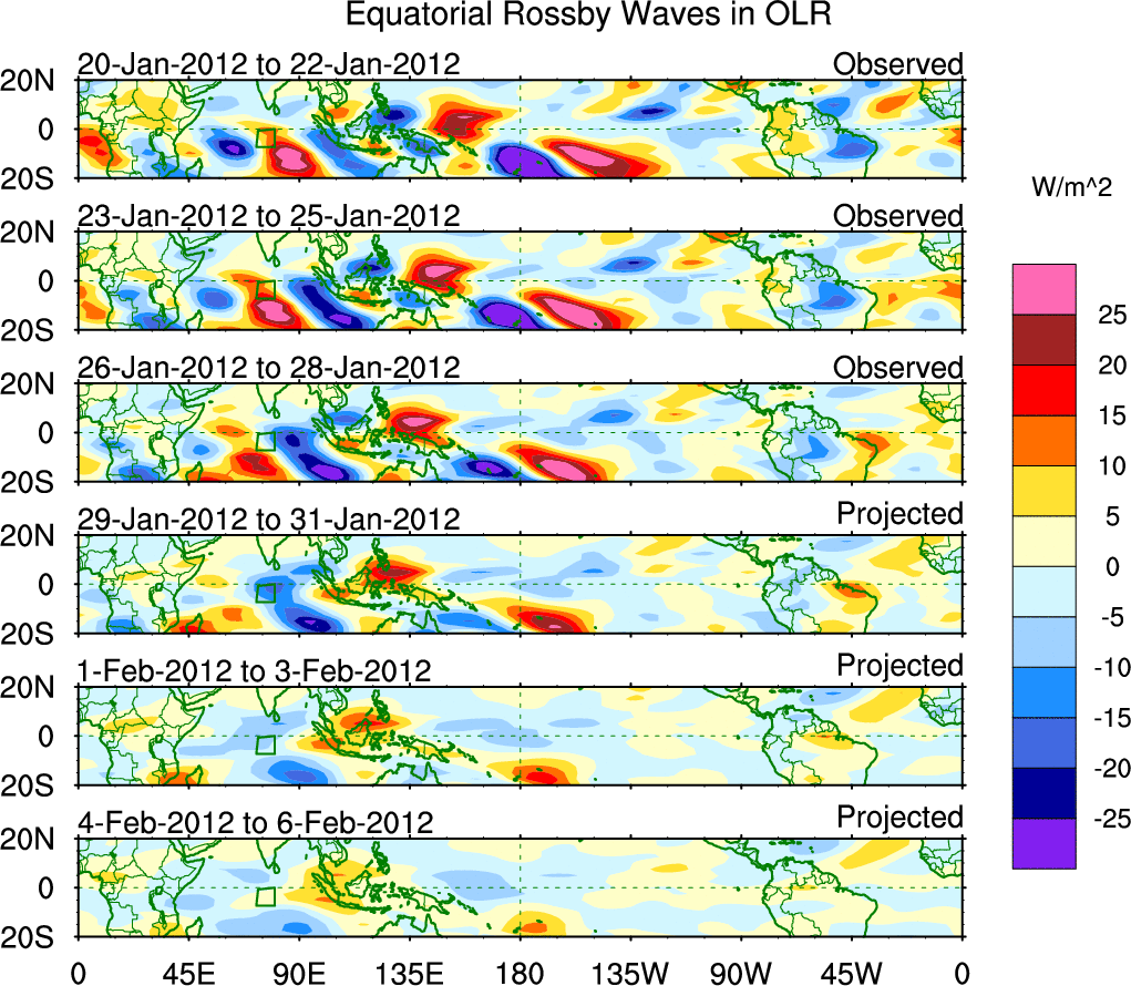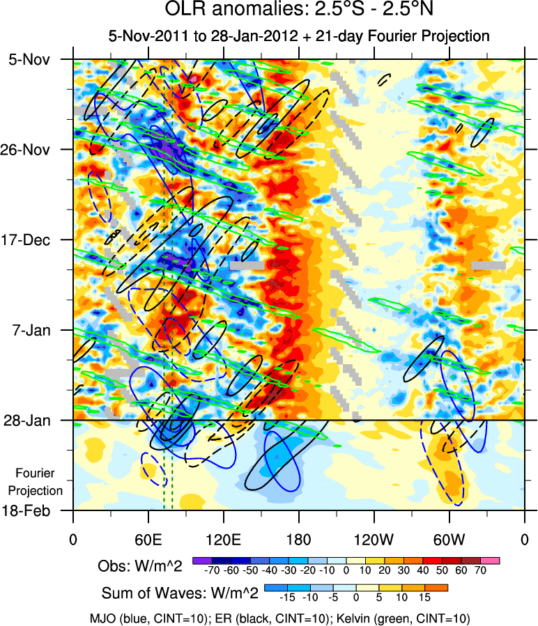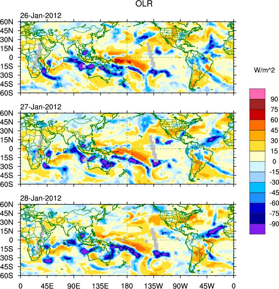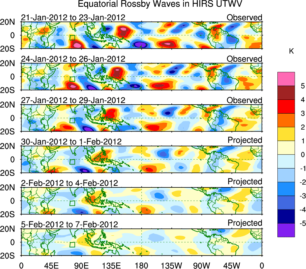 To identify tropical waves in near real-time, the OLR and UTWV data are filtered following Wheeler & Weickmann (2001 MWR). The daily anomalies are calculated using the first 3 harmonics of the seasonal cycle for 1979–2009. Missing values are then filled using linear interpolation in space and time. The most recent 365 days of anomalies are padded with 659 days of zeroes, and the result is filtered for each wave type.