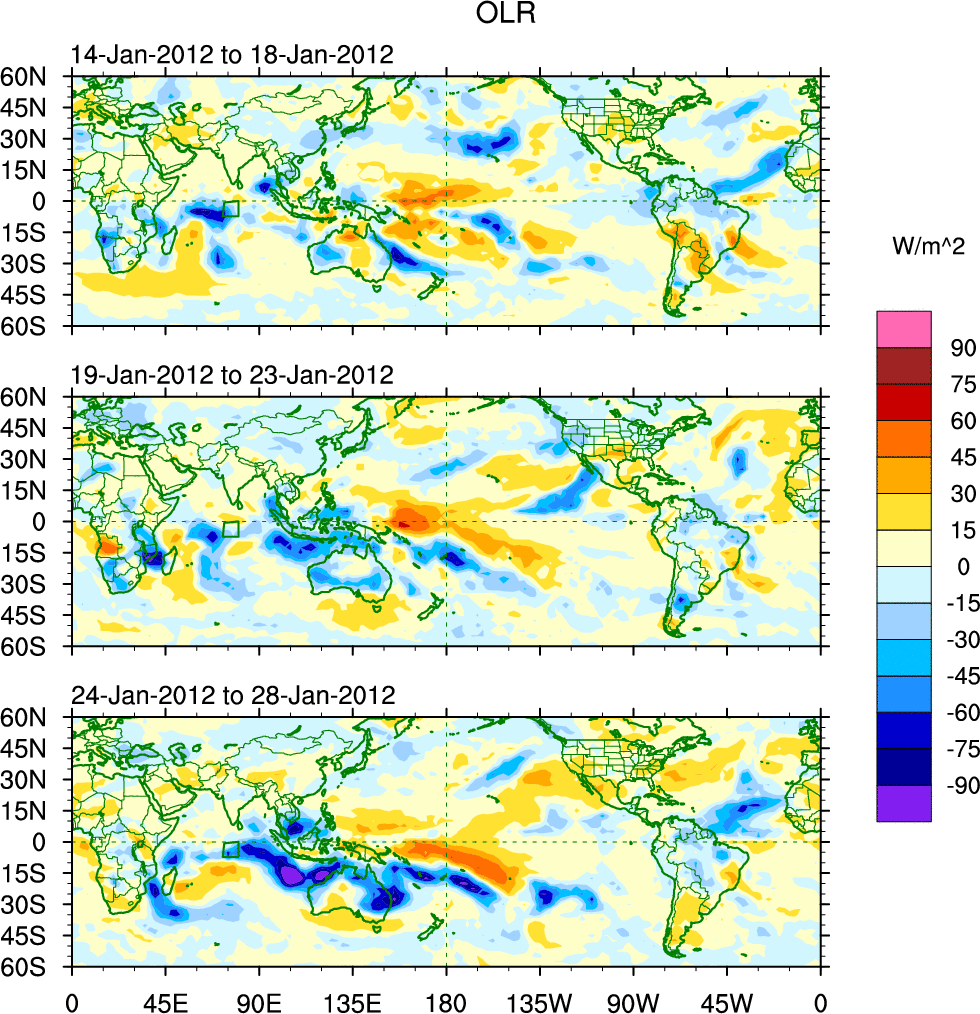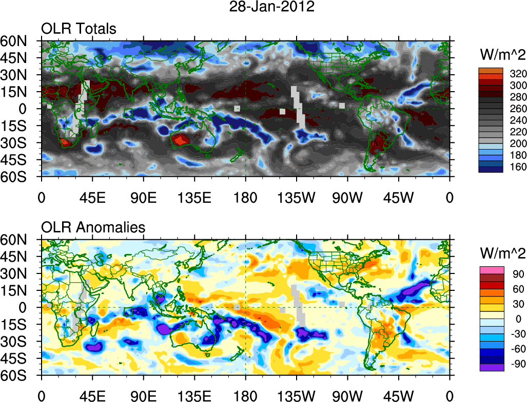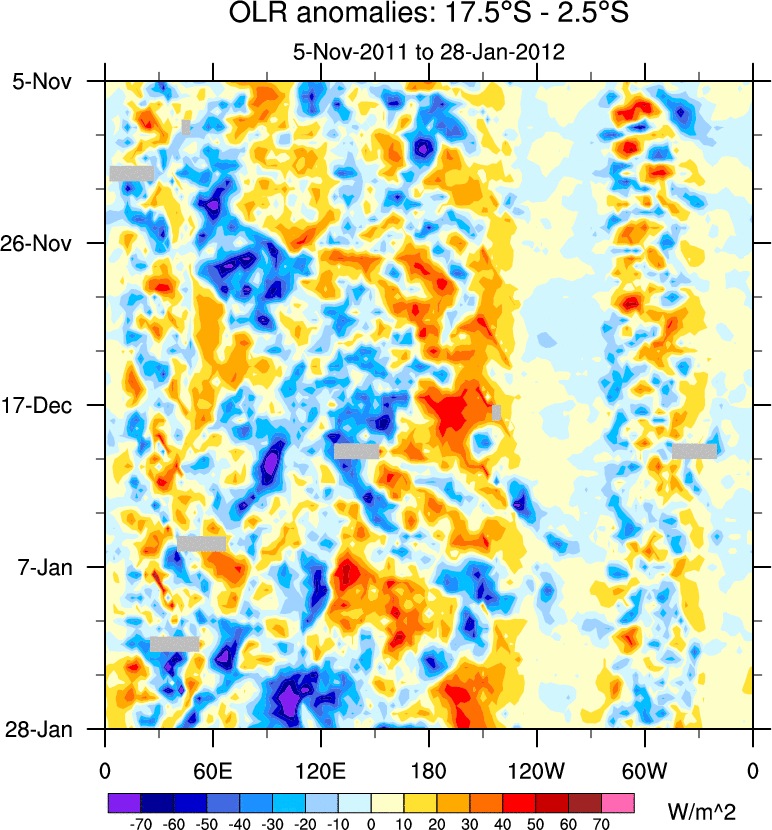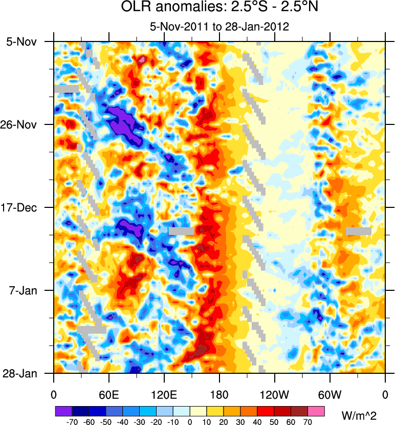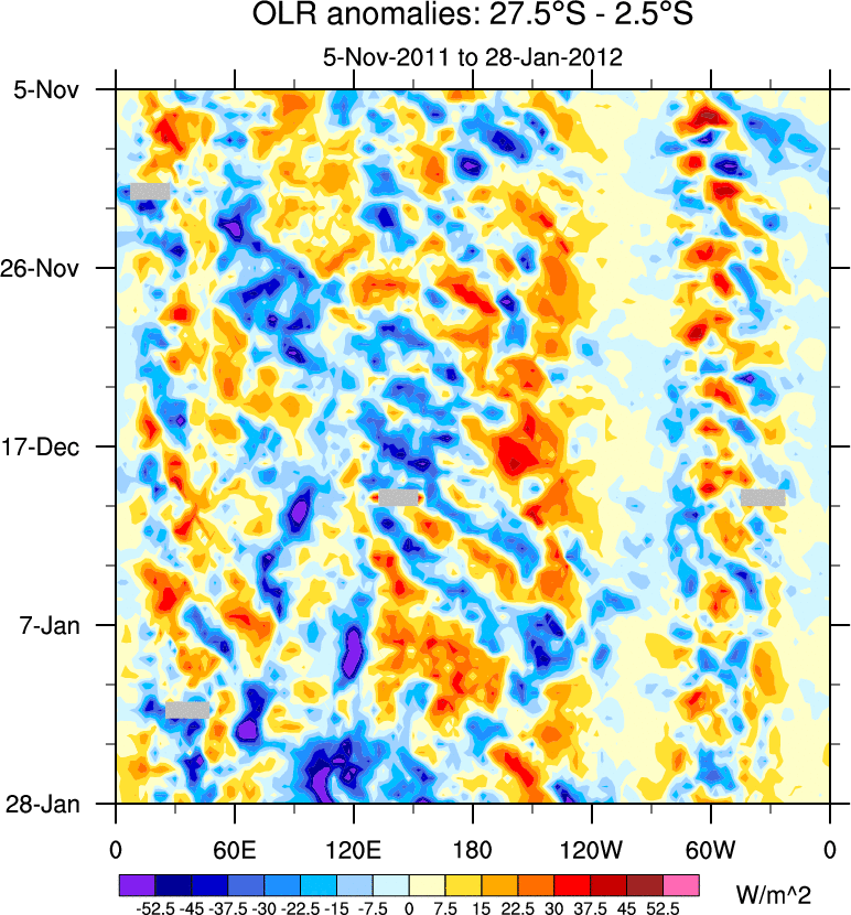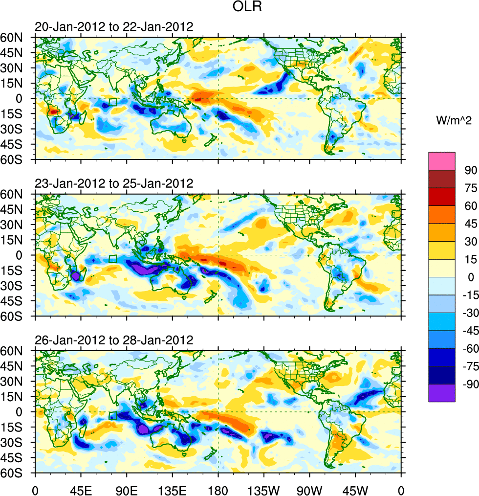 To identify tropical waves in near real-time, the OLR and UTWV data are filtered following Wheeler & Weickmann (2001 MWR). The daily anomalies are calculated using the first 3 harmonics of the seasonal cycle for 1979–2009. Missing values are then filled using linear interpolation in space and time. The most recent 365 days of anomalies are padded with 659 days of zeroes, and the result is filtered for each wave type.