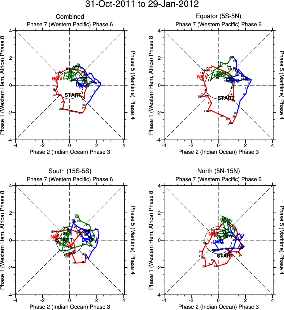 Wheeler and Hendon (2004) constructed the RMM index for monitoring the MJO. This index consists of the first two principal components (PCs) of OLR, 850-hPa zonal wind, and 200-hPa zonal wind averaged 15S-15N.