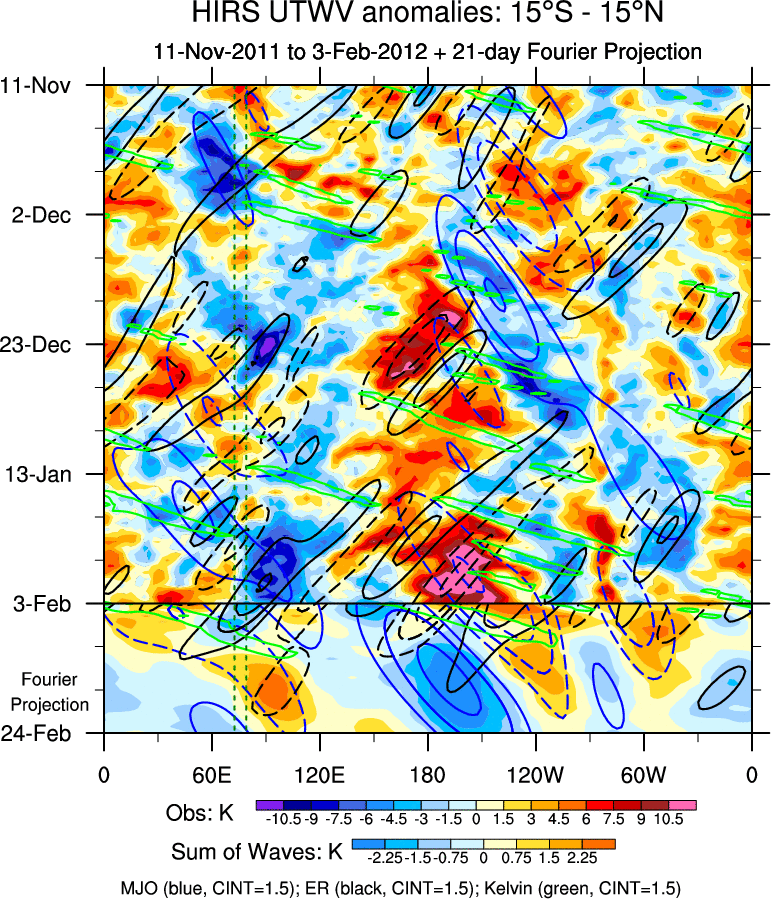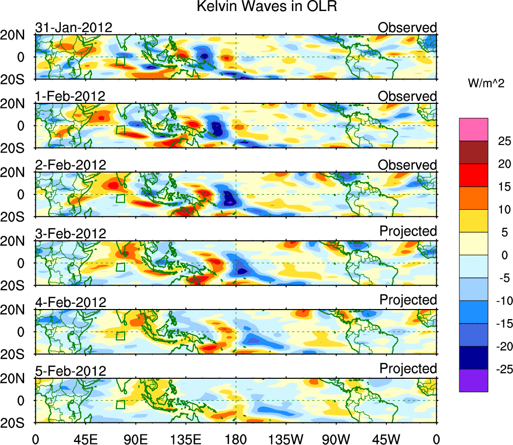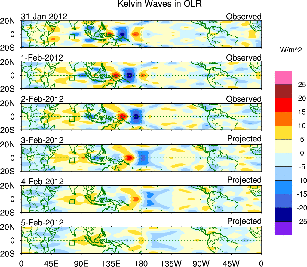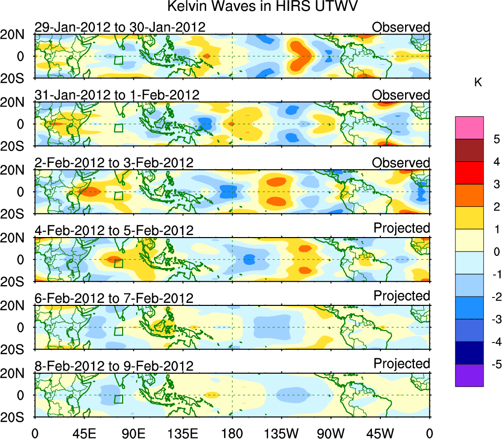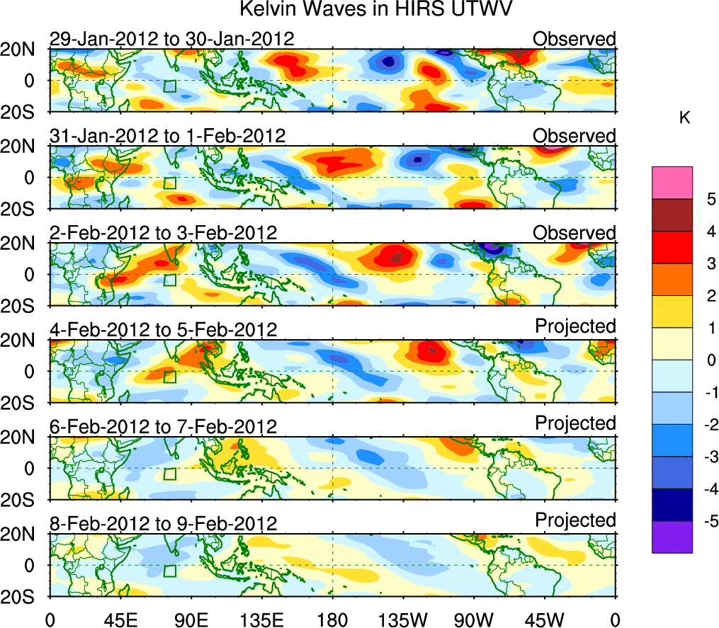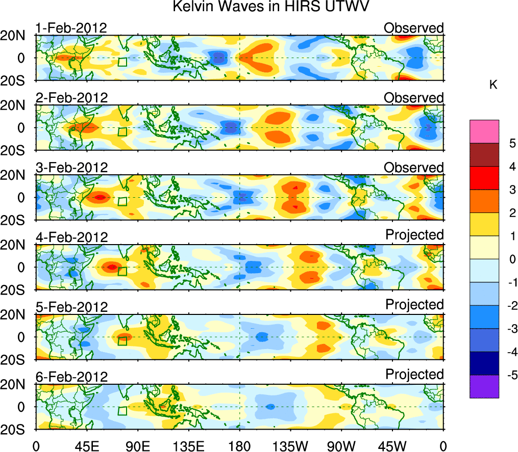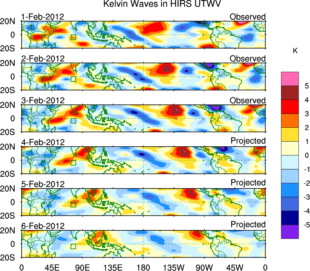 To identify tropical waves in near real-time, the OLR and UTWV data are filtered following Wheeler & Weickmann (2001 MWR). The daily anomalies are calculated using the first 3 harmonics of the seasonal cycle for 1979–2009. Missing values are then filled using linear interpolation in space and time. The most recent 365 days of anomalies are padded with 659 days of zeroes, and the result is filtered for each wave type.