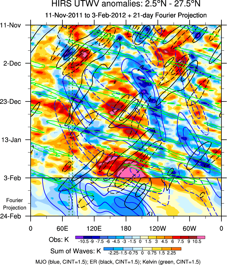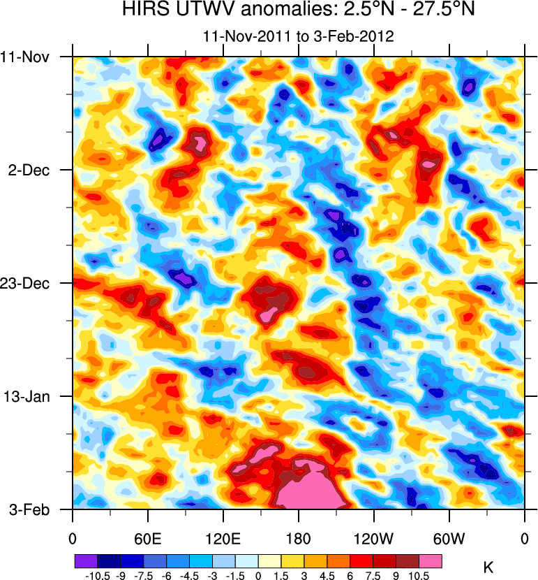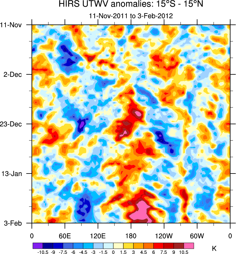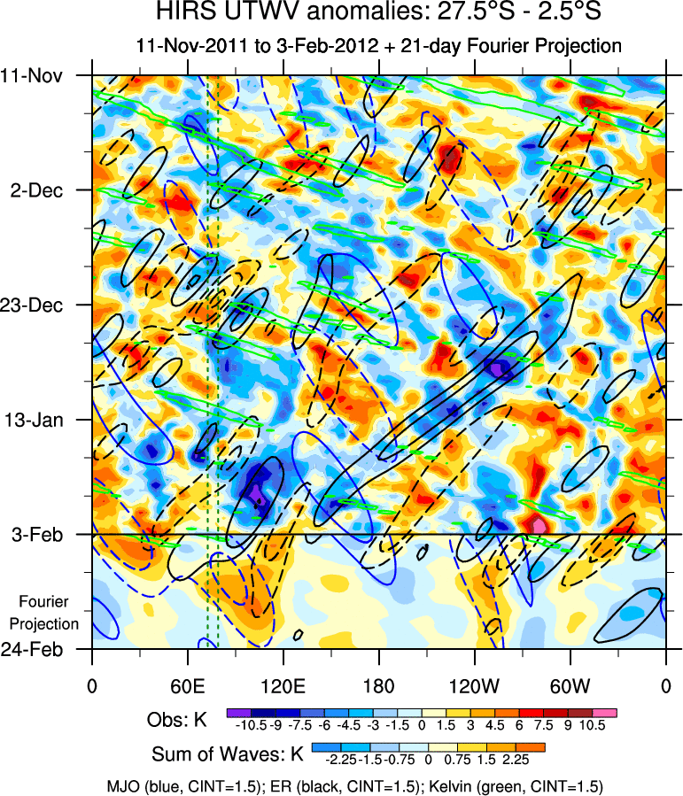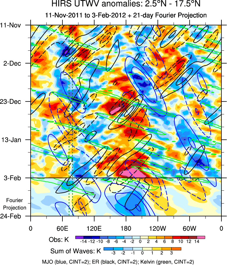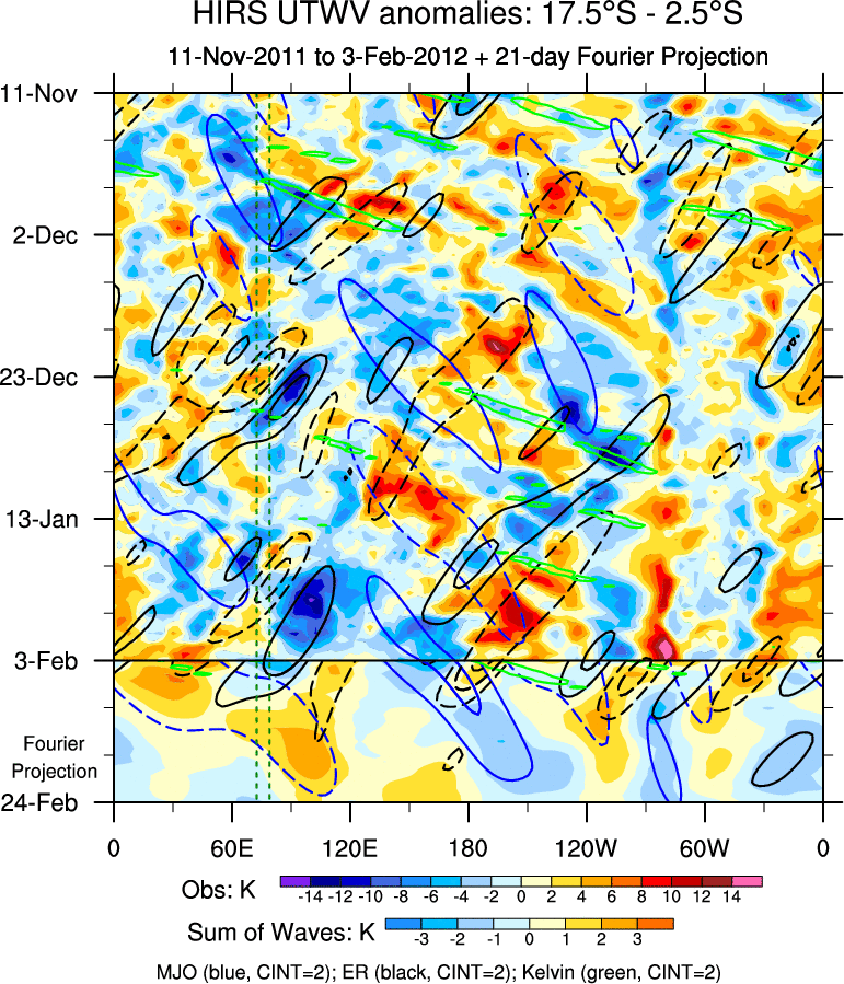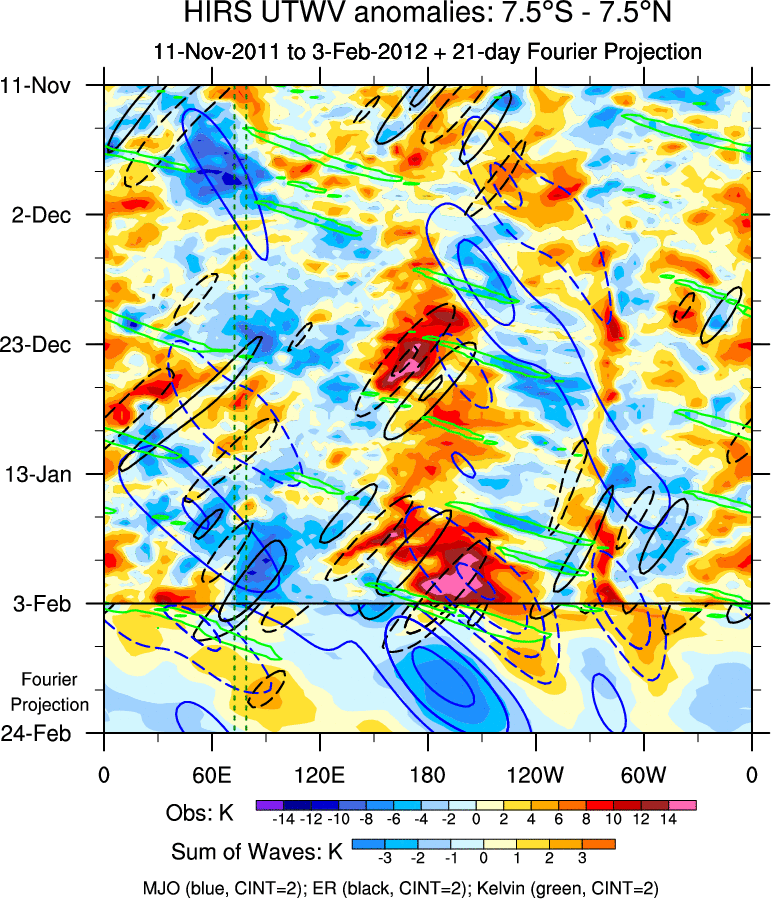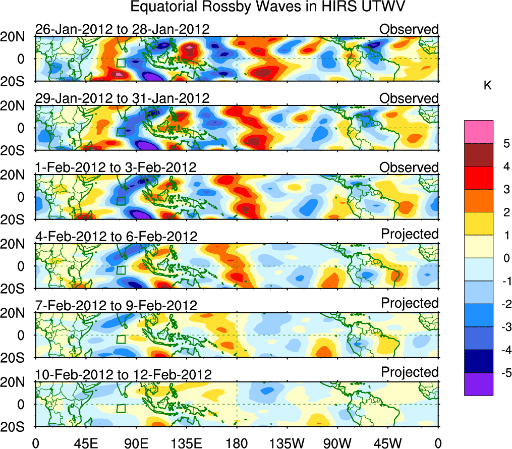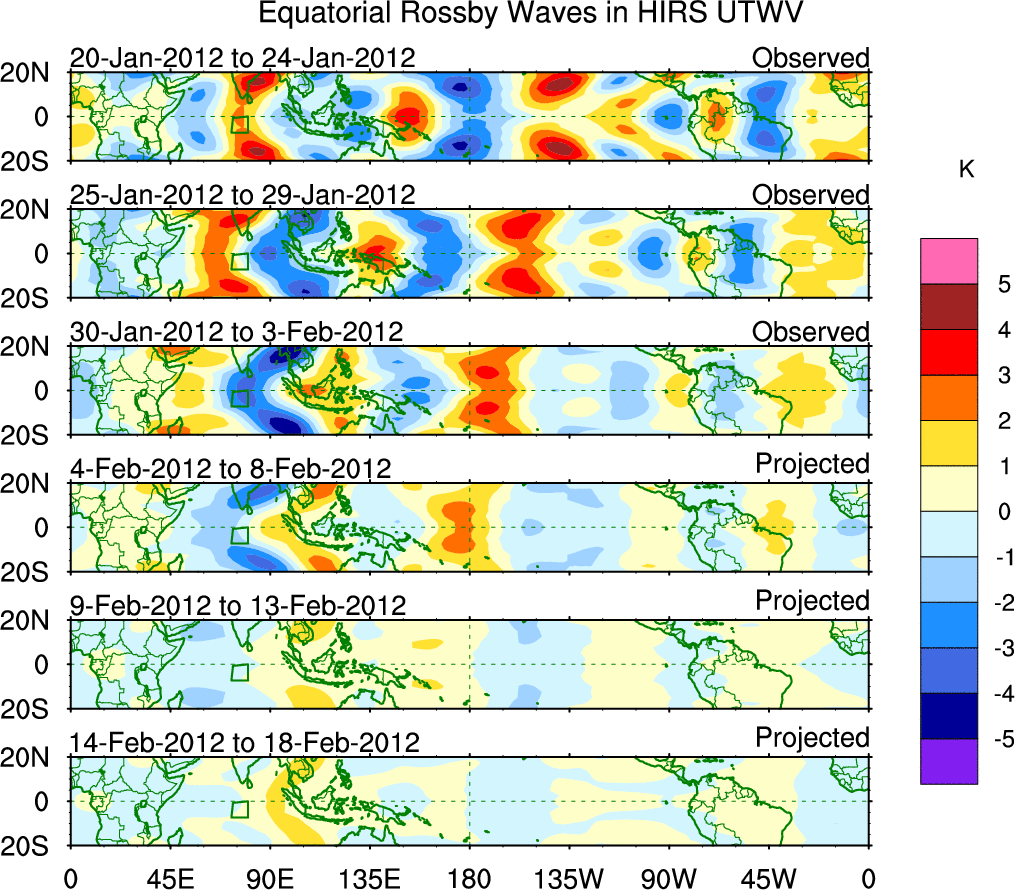 To identify tropical waves in near real-time, the OLR and UTWV data are filtered following Wheeler & Weickmann (2001 MWR). The daily anomalies are calculated using the first 3 harmonics of the seasonal cycle for 1979–2009. Missing values are then filled using linear interpolation in space and time. The most recent 365 days of anomalies are padded with 659 days of zeroes, and the result is filtered for each wave type.