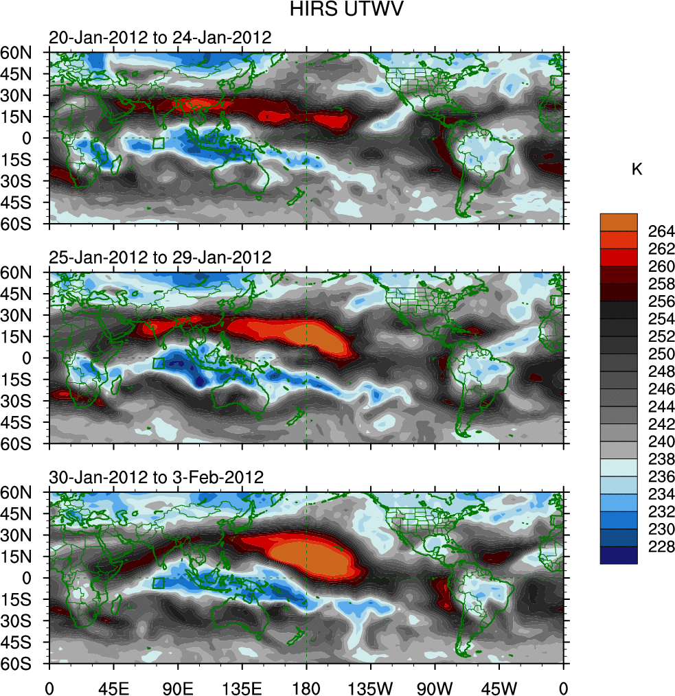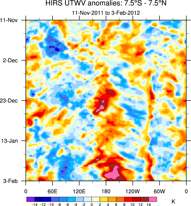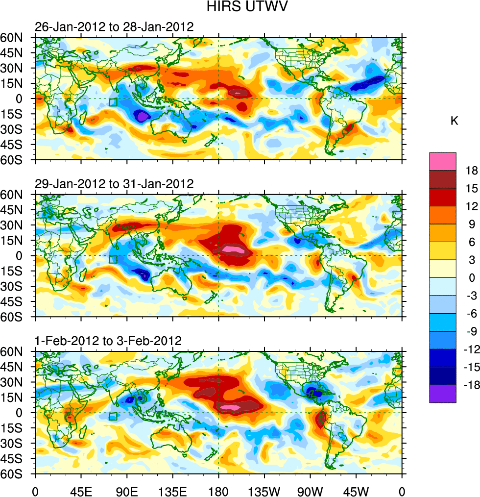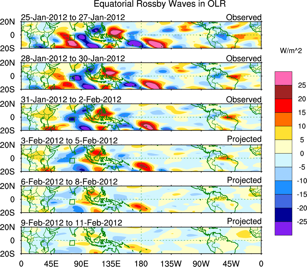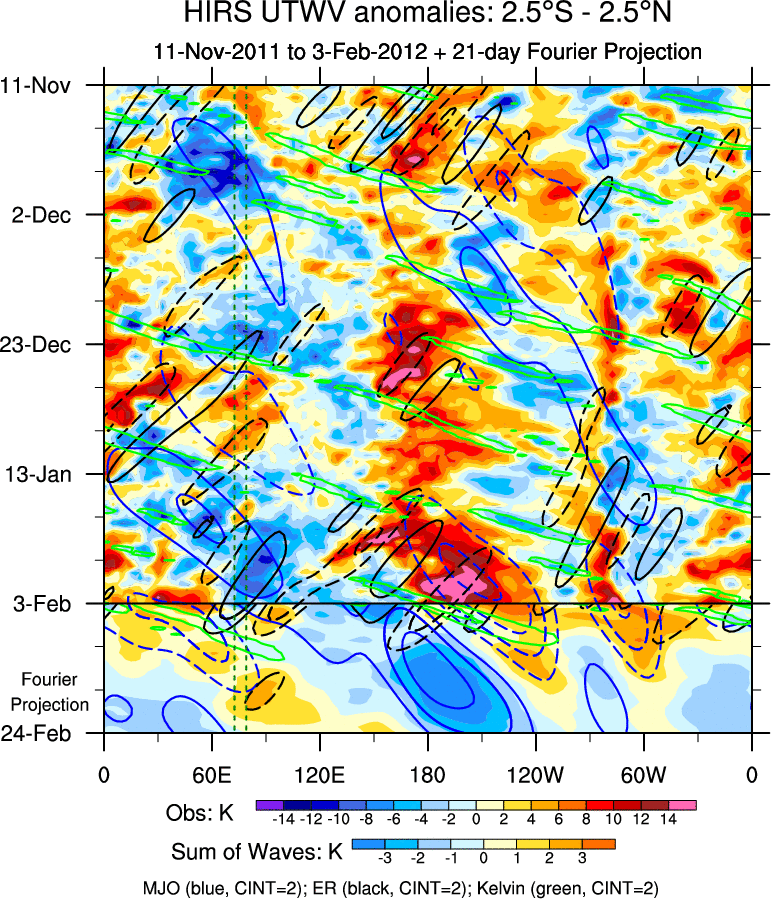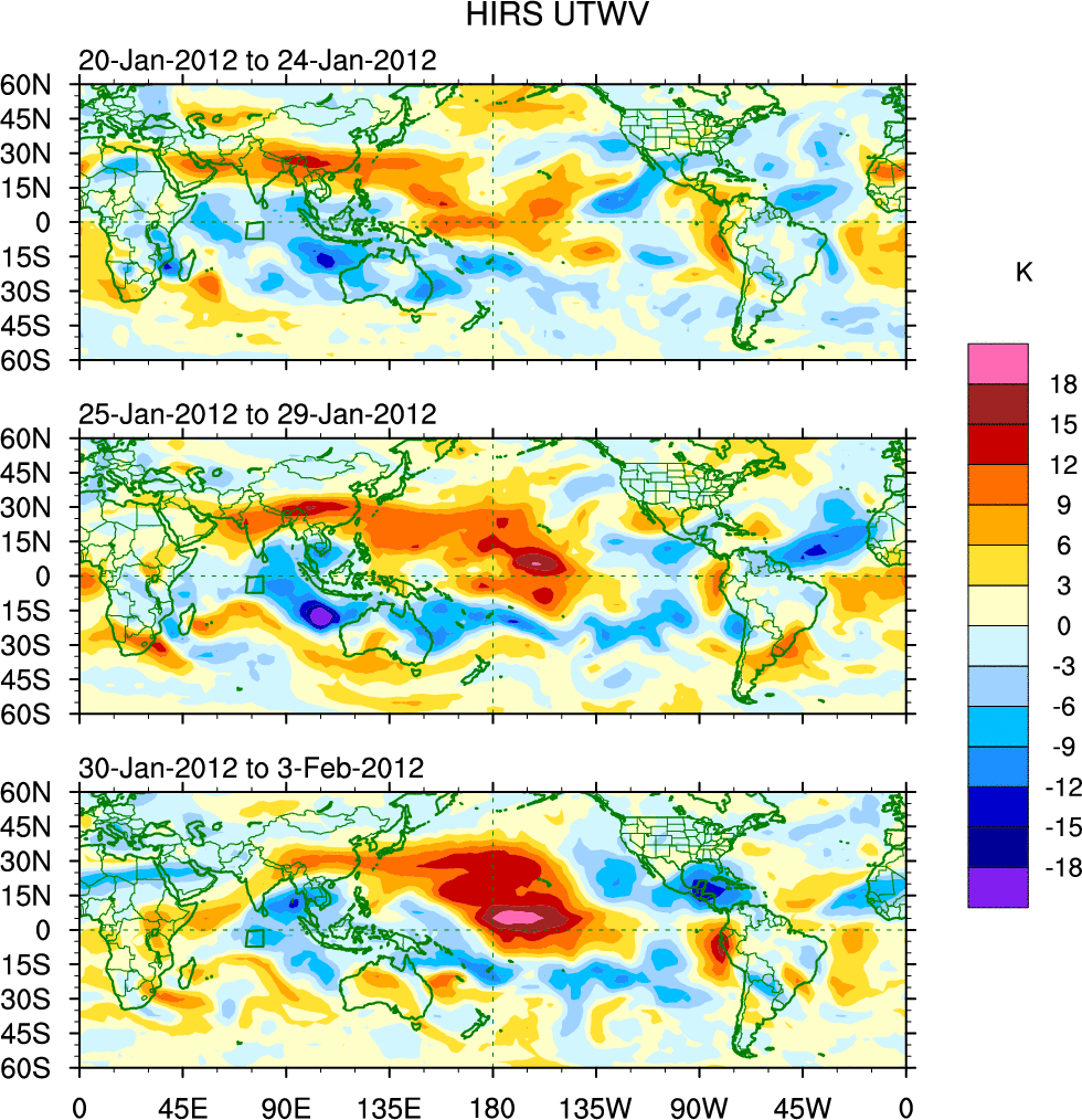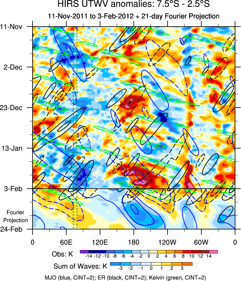 To identify tropical waves in near real-time, the OLR and UTWV data are filtered following Wheeler & Weickmann (2001 MWR). The daily anomalies are calculated using the first 3 harmonics of the seasonal cycle for 1979–2009. Missing values are then filled using linear interpolation in space and time. The most recent 365 days of anomalies are padded with 659 days of zeroes, and the result is filtered for each wave type.