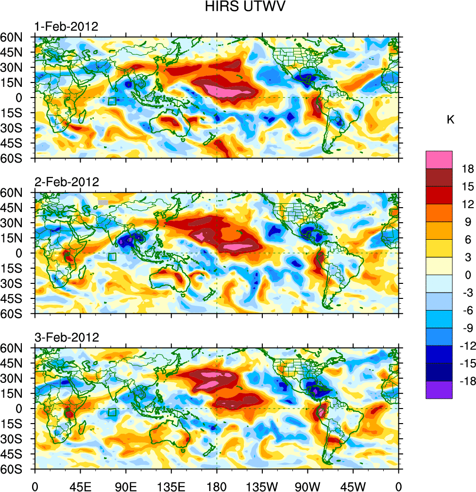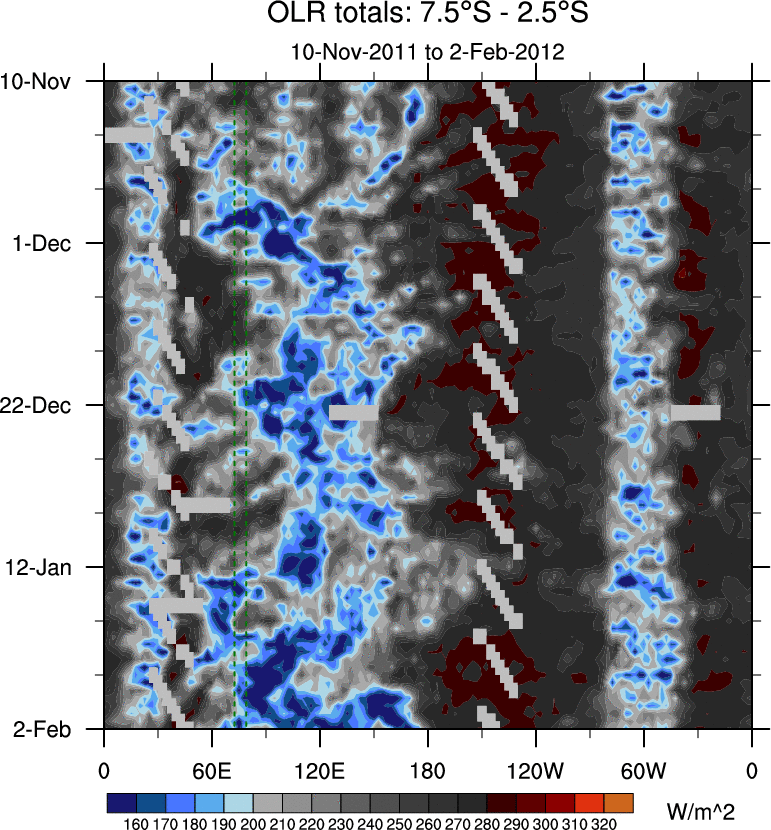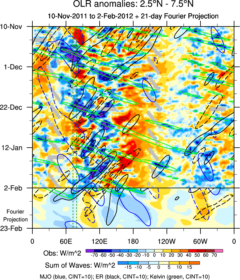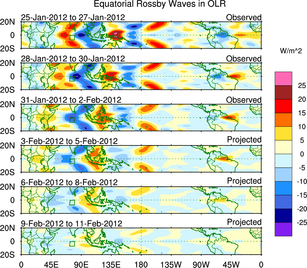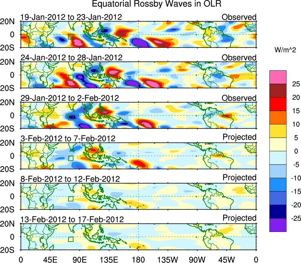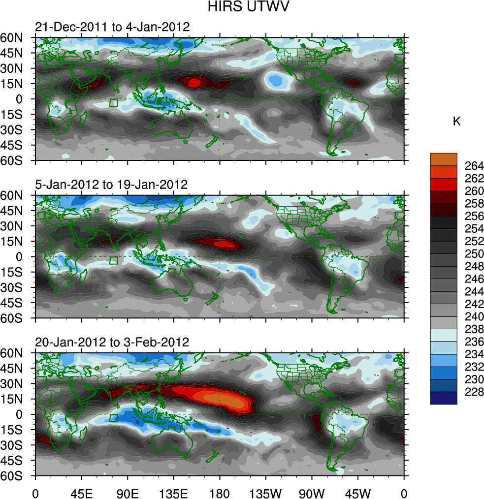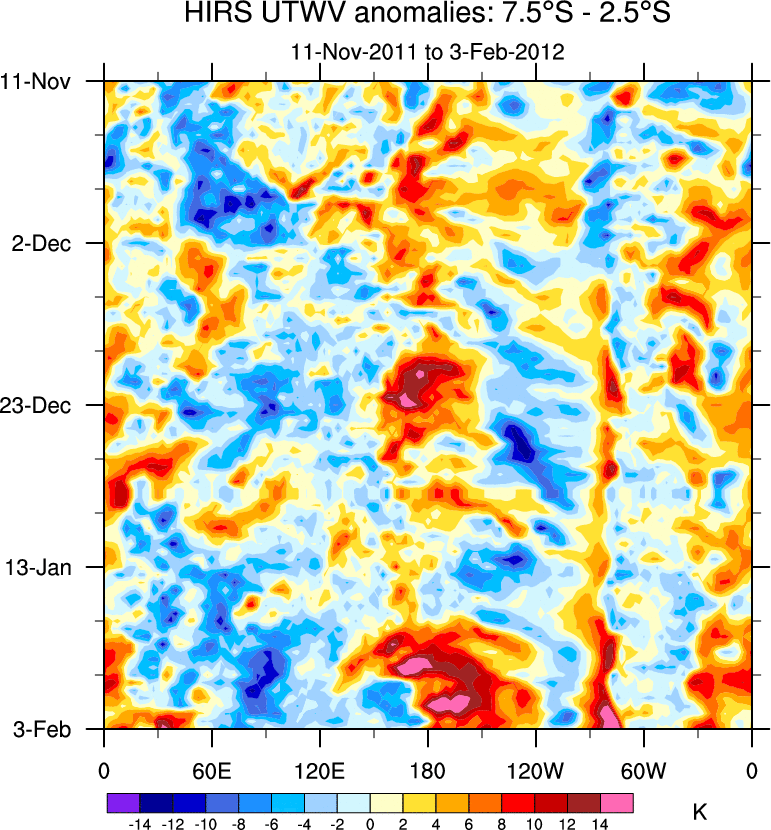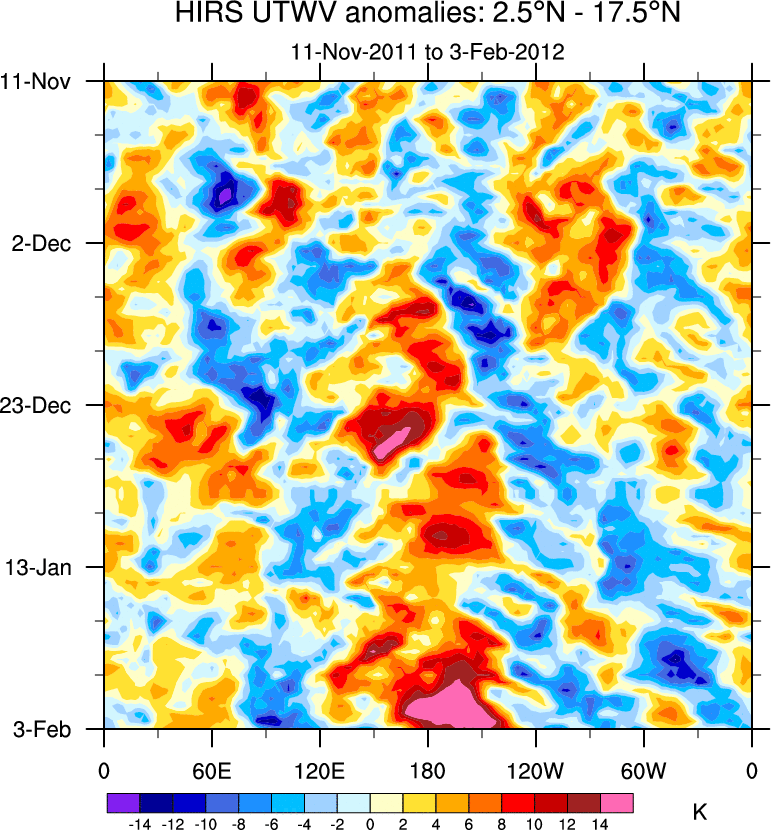 To identify tropical waves in near real-time, the OLR and UTWV data are filtered following Wheeler & Weickmann (2001 MWR). The daily anomalies are calculated using the first 3 harmonics of the seasonal cycle for 1979–2009. Missing values are then filled using linear interpolation in space and time. The most recent 365 days of anomalies are padded with 659 days of zeroes, and the result is filtered for each wave type.