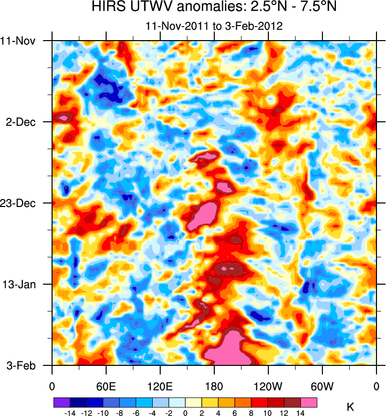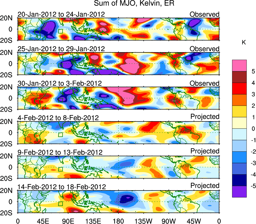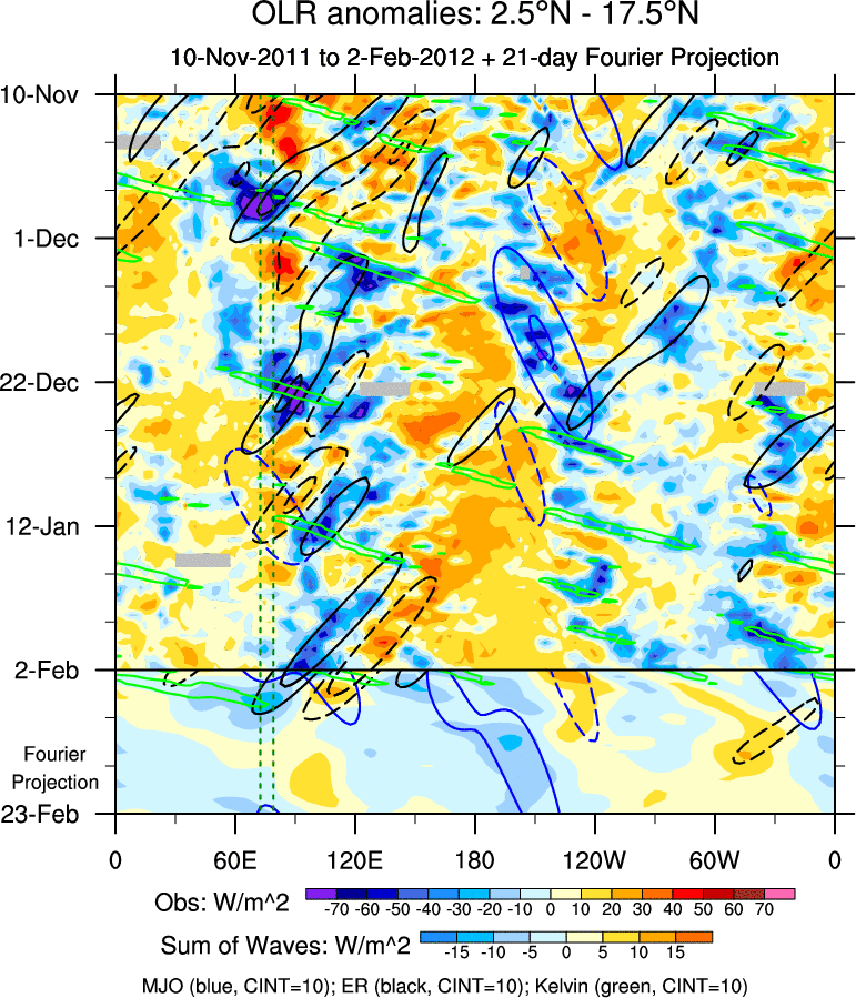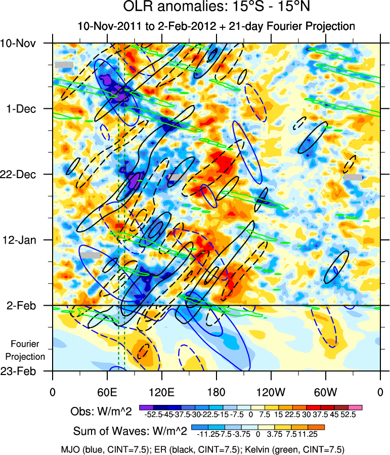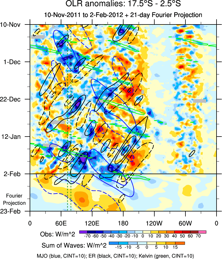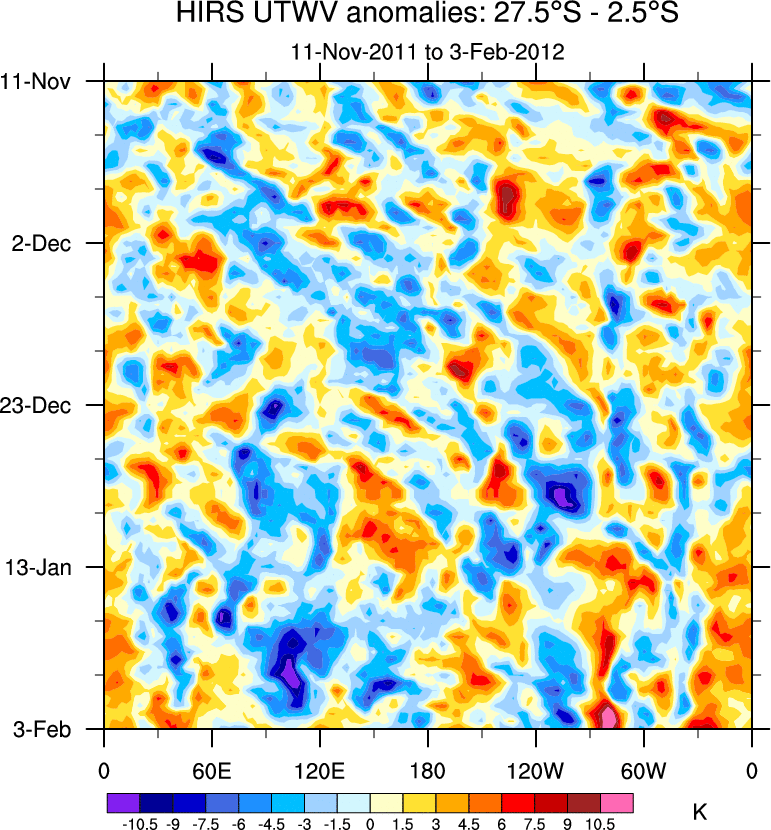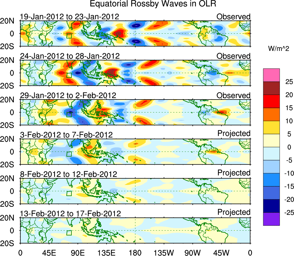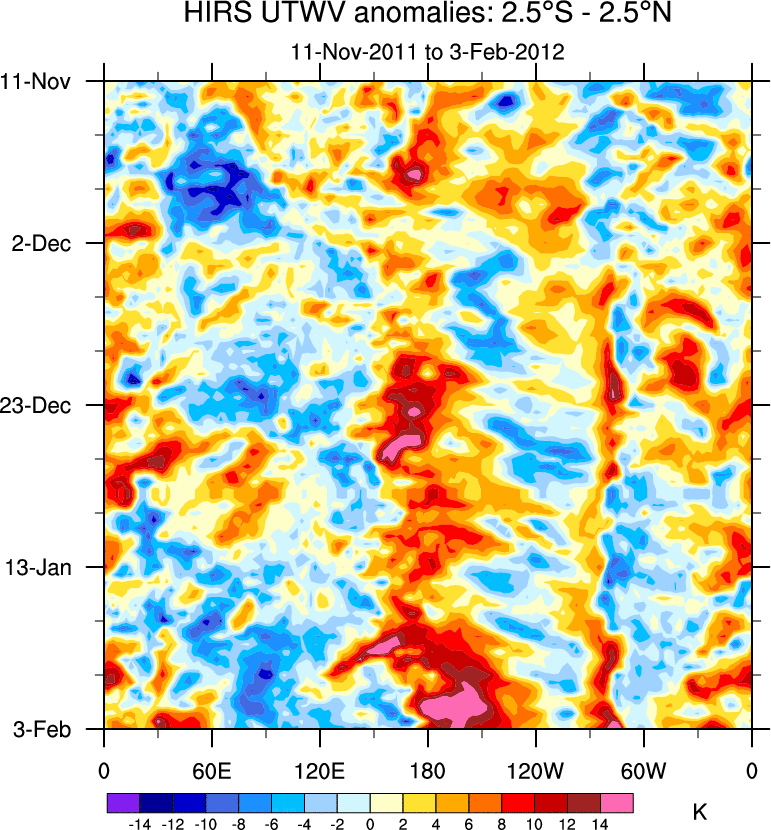 To identify tropical waves in near real-time, the OLR and UTWV data are filtered following Wheeler & Weickmann (2001 MWR). The daily anomalies are calculated using the first 3 harmonics of the seasonal cycle for 1979–2009. Missing values are then filled using linear interpolation in space and time. The most recent 365 days of anomalies are padded with 659 days of zeroes, and the result is filtered for each wave type.
