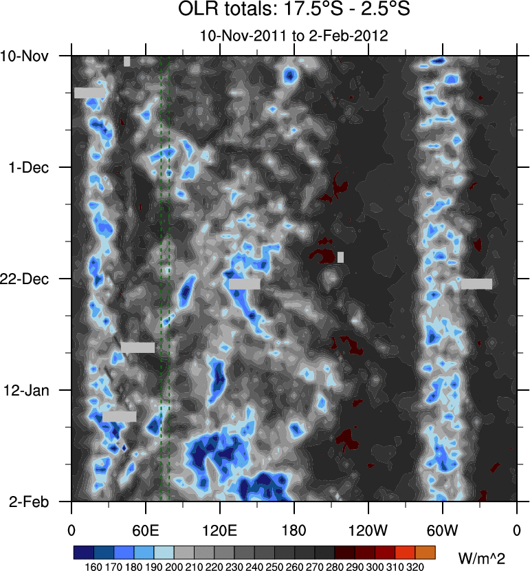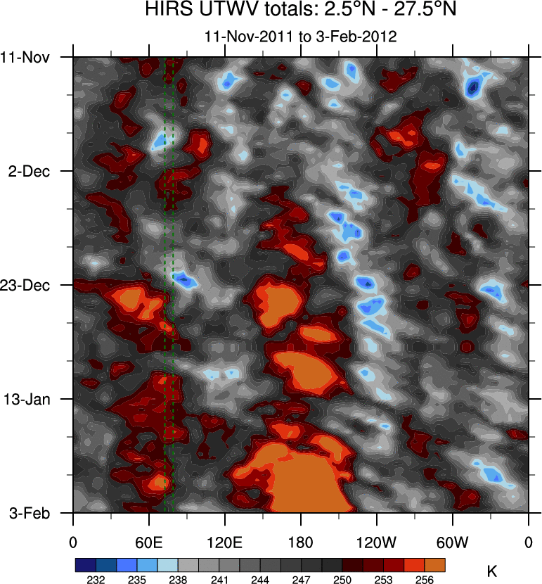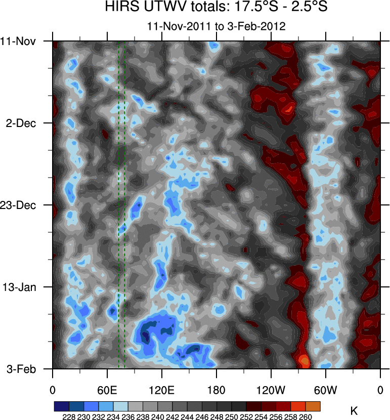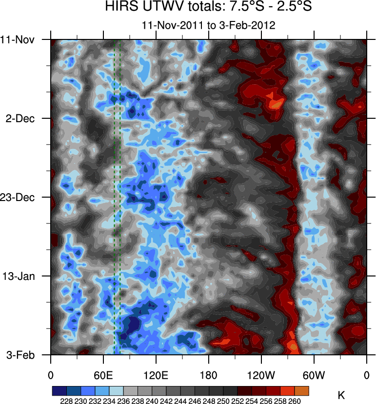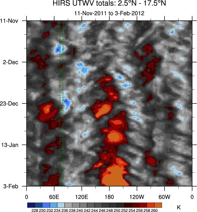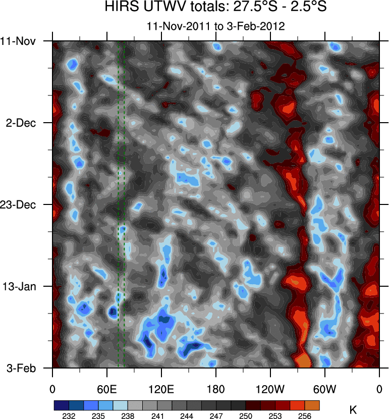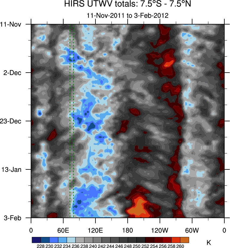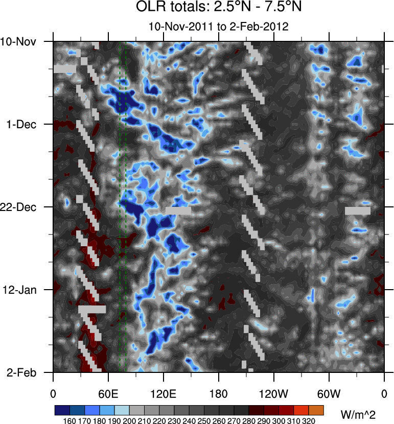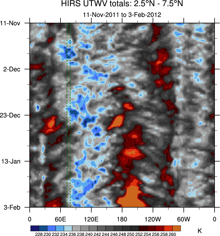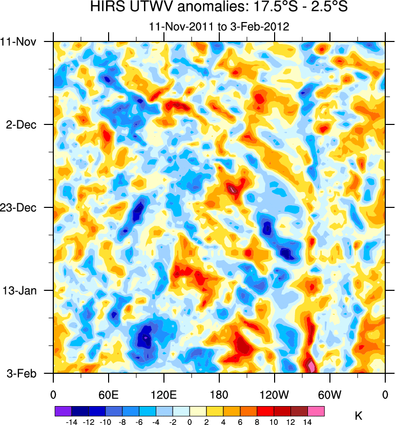 To identify tropical waves in near real-time, the OLR and UTWV data are filtered following Wheeler & Weickmann (2001 MWR). The daily anomalies are calculated using the first 3 harmonics of the seasonal cycle for 1979–2009. Missing values are then filled using linear interpolation in space and time. The most recent 365 days of anomalies are padded with 659 days of zeroes, and the result is filtered for each wave type.