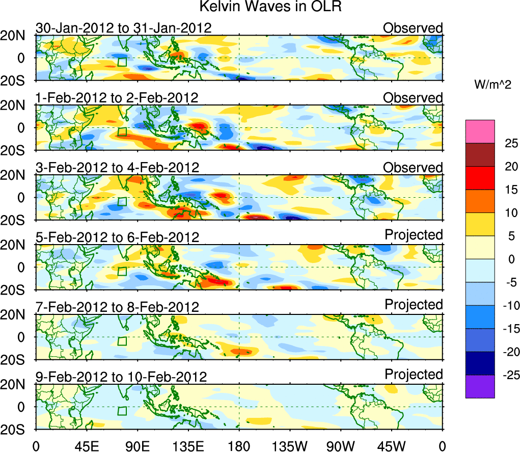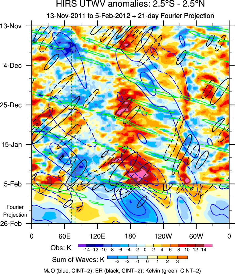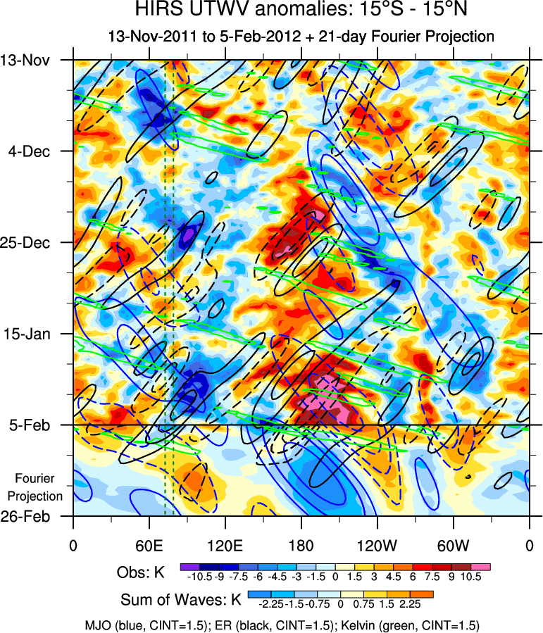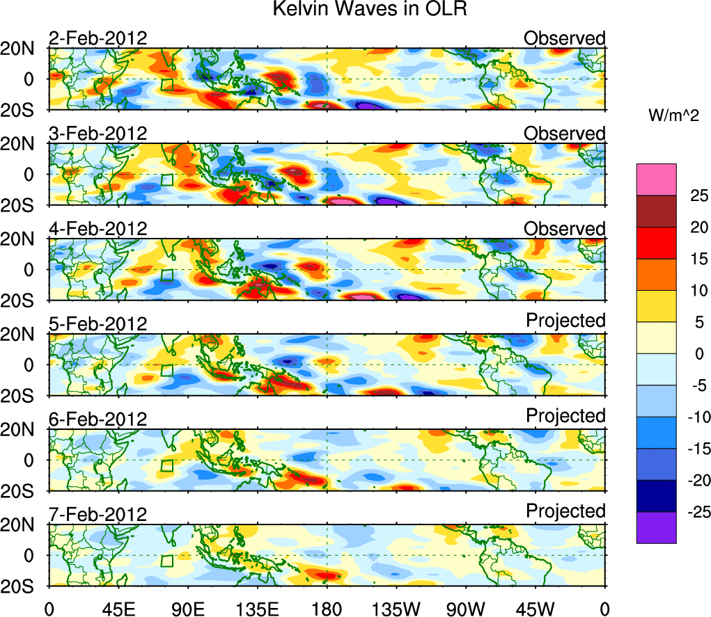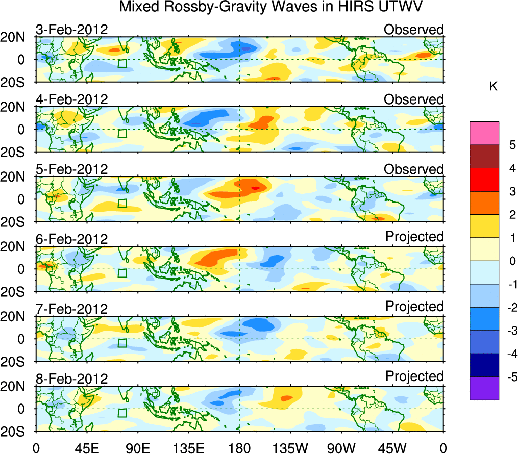 To identify tropical waves in near real-time, the OLR and UTWV data are filtered following Wheeler & Weickmann (2001 MWR). The daily anomalies are calculated using the first 3 harmonics of the seasonal cycle for 1979–2009. Missing values are then filled using linear interpolation in space and time. The most recent 365 days of anomalies are padded with 659 days of zeroes, and the result is filtered for each wave type.