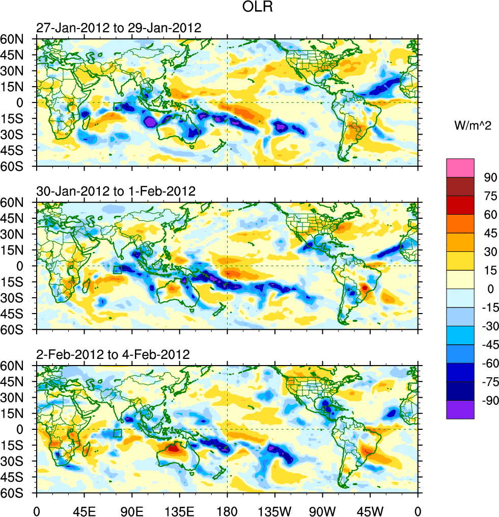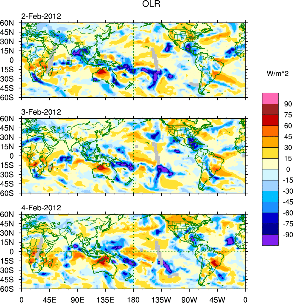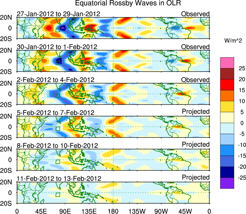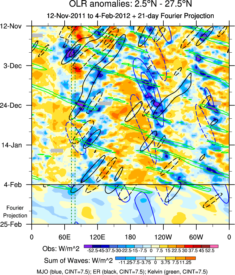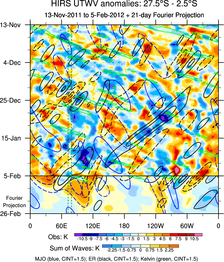 To identify tropical waves in near real-time, the OLR and UTWV data are filtered following Wheeler & Weickmann (2001 MWR). The daily anomalies are calculated using the first 3 harmonics of the seasonal cycle for 1979–2009. Missing values are then filled using linear interpolation in space and time. The most recent 365 days of anomalies are padded with 659 days of zeroes, and the result is filtered for each wave type.