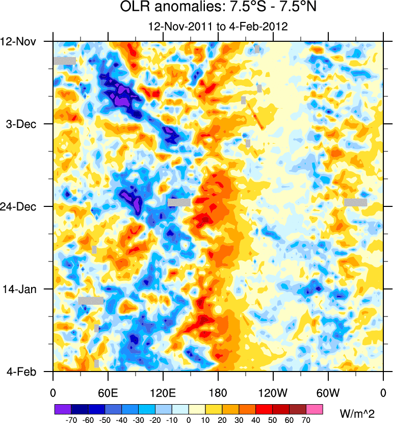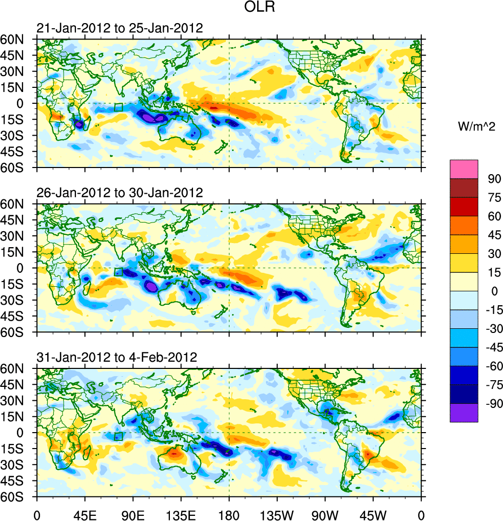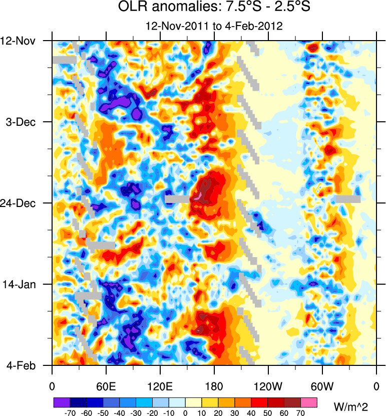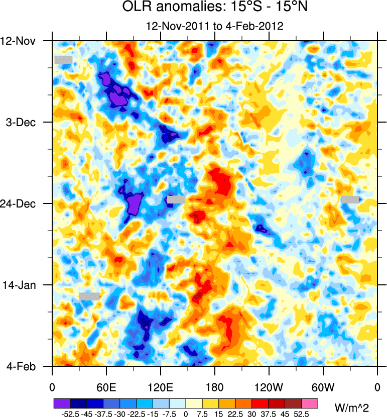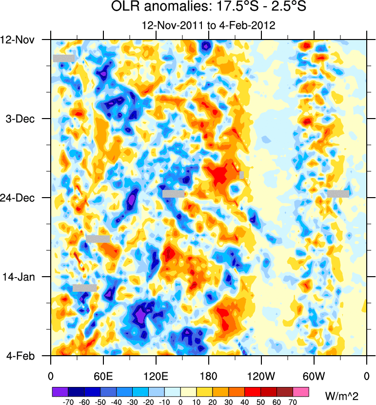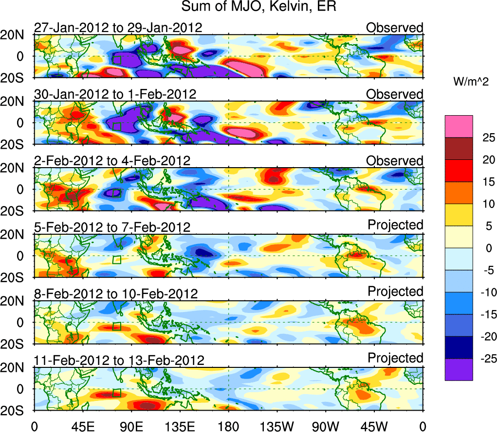 To identify tropical waves in near real-time, the OLR and UTWV data are filtered following Wheeler & Weickmann (2001 MWR). The daily anomalies are calculated using the first 3 harmonics of the seasonal cycle for 1979–2009. Missing values are then filled using linear interpolation in space and time. The most recent 365 days of anomalies are padded with 659 days of zeroes, and the result is filtered for each wave type.