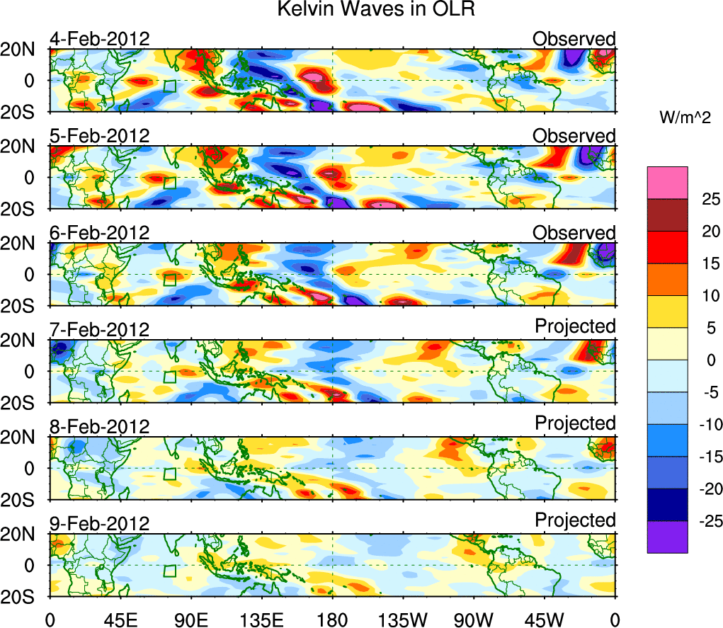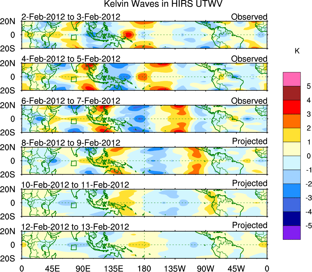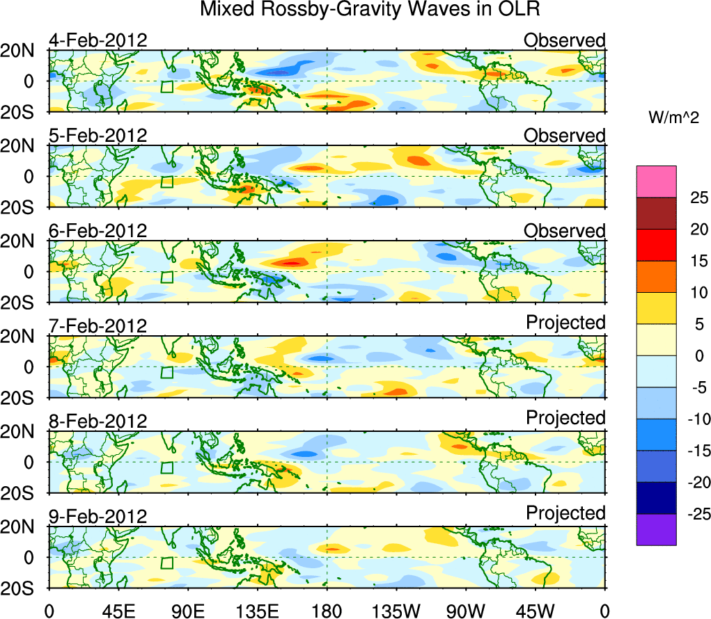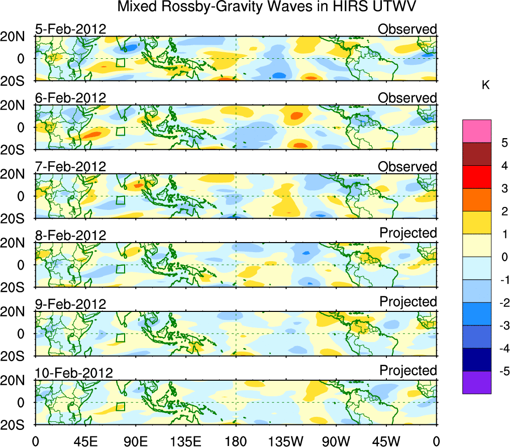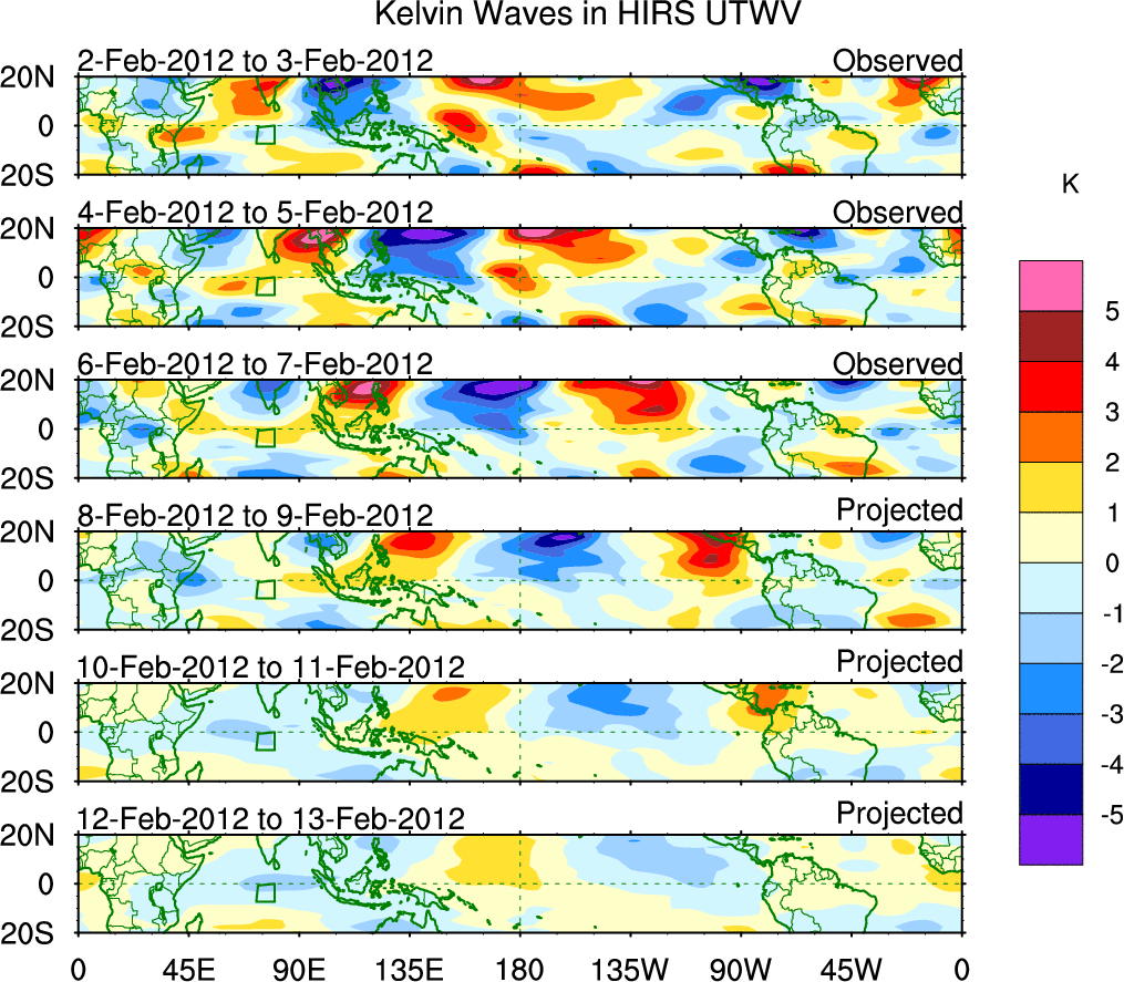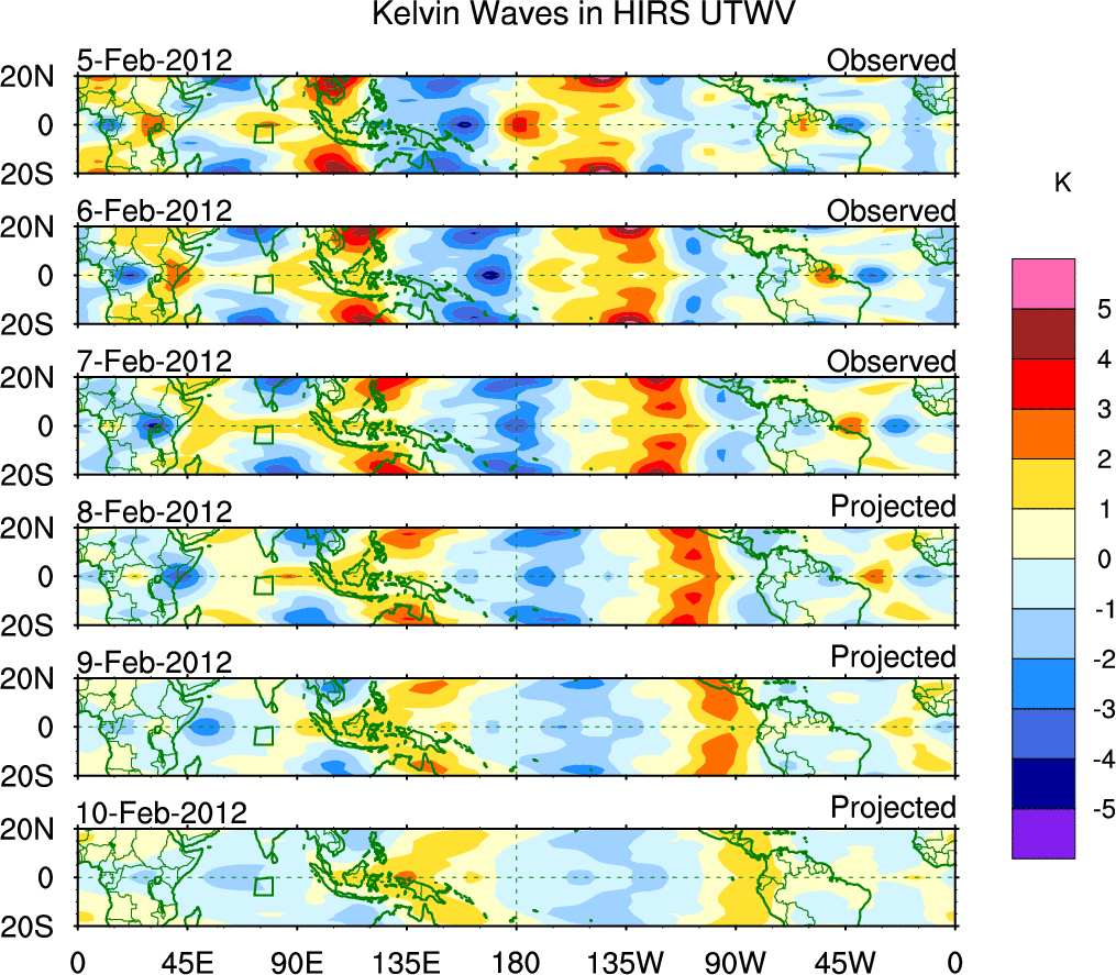 To identify tropical waves in near real-time, the OLR and UTWV data are filtered following Wheeler & Weickmann (2001 MWR). The daily anomalies are calculated using the first 3 harmonics of the seasonal cycle for 1979–2009. Missing values are then filled using linear interpolation in space and time. The most recent 365 days of anomalies are padded with 659 days of zeroes, and the result is filtered for each wave type.