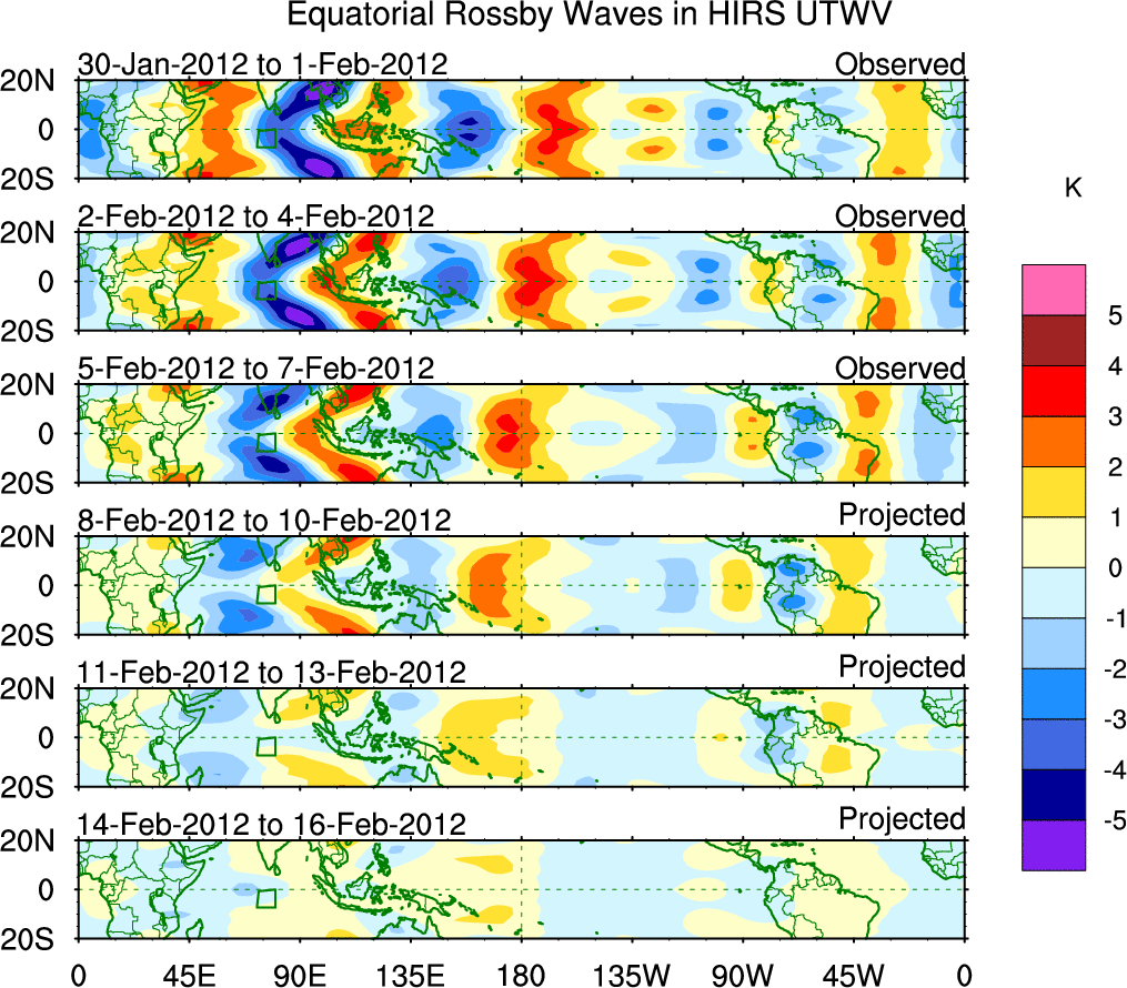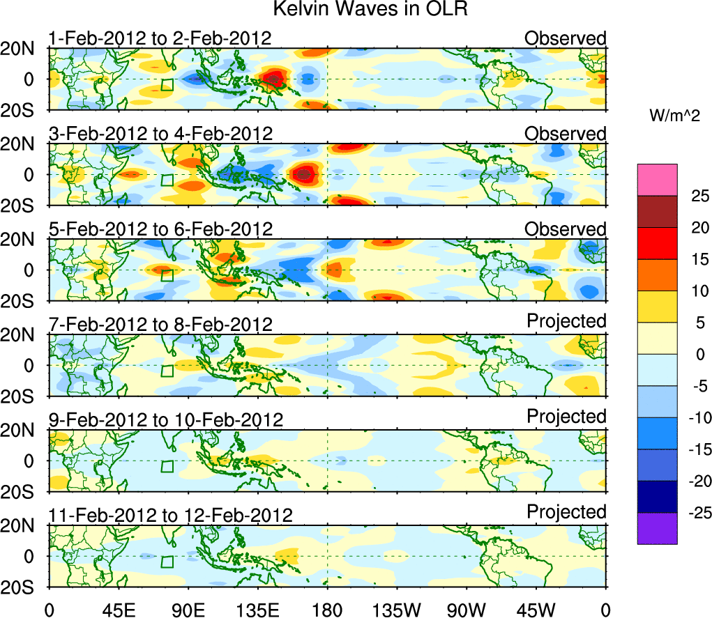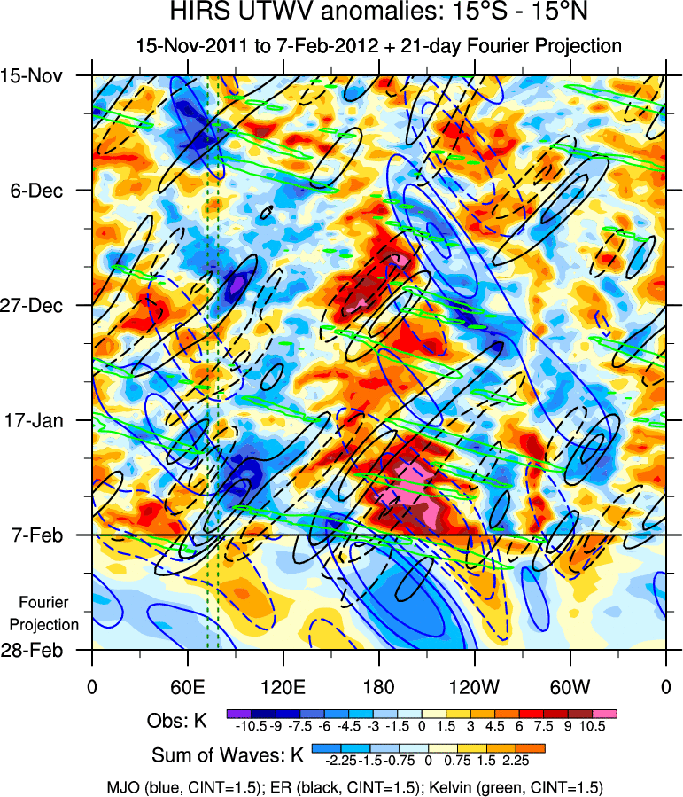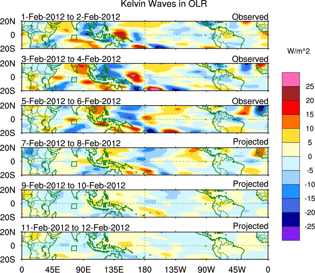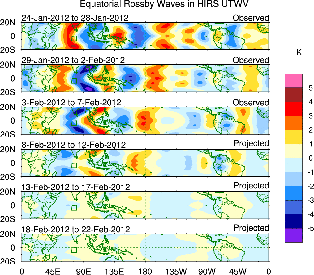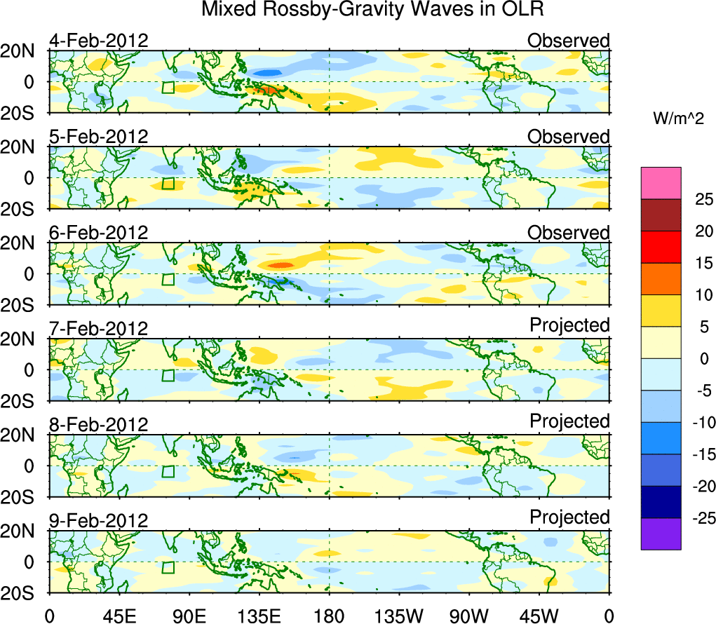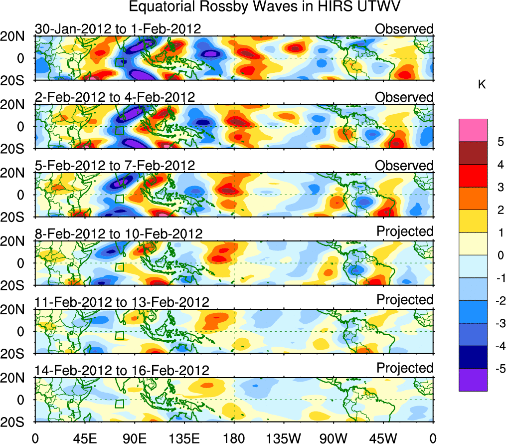 To identify tropical waves in near real-time, the OLR and UTWV data are filtered following Wheeler & Weickmann (2001 MWR). The daily anomalies are calculated using the first 3 harmonics of the seasonal cycle for 1979–2009. Missing values are then filled using linear interpolation in space and time. The most recent 365 days of anomalies are padded with 659 days of zeroes, and the result is filtered for each wave type.