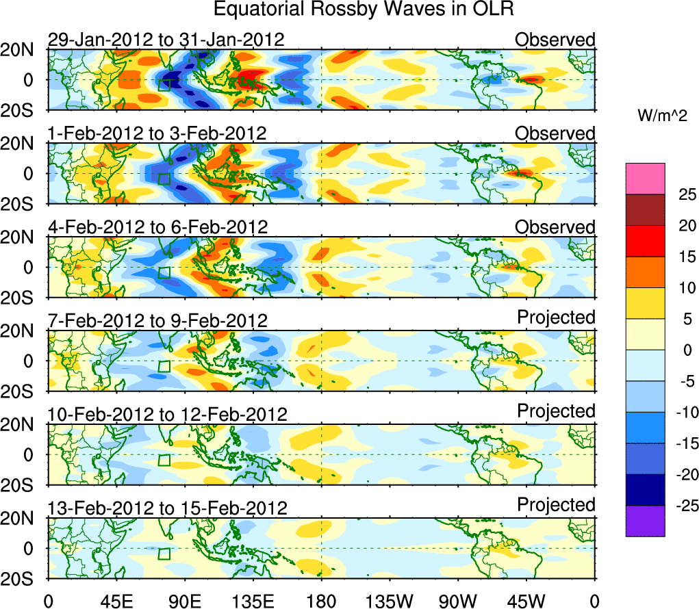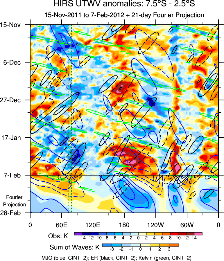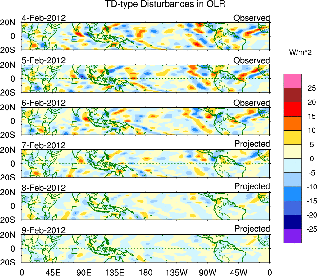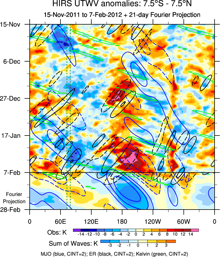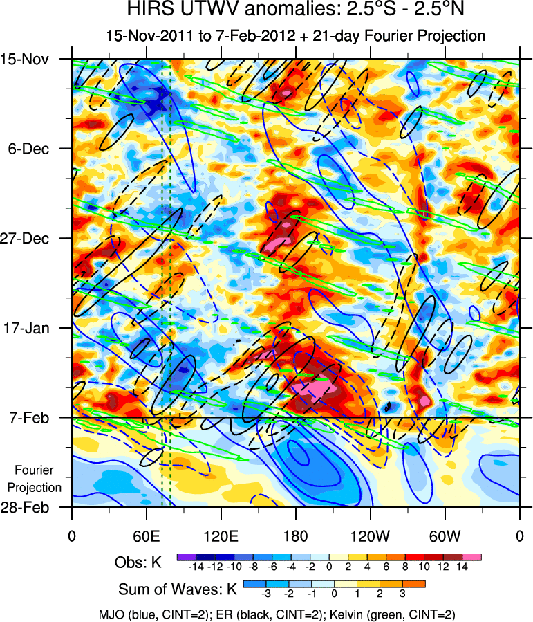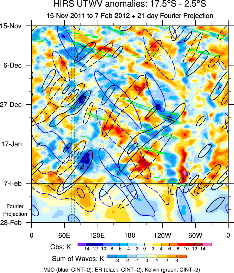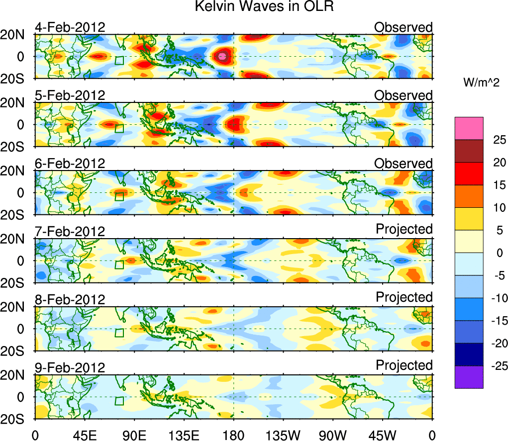 To identify tropical waves in near real-time, the OLR and UTWV data are filtered following Wheeler & Weickmann (2001 MWR). The daily anomalies are calculated using the first 3 harmonics of the seasonal cycle for 1979–2009. Missing values are then filled using linear interpolation in space and time. The most recent 365 days of anomalies are padded with 659 days of zeroes, and the result is filtered for each wave type.